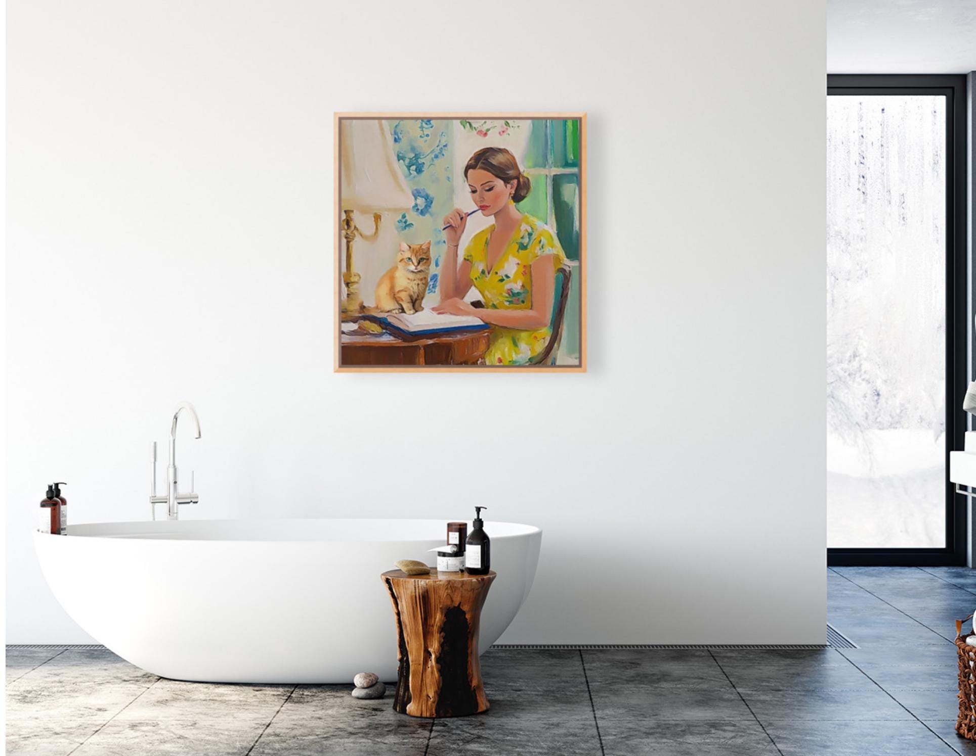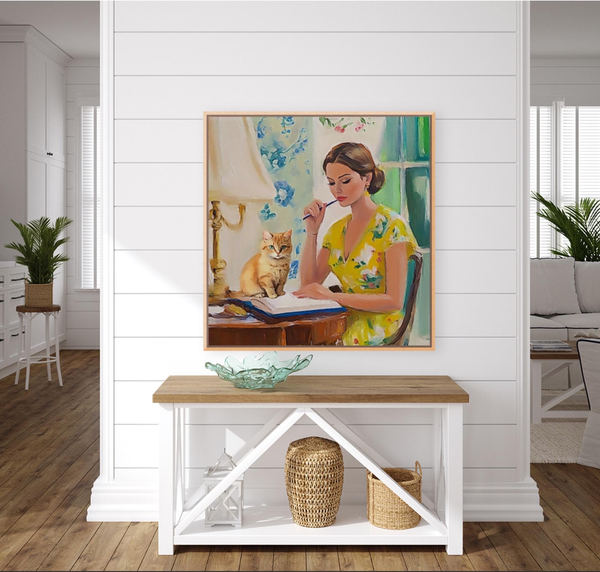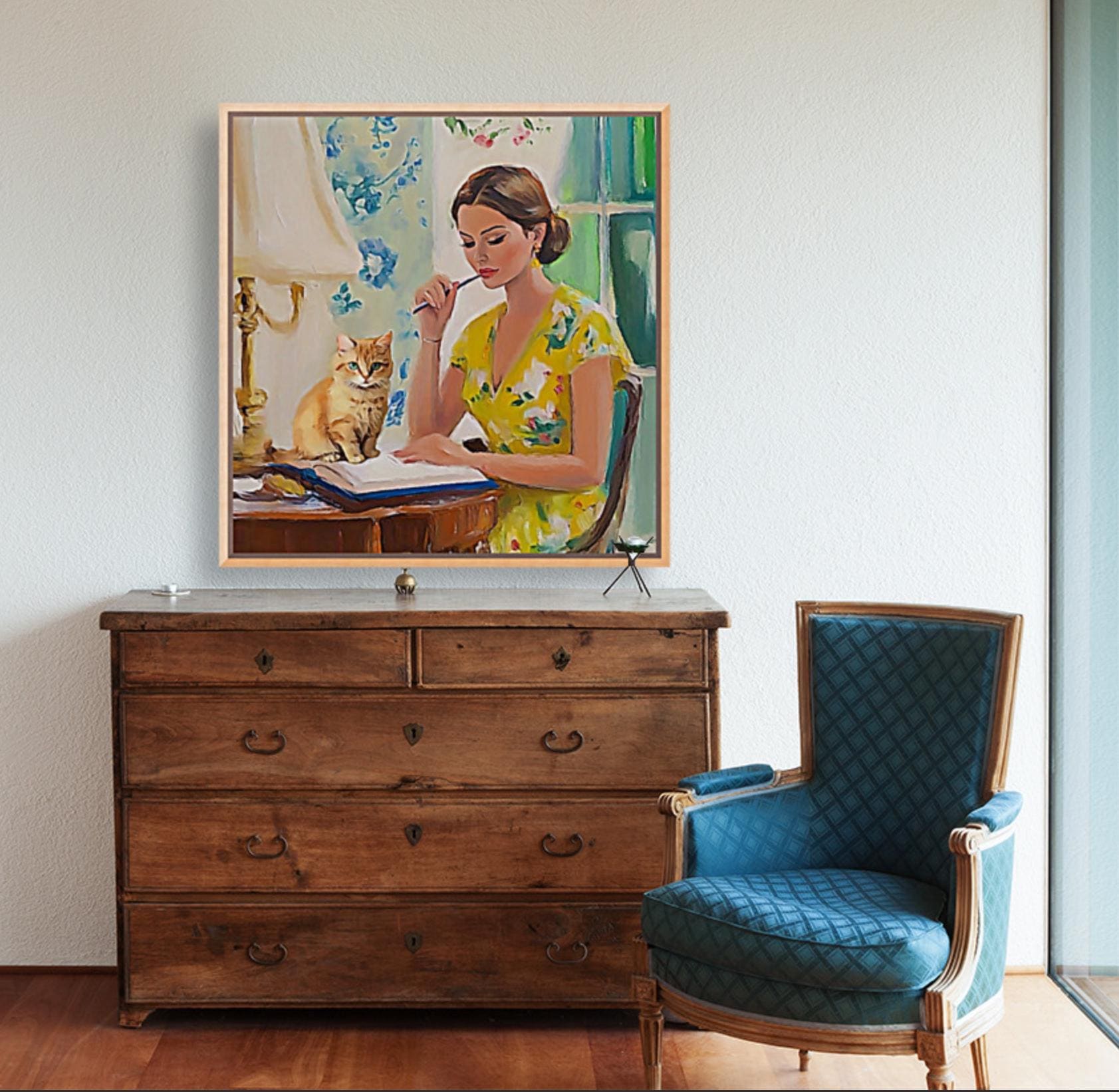 Grandmillennial art, Sitting pretty on mum’s book, whimsical cat art