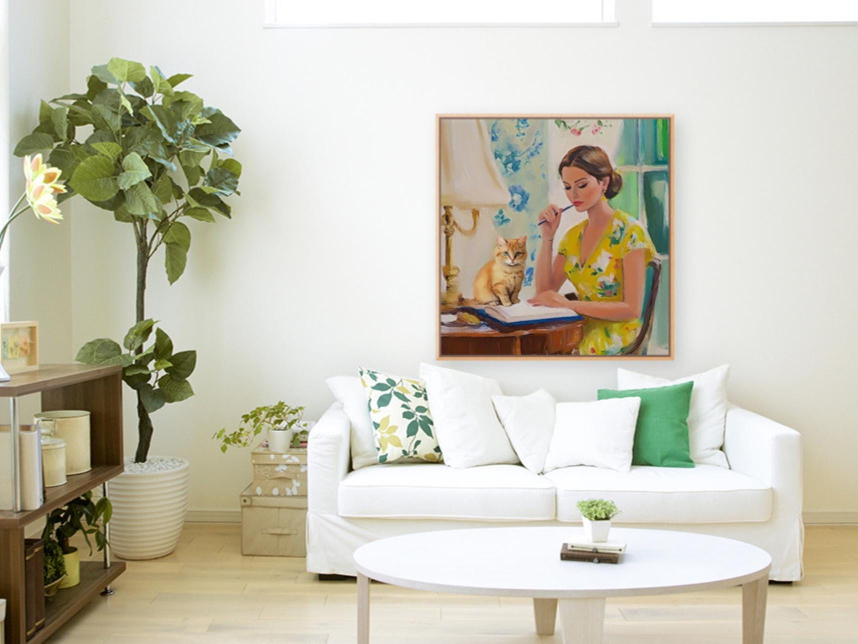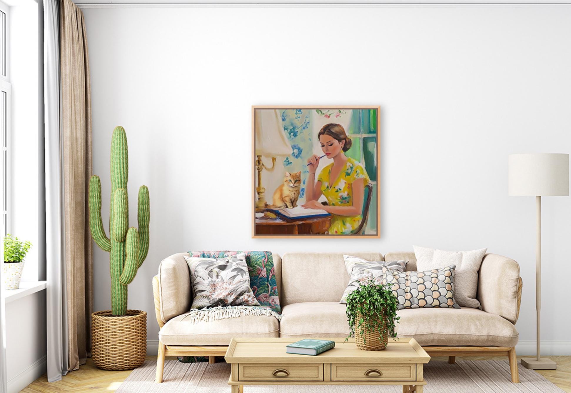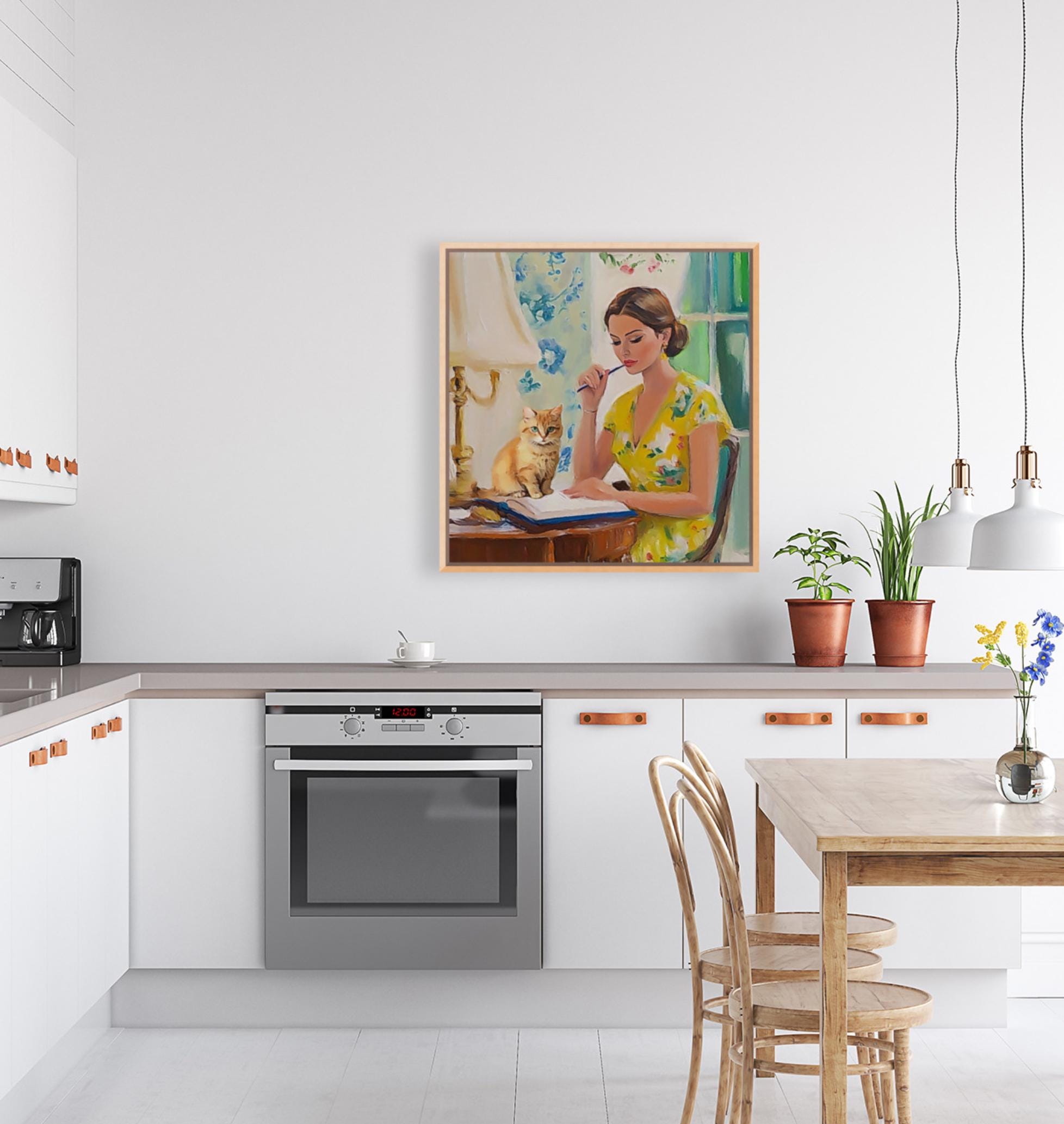 Grandmillennial art, Sitting pretty on mum’s book, whimsical cat art
