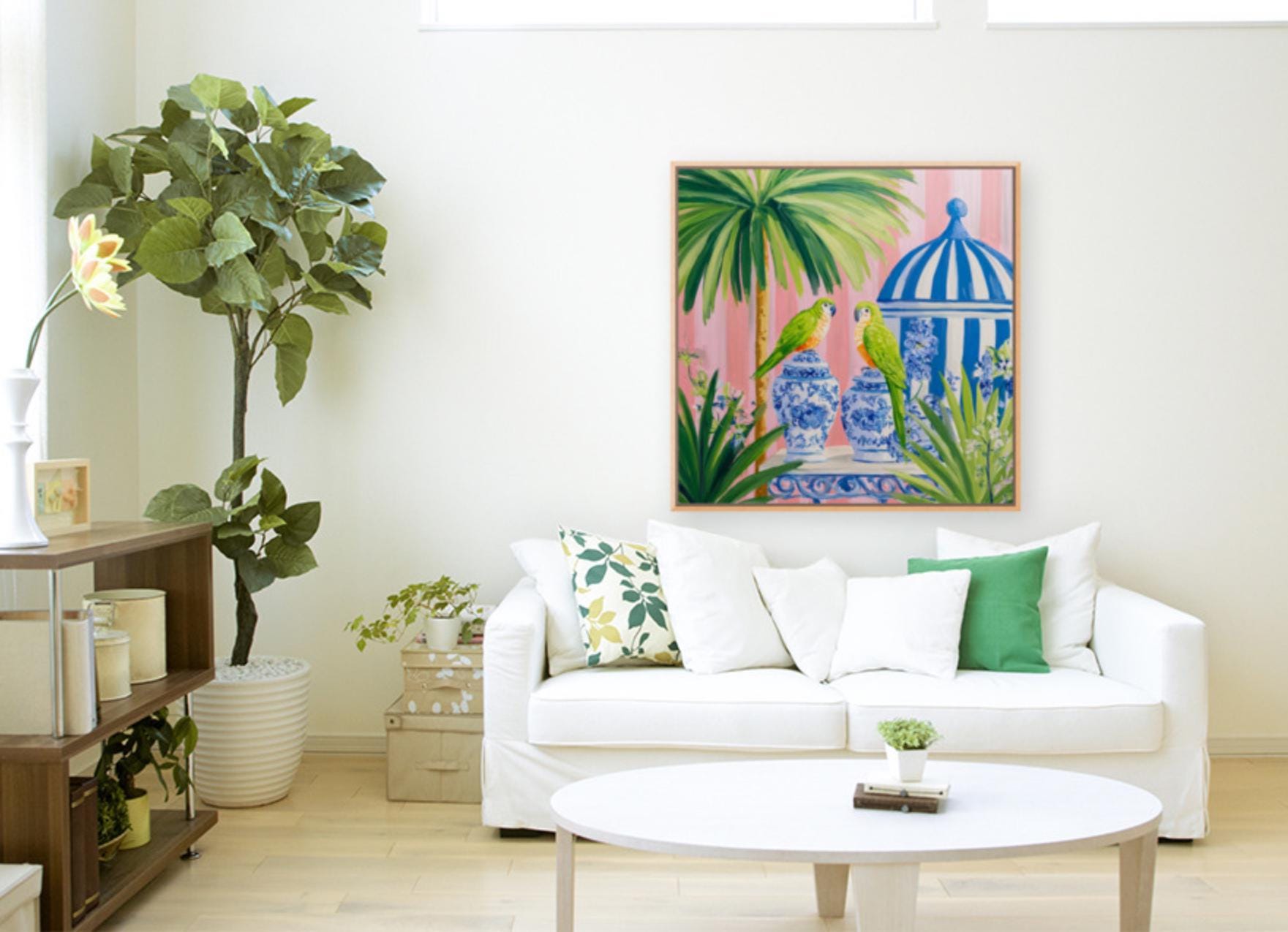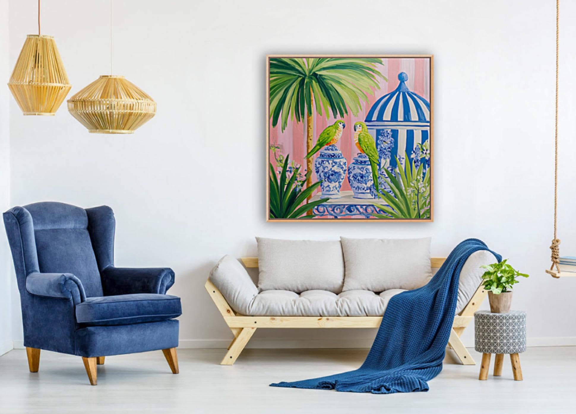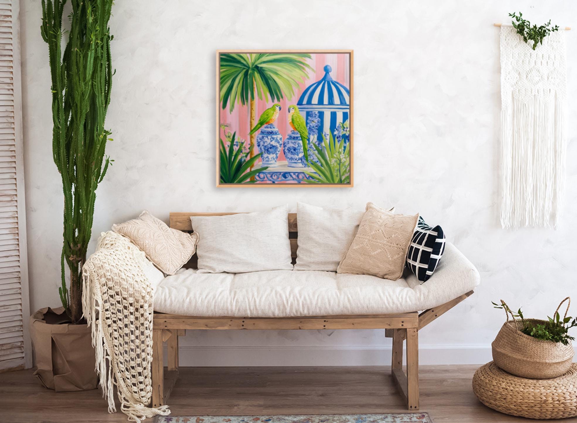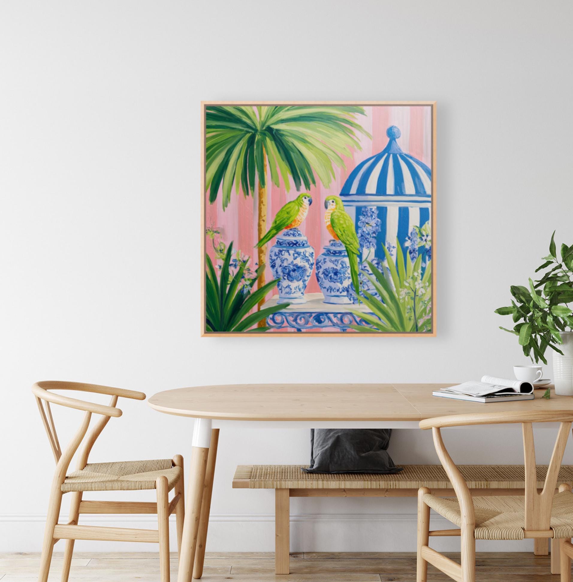 Pop the bubbly and meet your new party guest! This charming giclée art print captures everything we love about Grandmillennial style—whimsy, elegance, and a dash of cheek. Featuring a blue budgie perched on a chinoiserie ice bucket chilling champagne, this vibrant artwork blends Palm Beach glamour with playful sophistication.