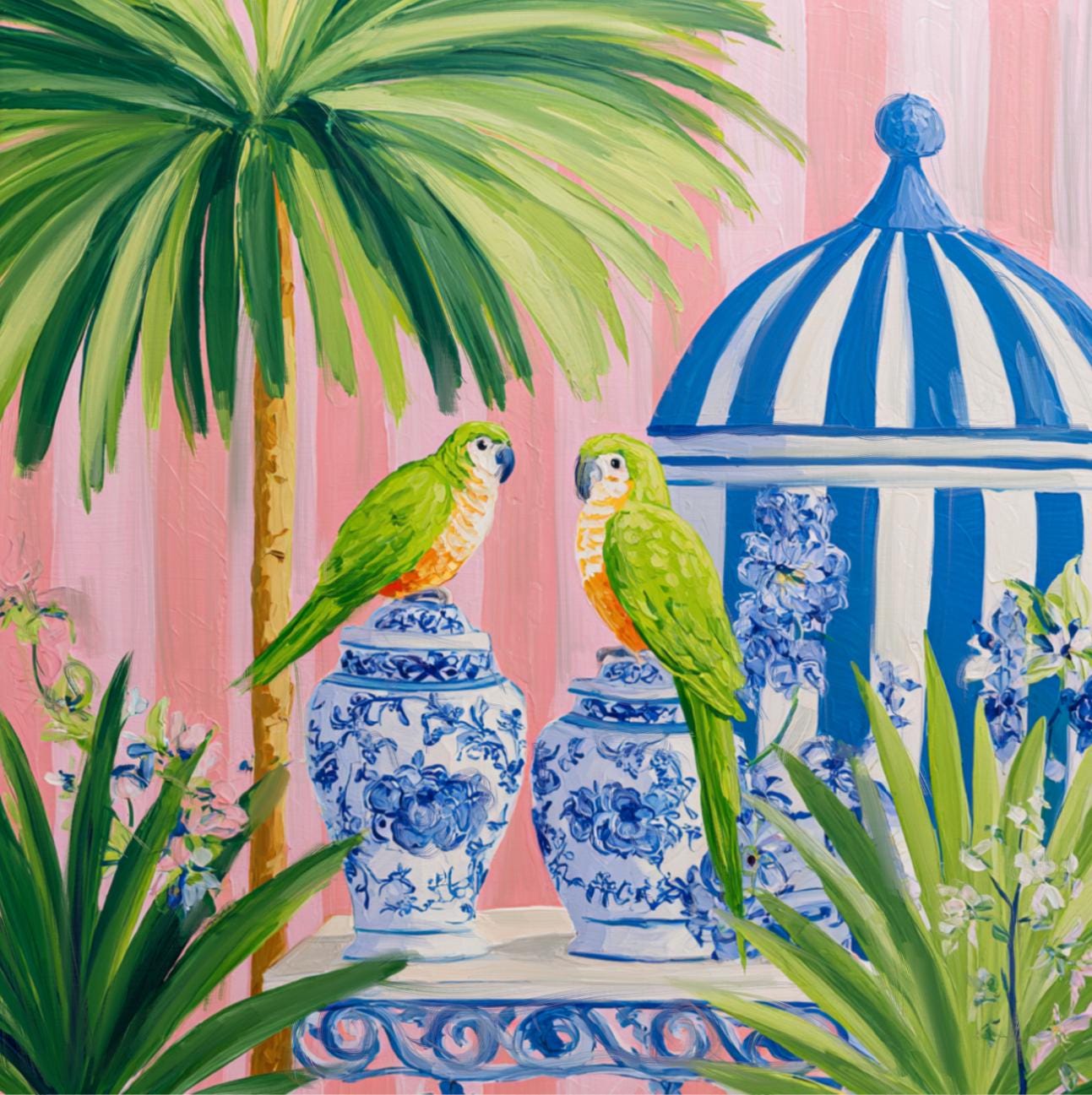 Preppy green parrots perched on cabana stripes in Palm Beach garden, giclee print