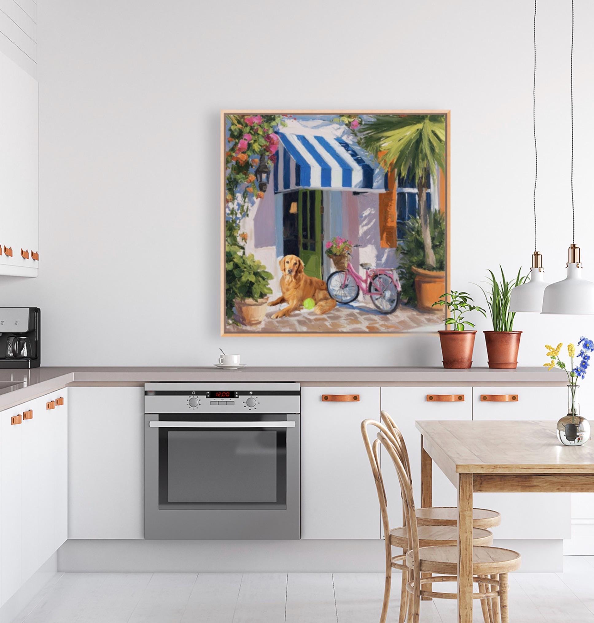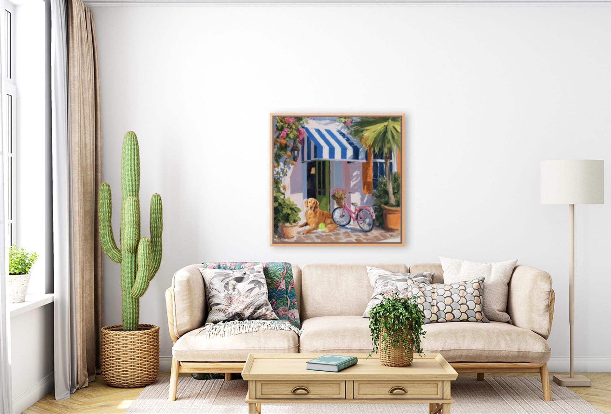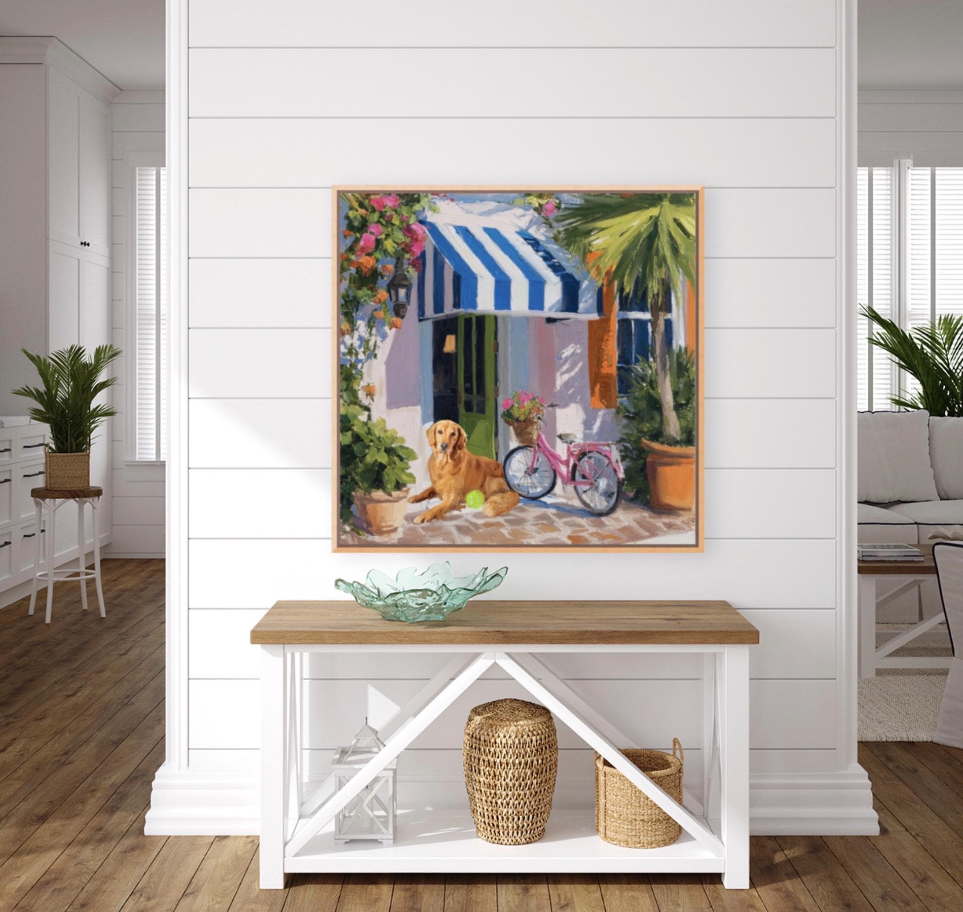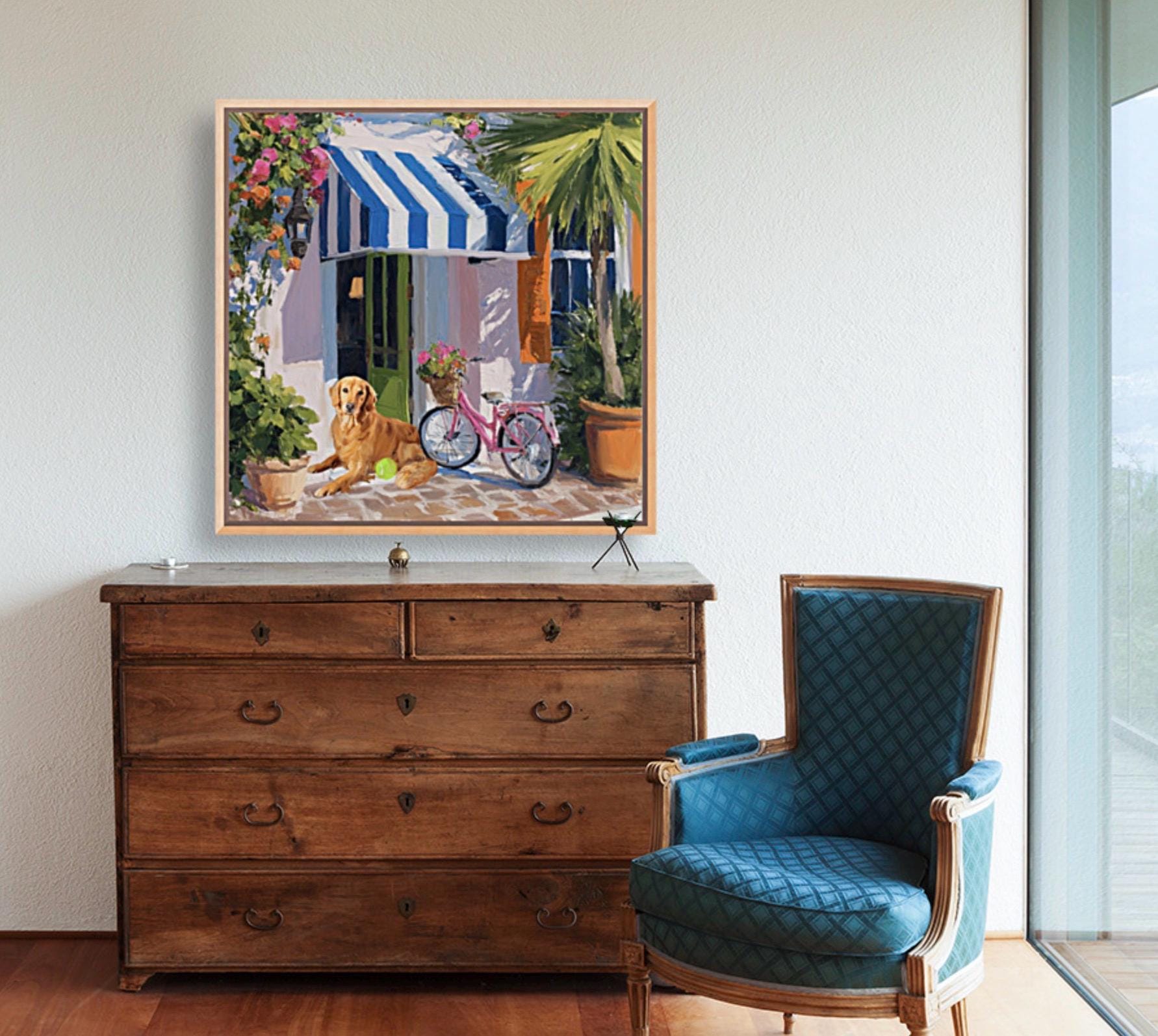 Golden Retriever Art Print, Pink Bicycle, Palm Beach Cabana