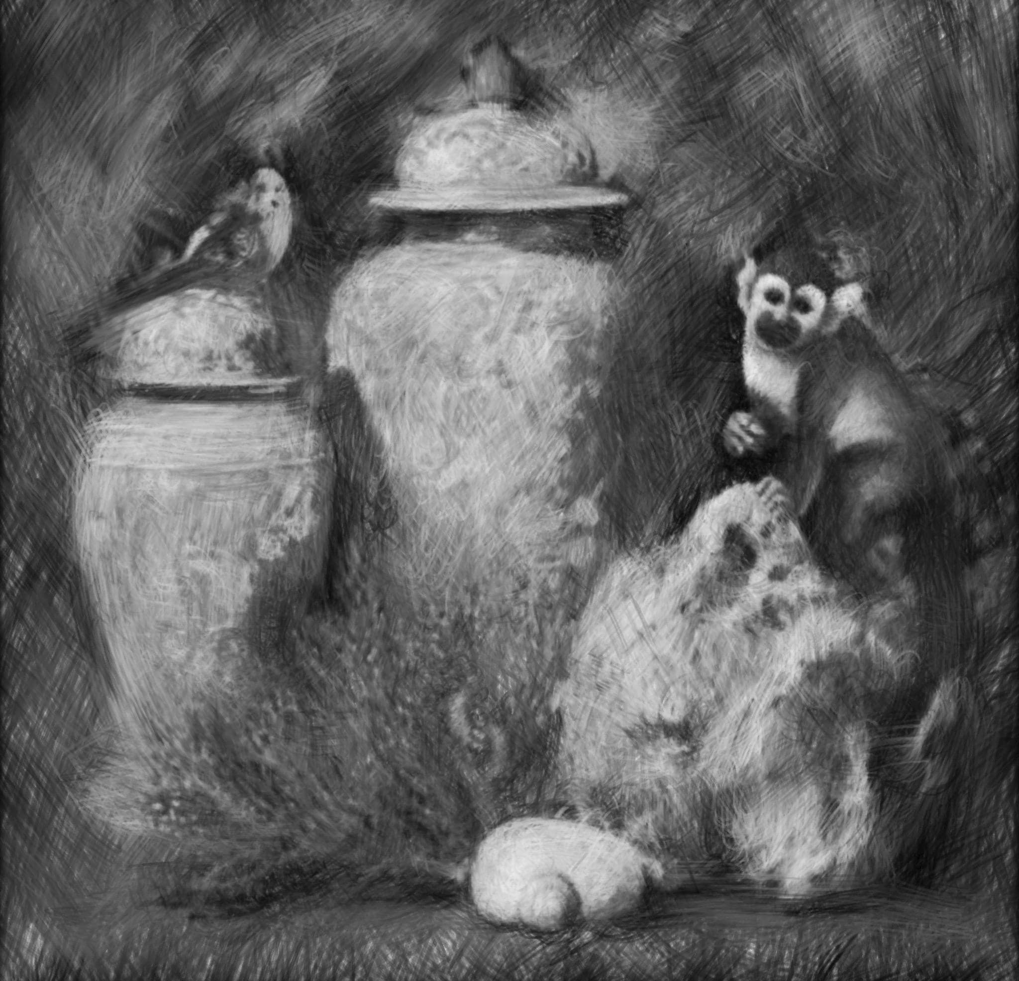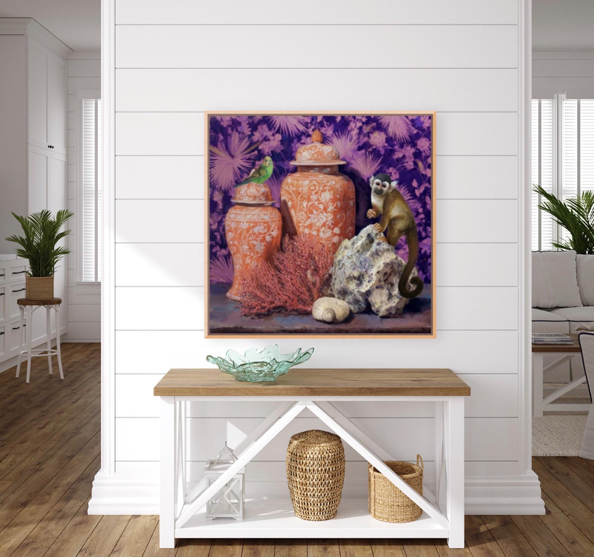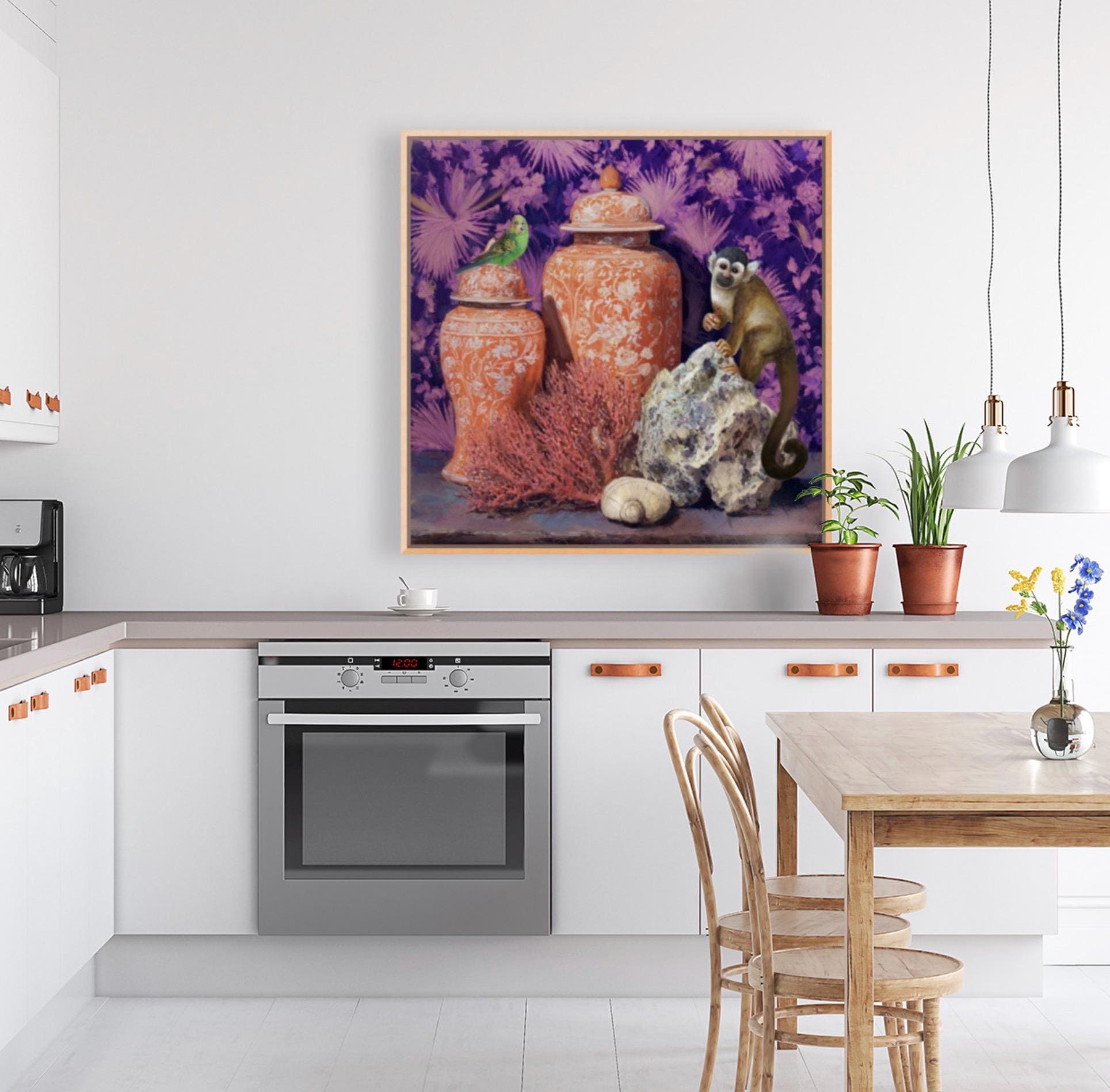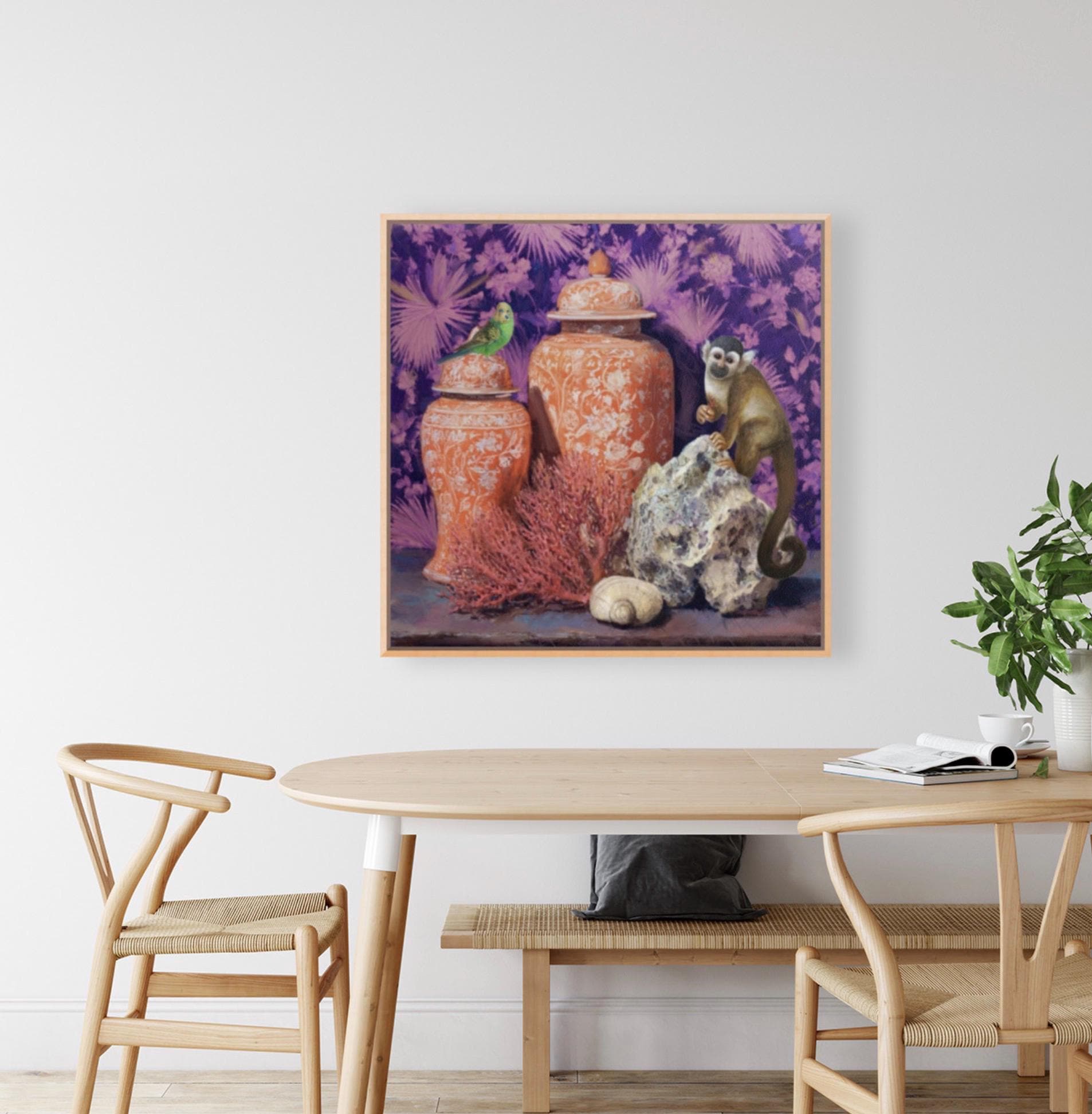 Monkey and budgie in plum noir chinoiserie room with orange ginger jars, Grandmillennial art