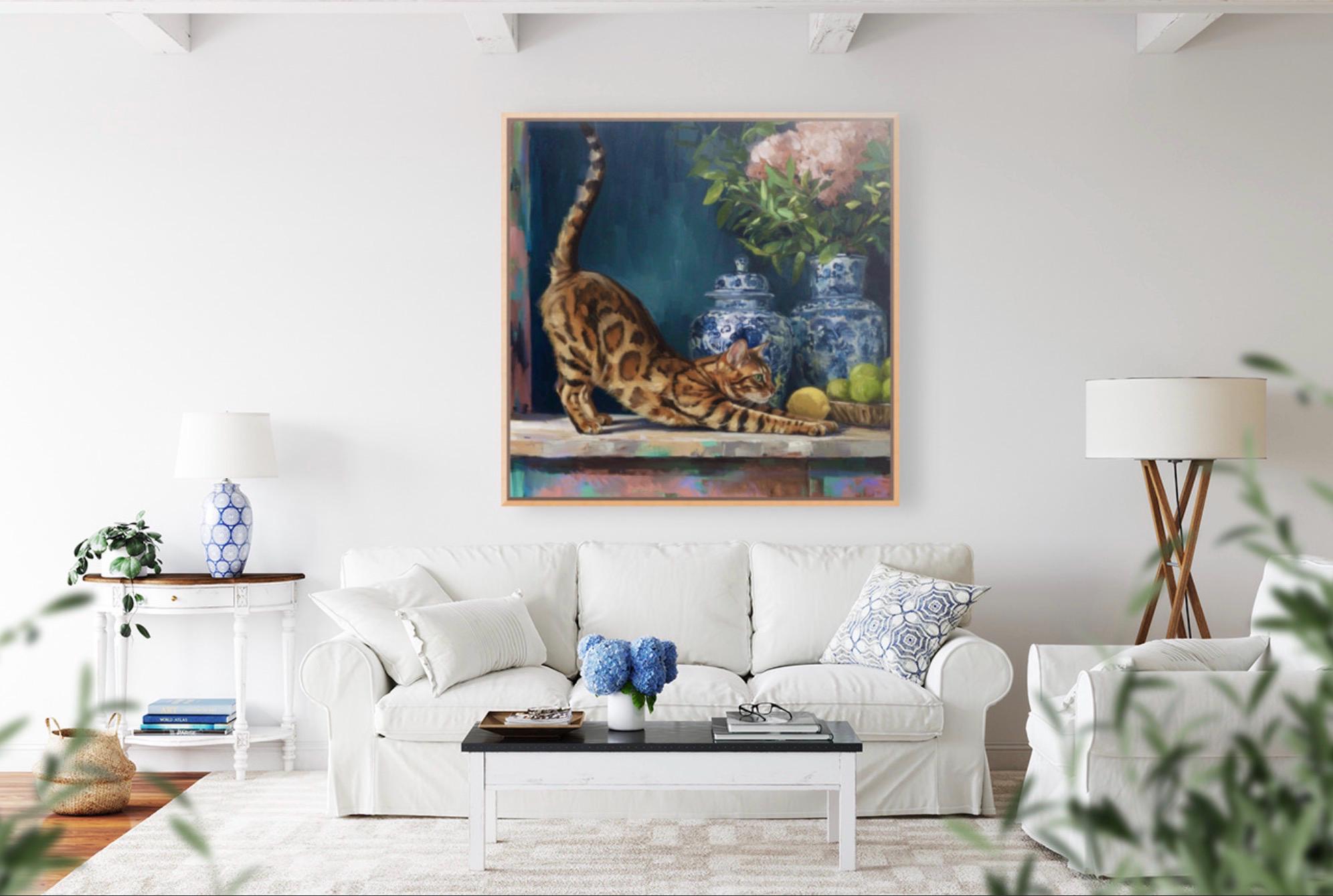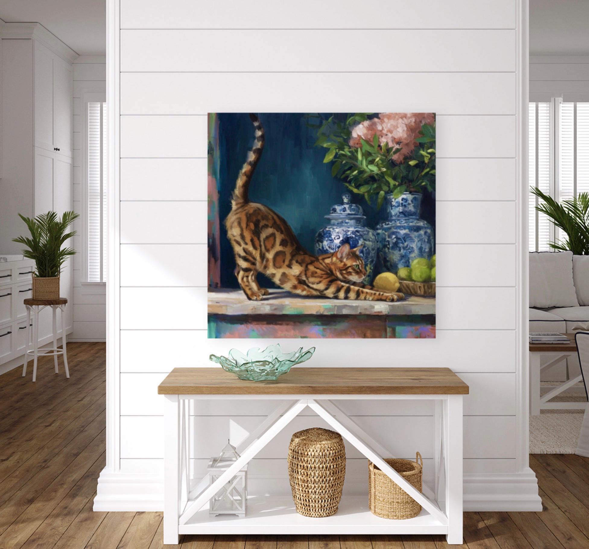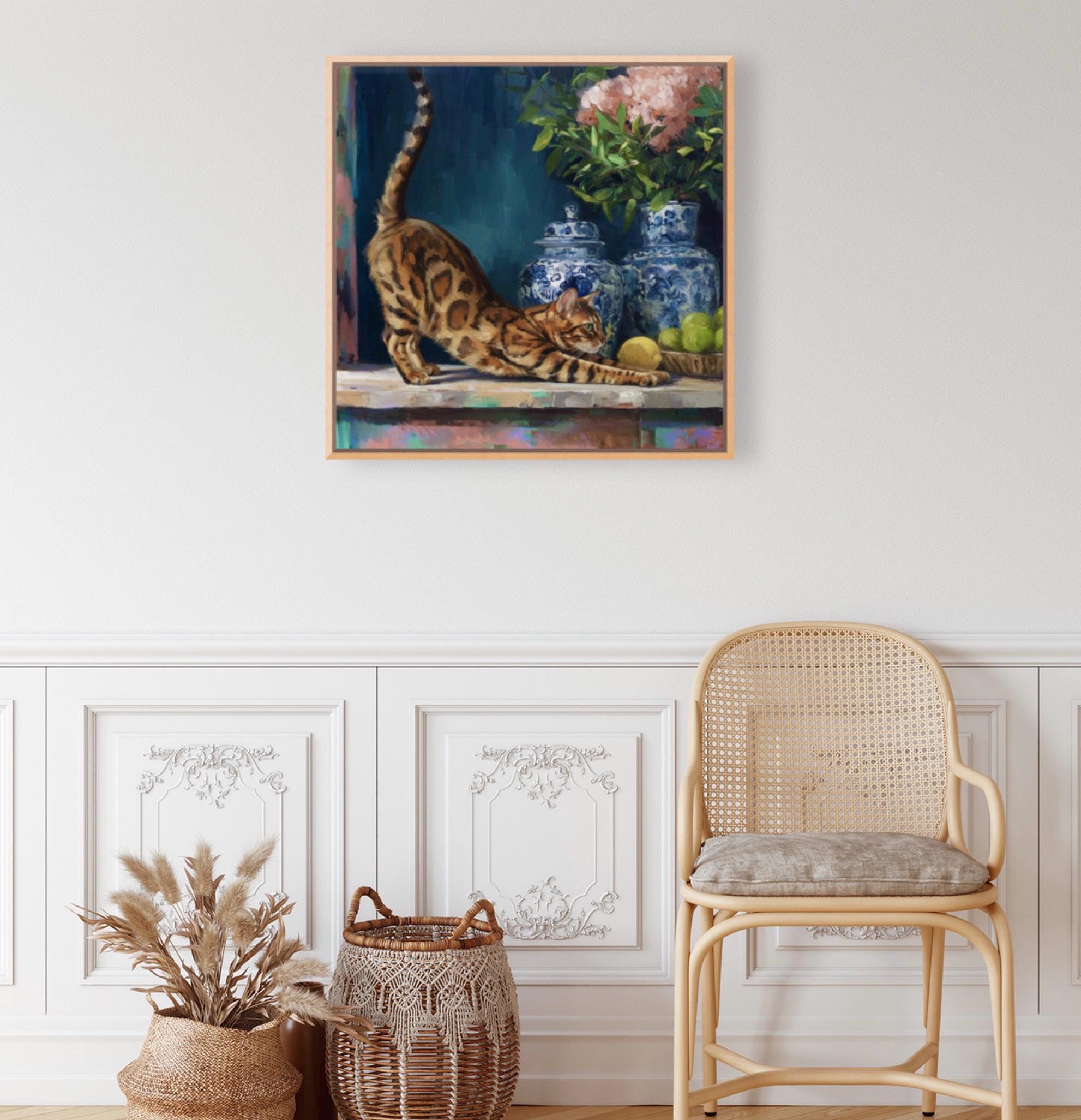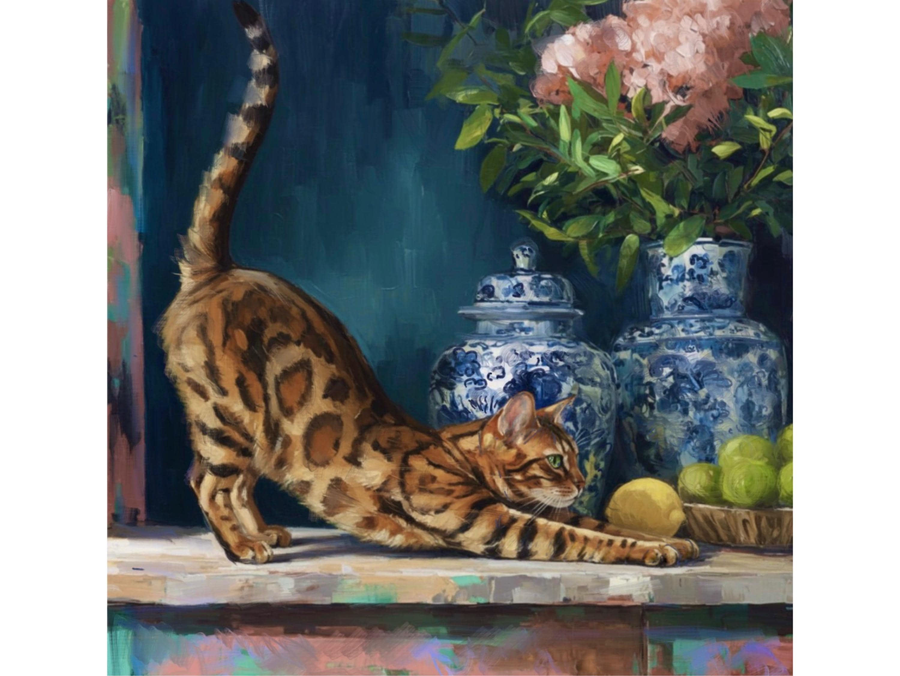 Grandmillennial art, The Morning Stretch, Coastal chinoiserie Bengal cat portrait in jewelled blue chinoiserie room
