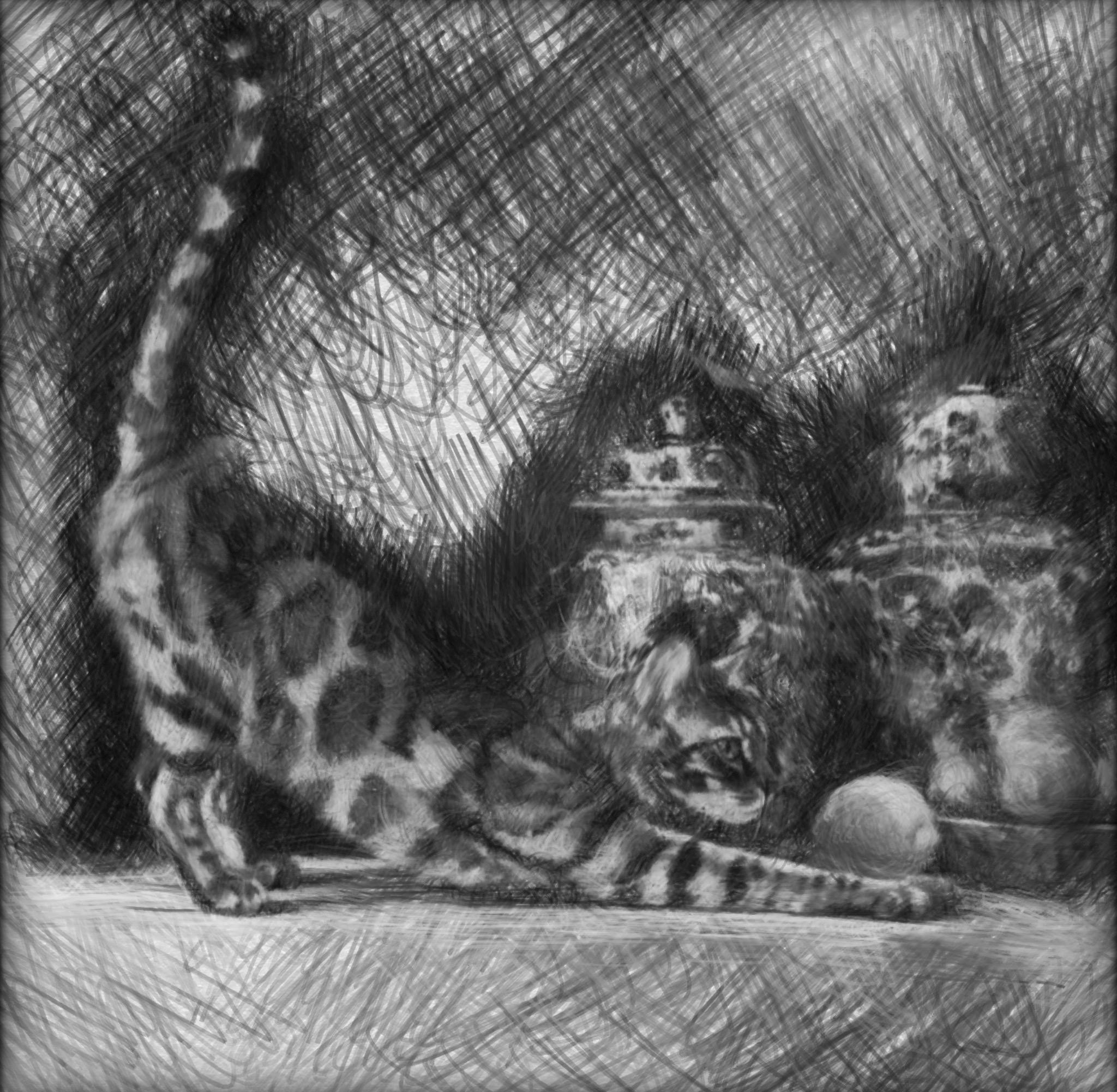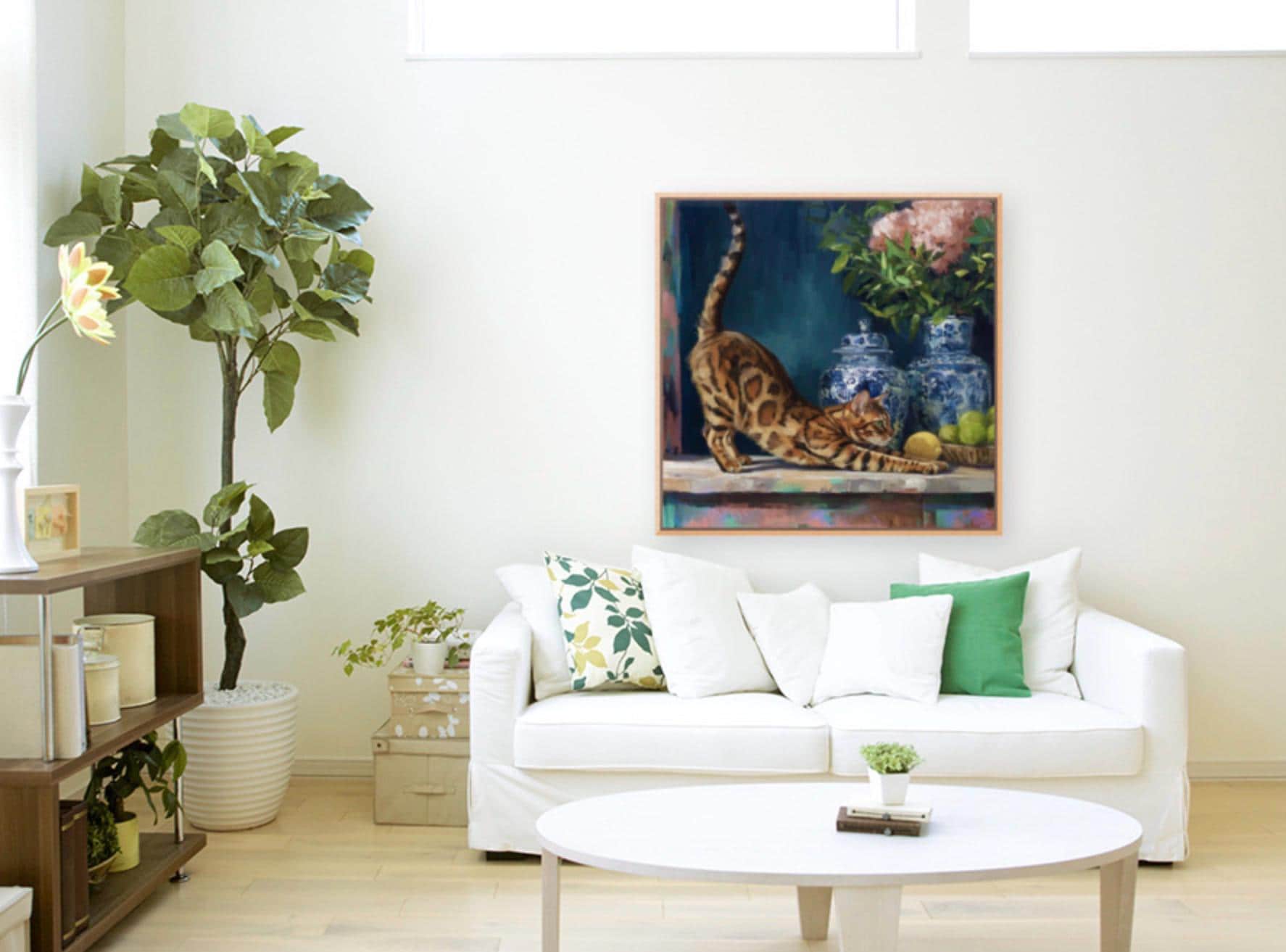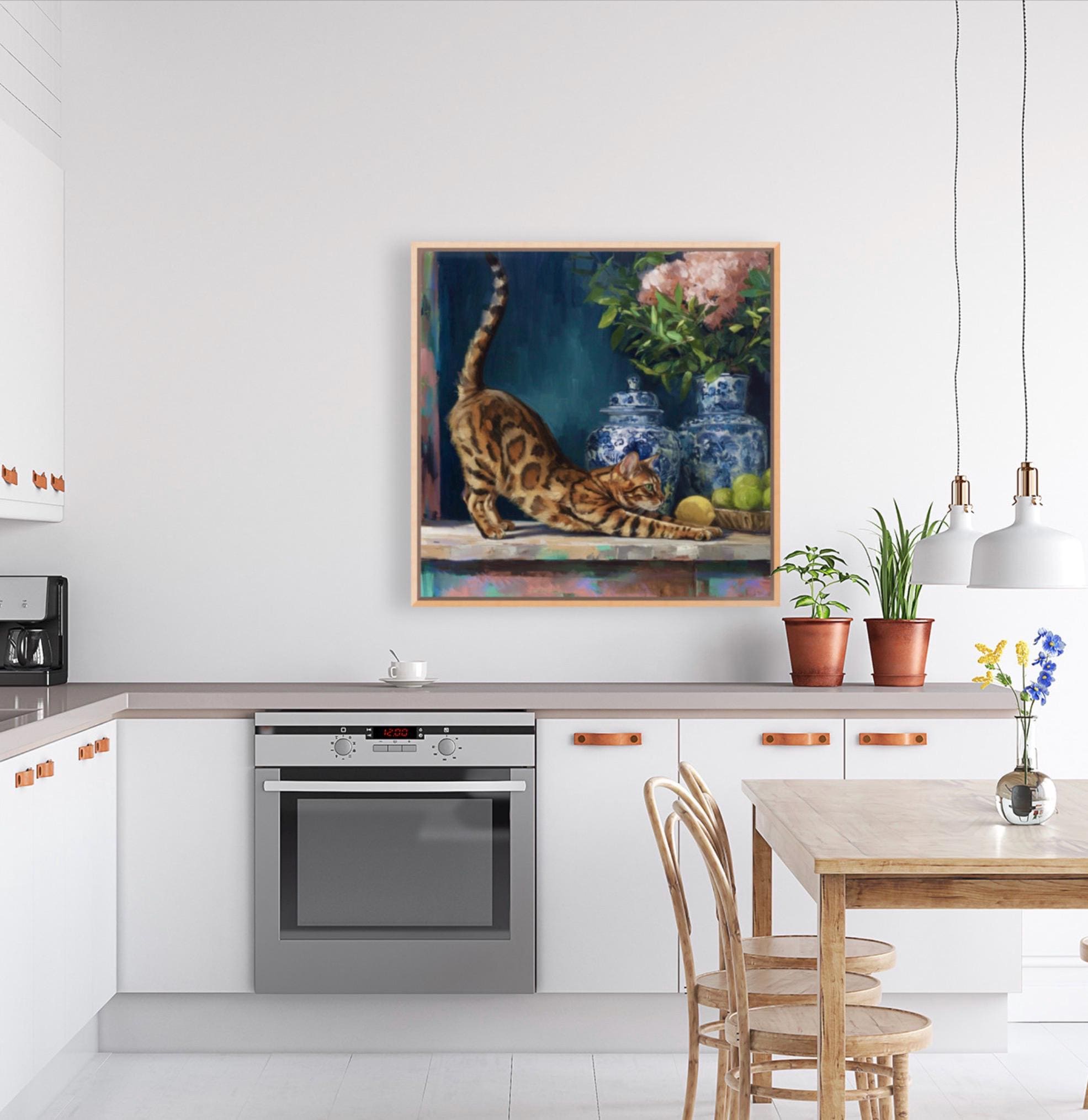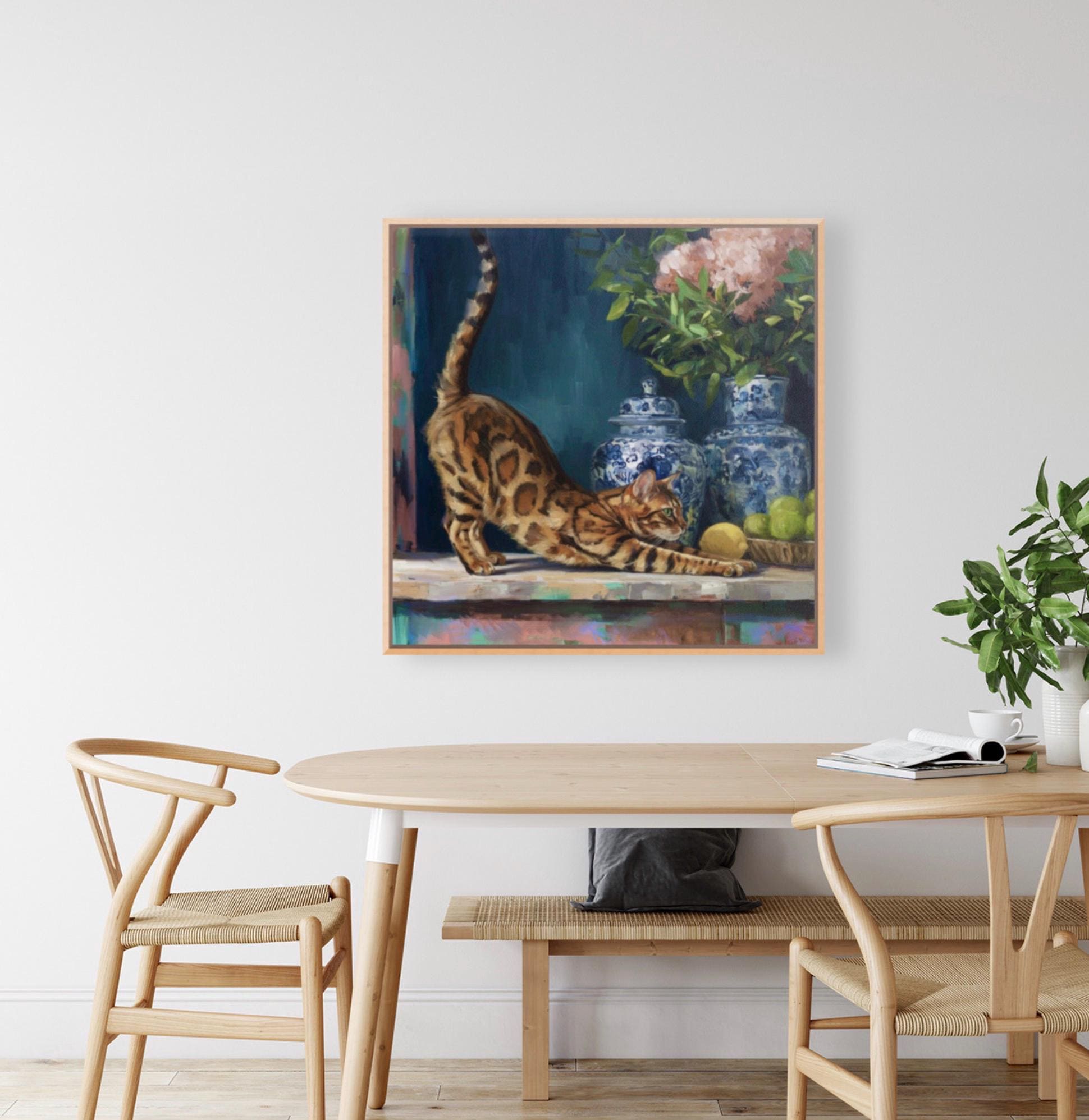 Grandmillennial art, The Morning Stretch, Coastal chinoiserie Bengal cat portrait in jewelled blue chinoiserie room