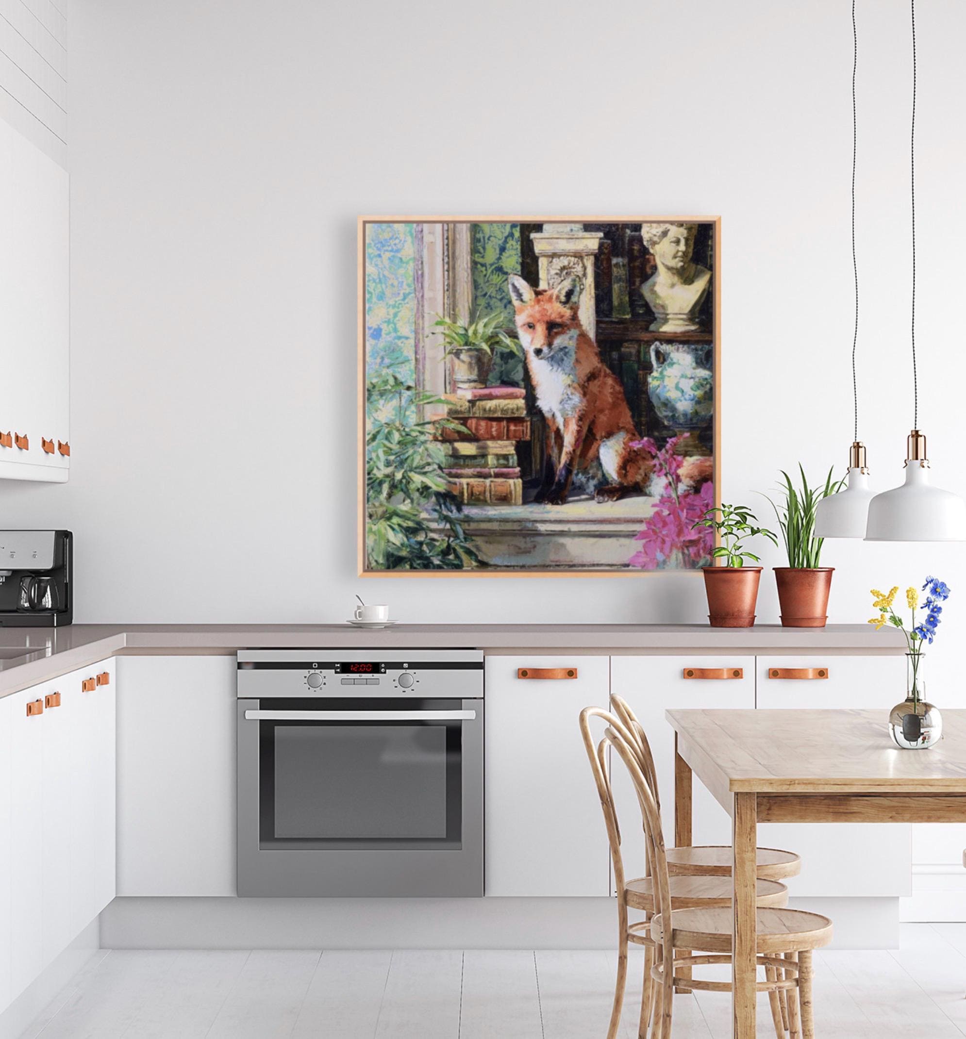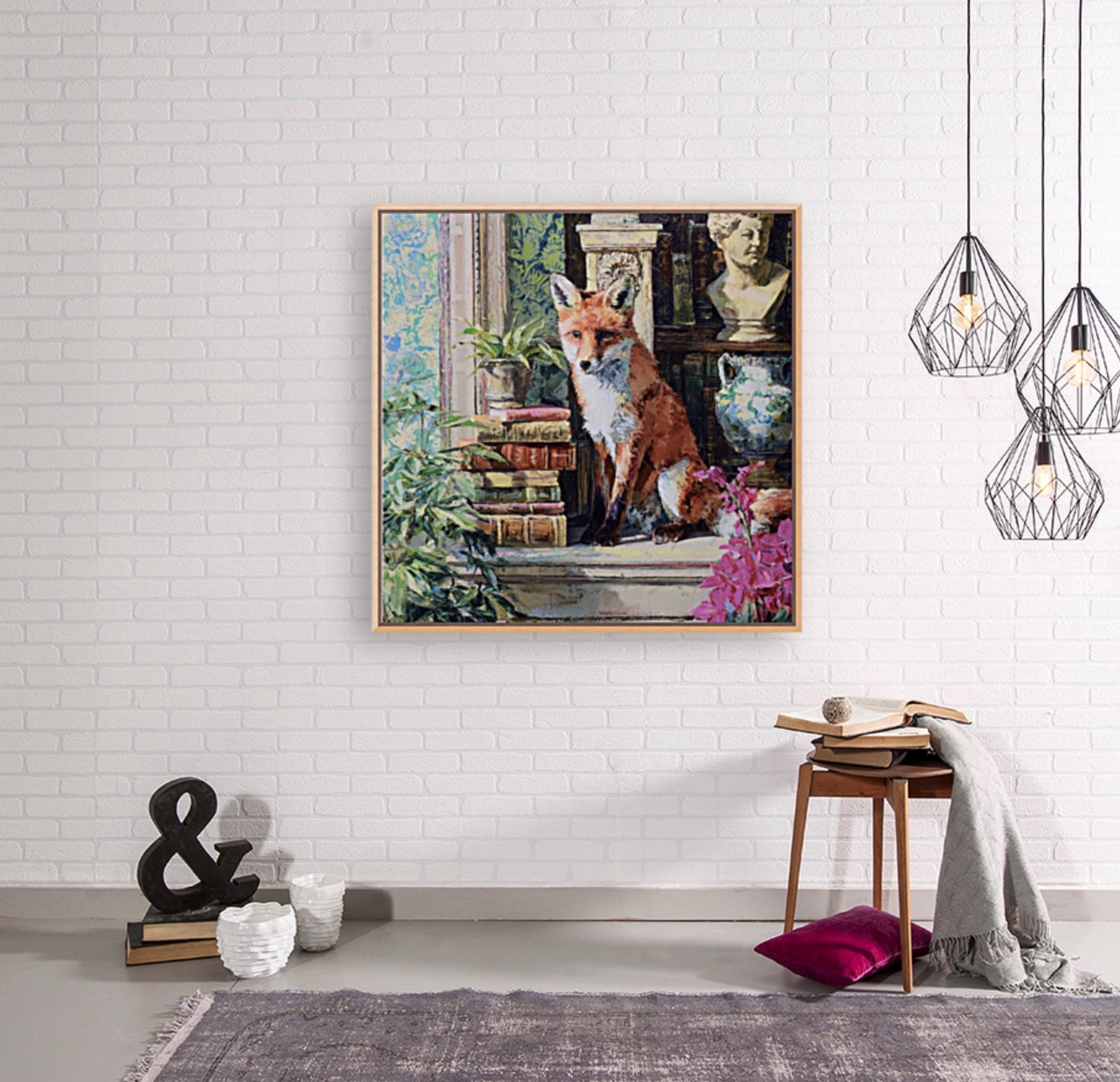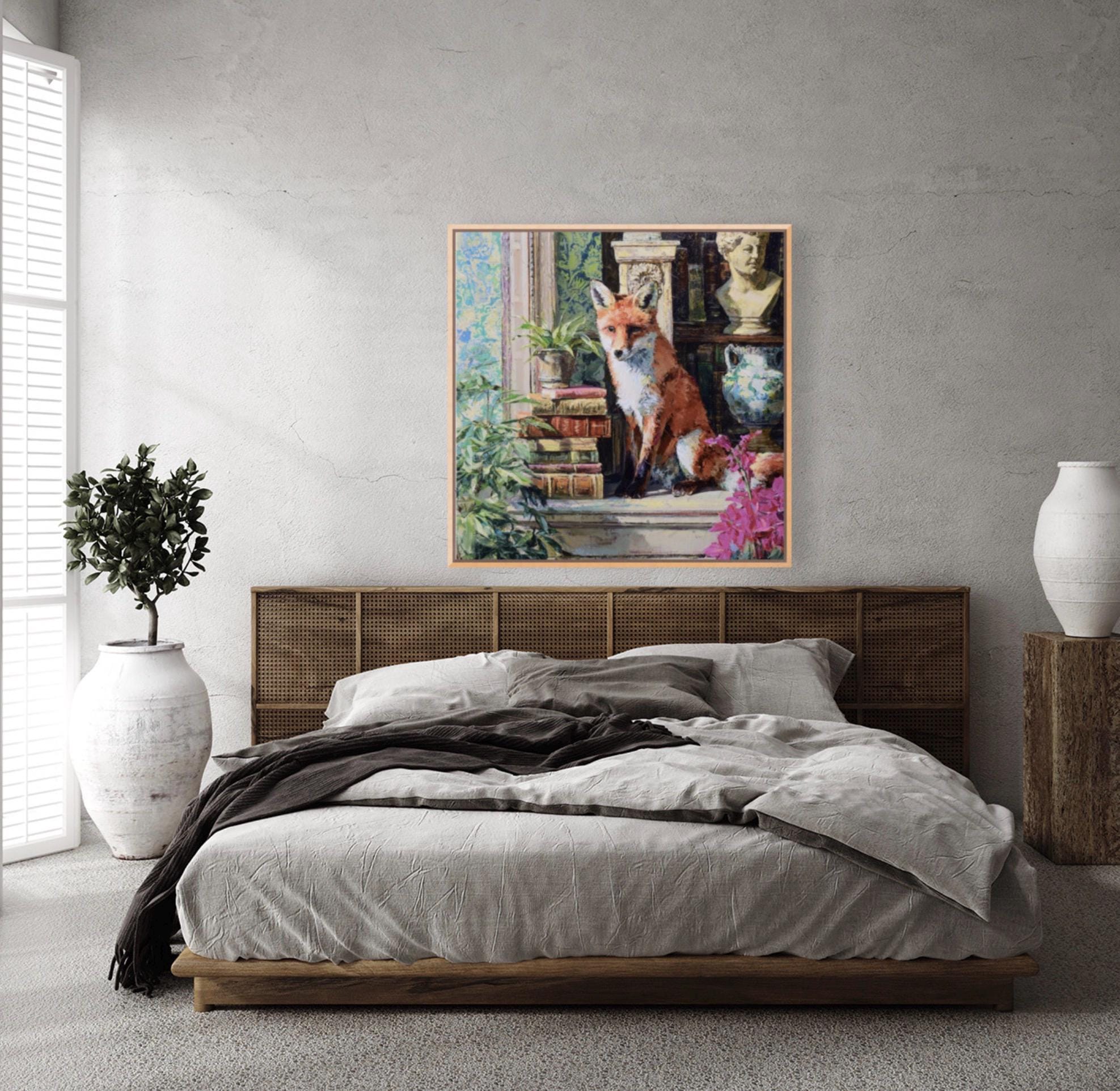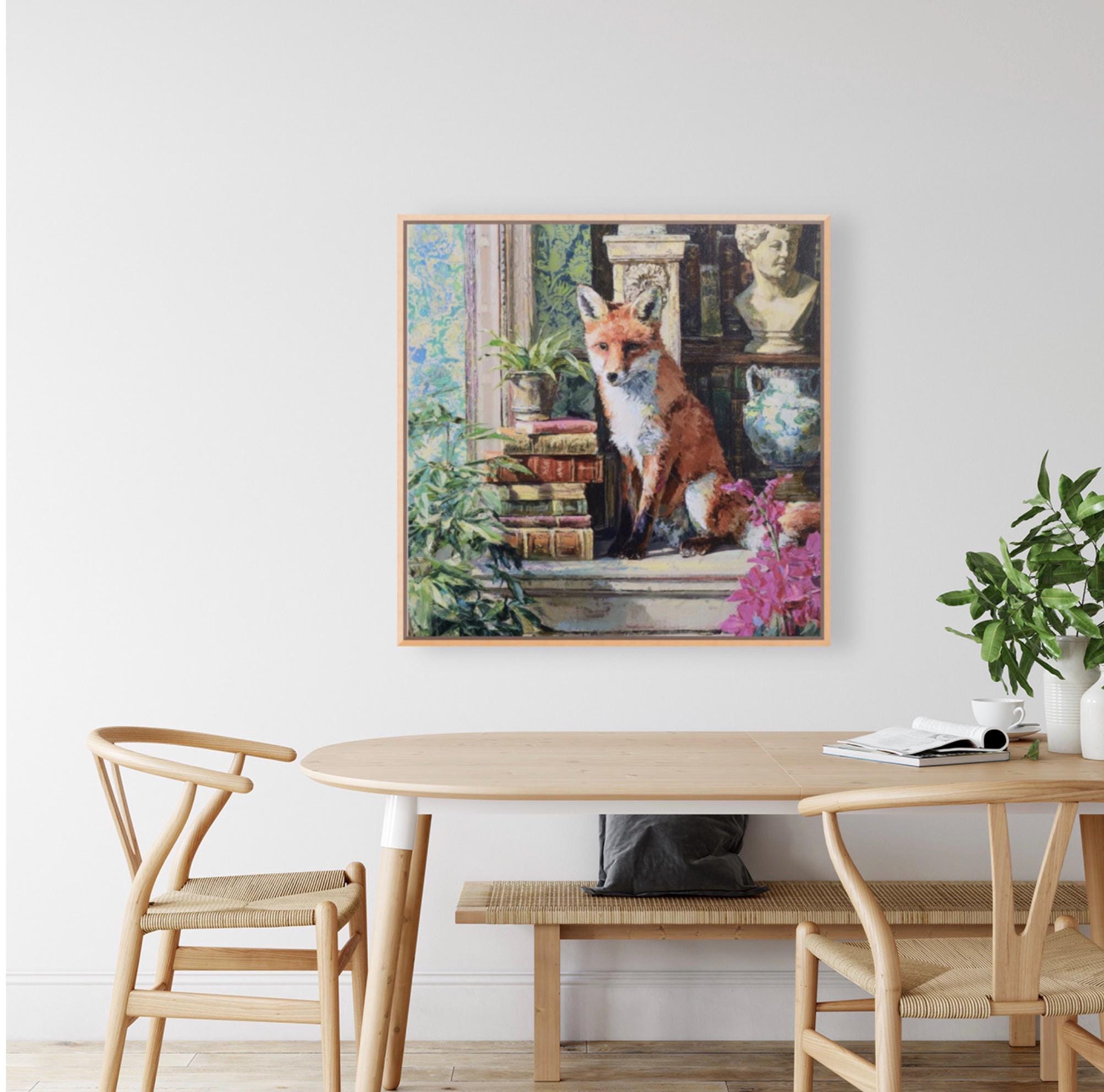 Grandmillennial art, Fox in Old Library, whimsical animals signed art