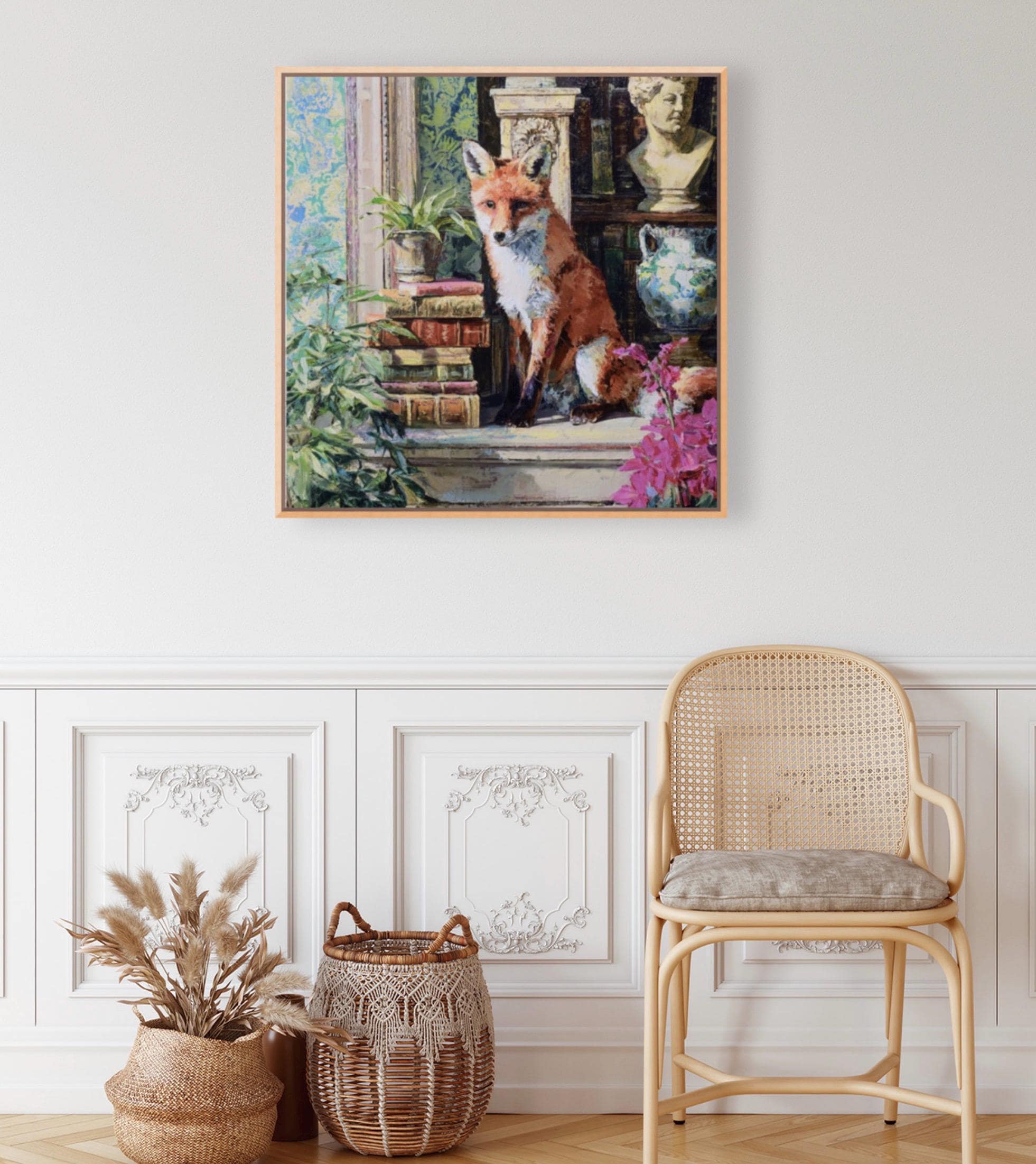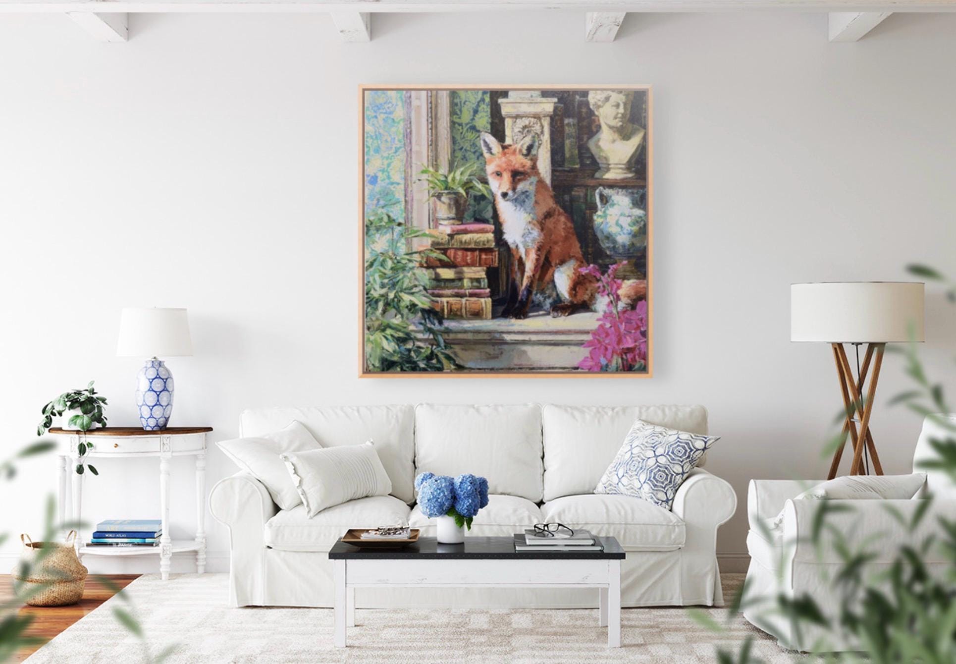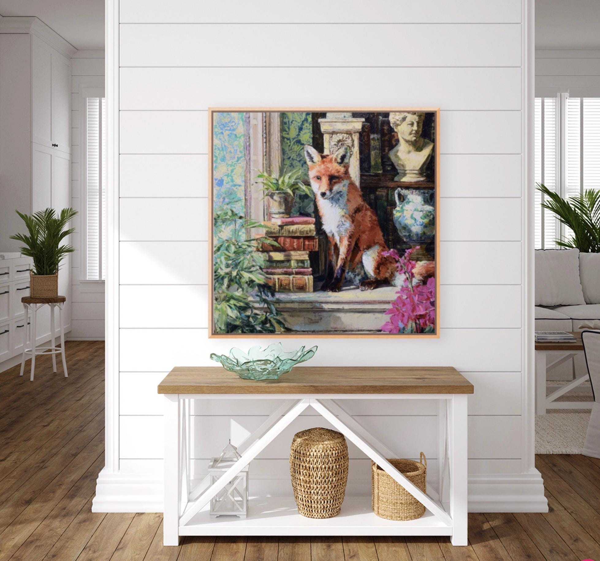 Grandmillennial art, Fox in Old Library, whimsical animals signed art