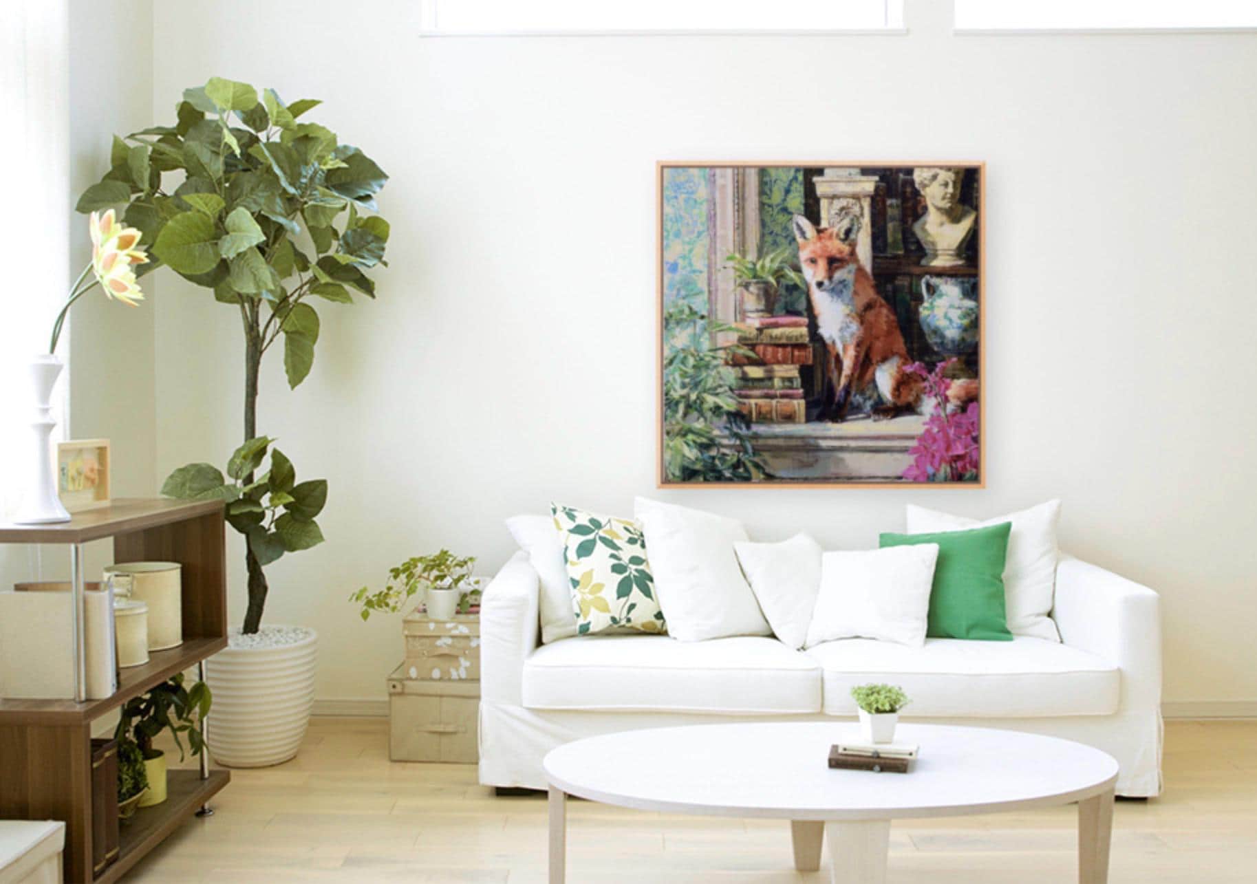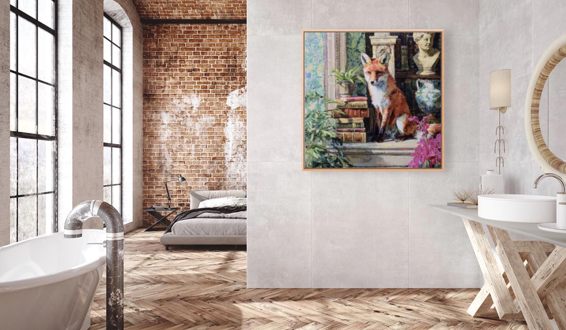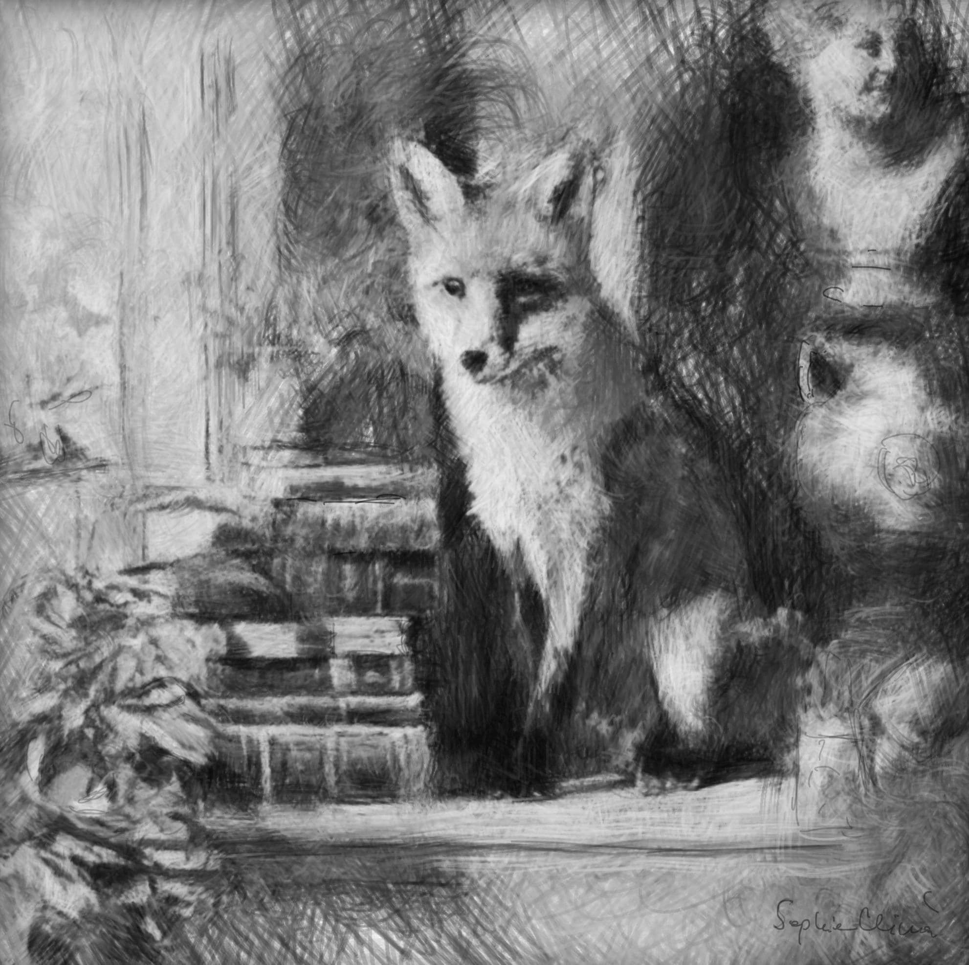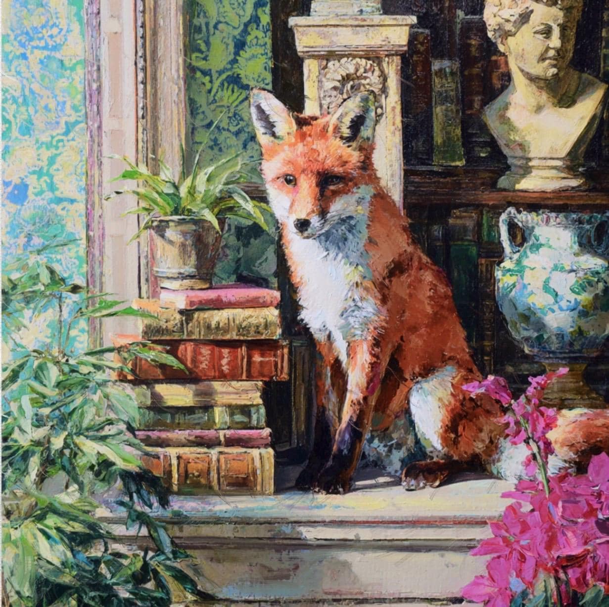 Grandmillennial art, Fox in Old Library, whimsical animals signed art