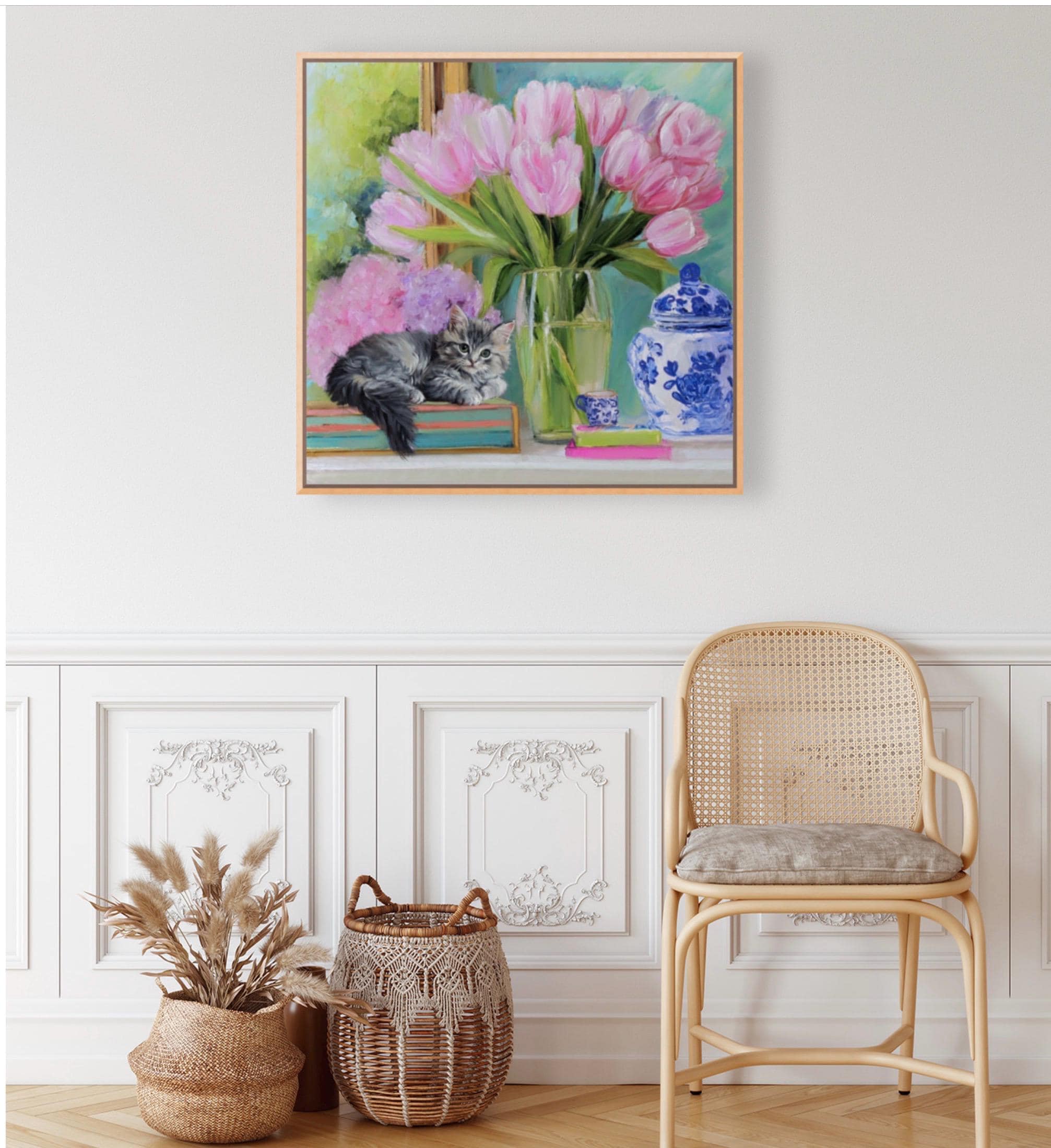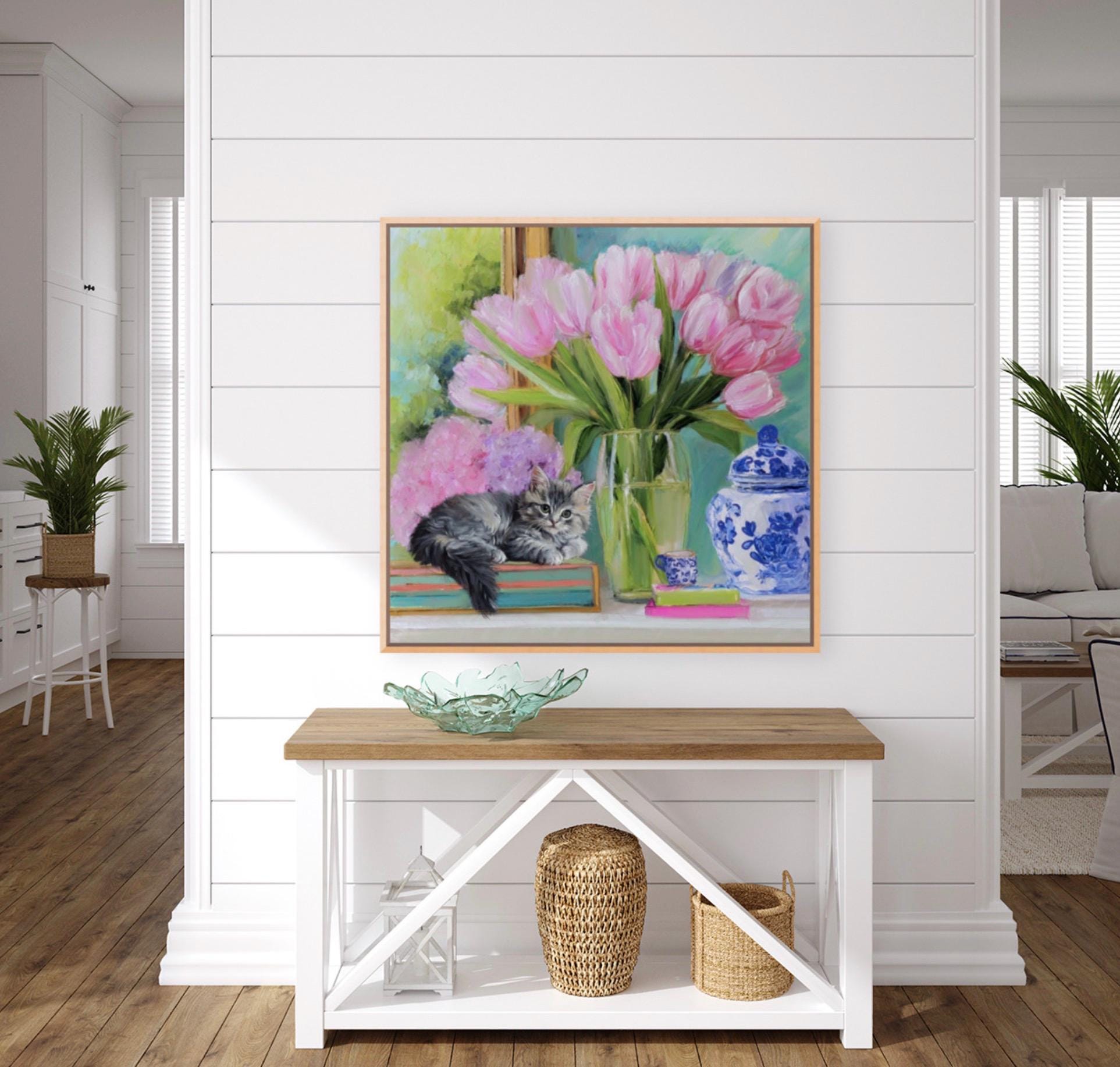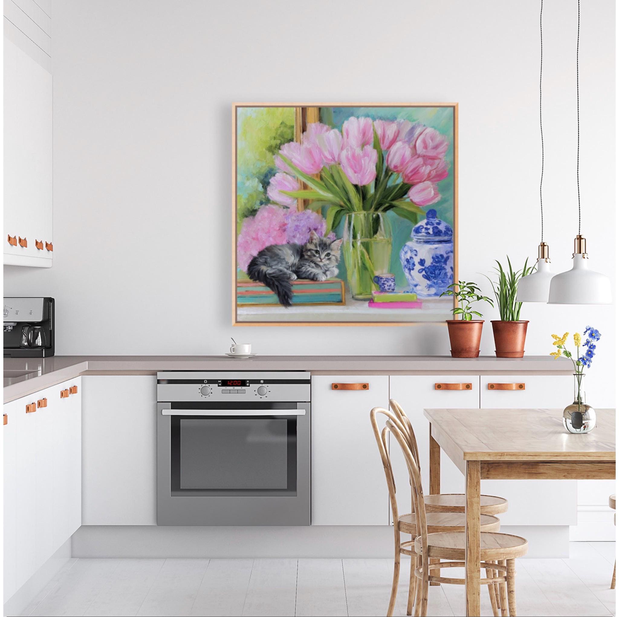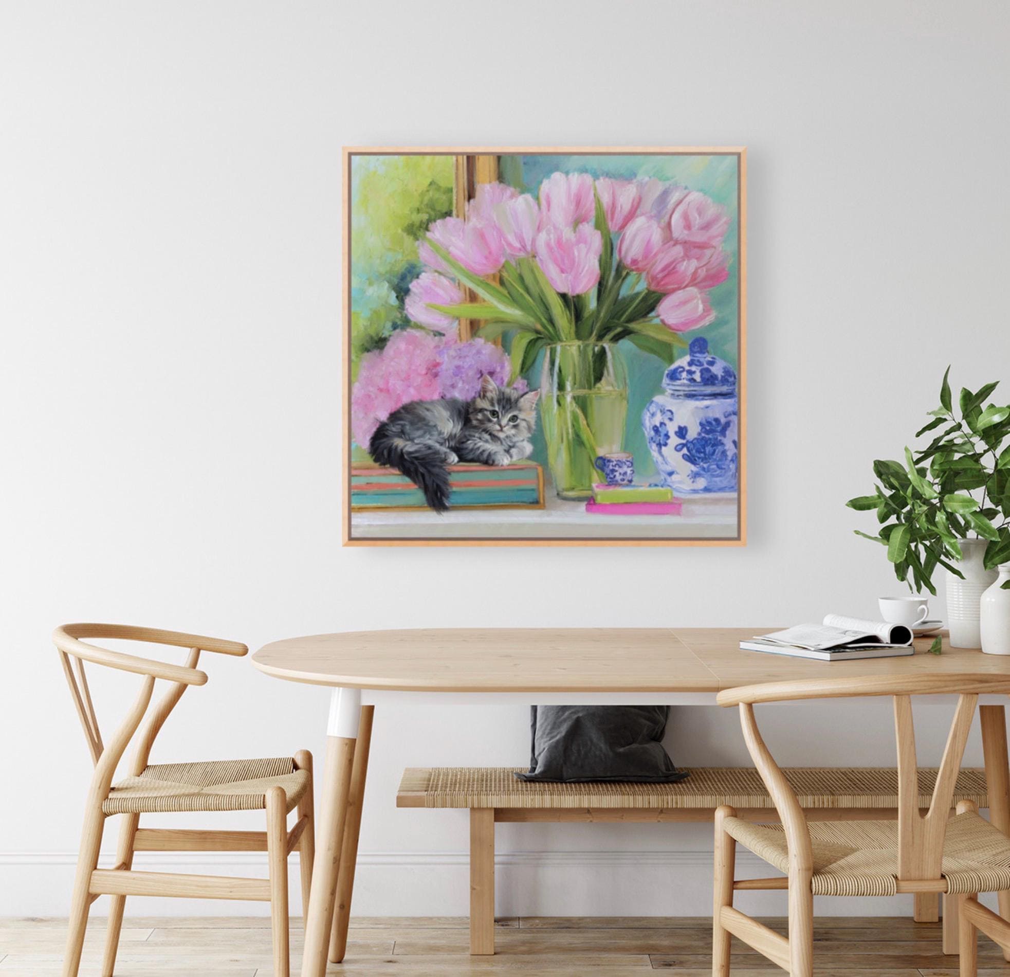 Whimsical Kitten and Tulips Giclee Art Print, Grandmillennial Chinoiserie Style