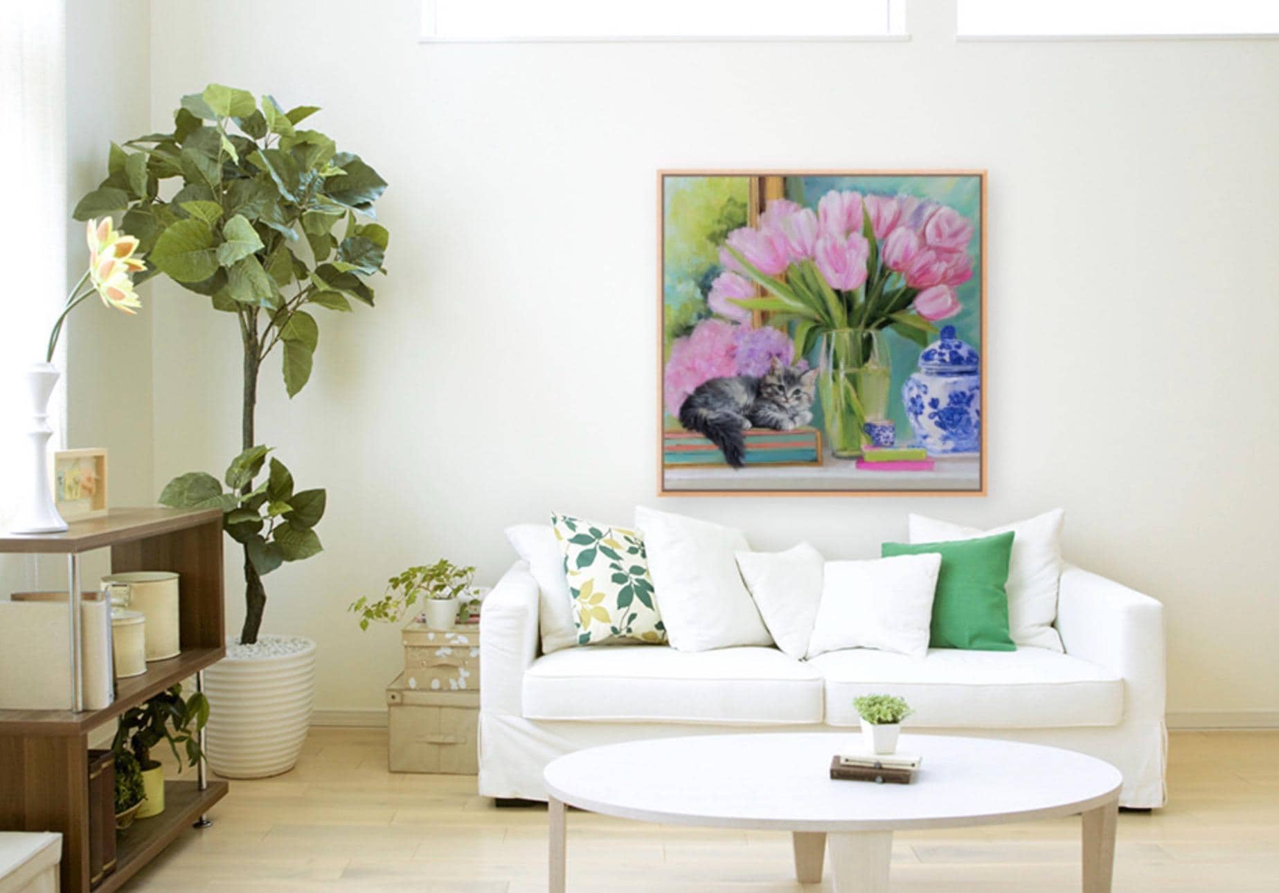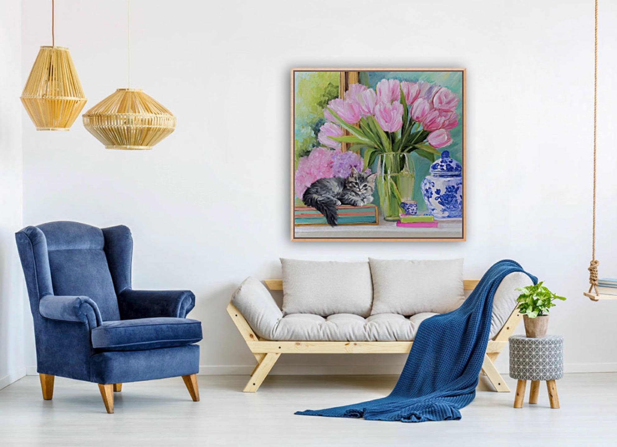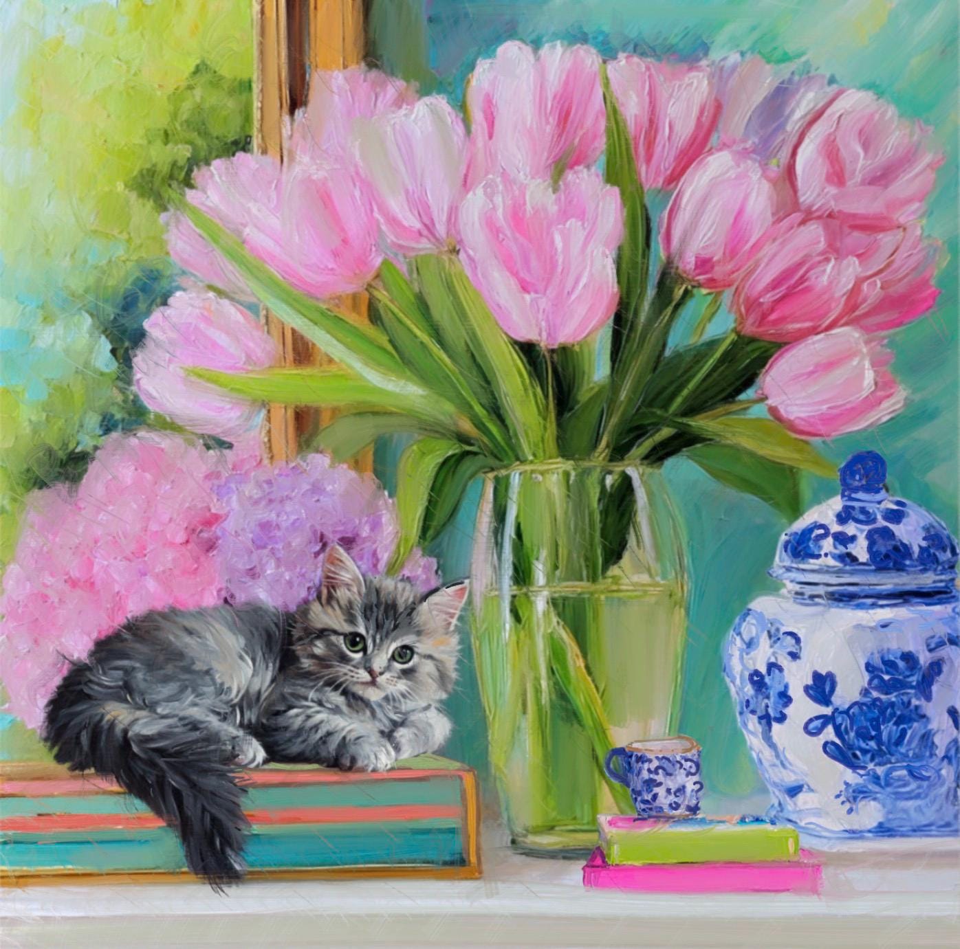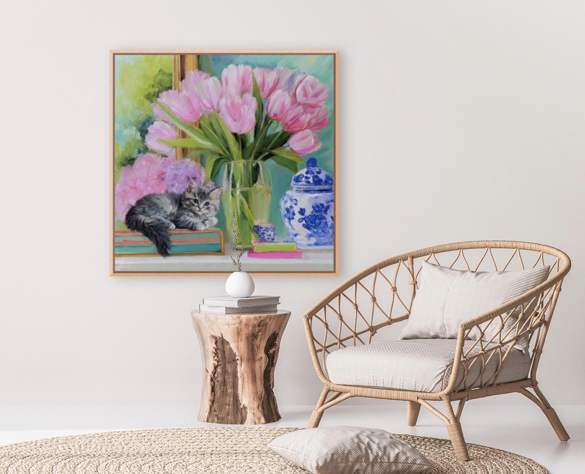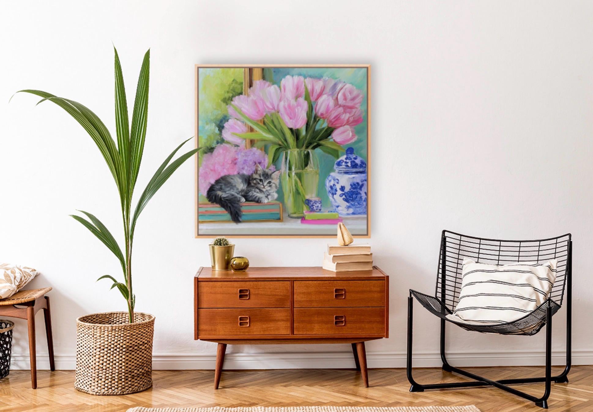Whimsical Kitten and Tulips Giclee Art Print, Grandmillennial Chinoiserie Style