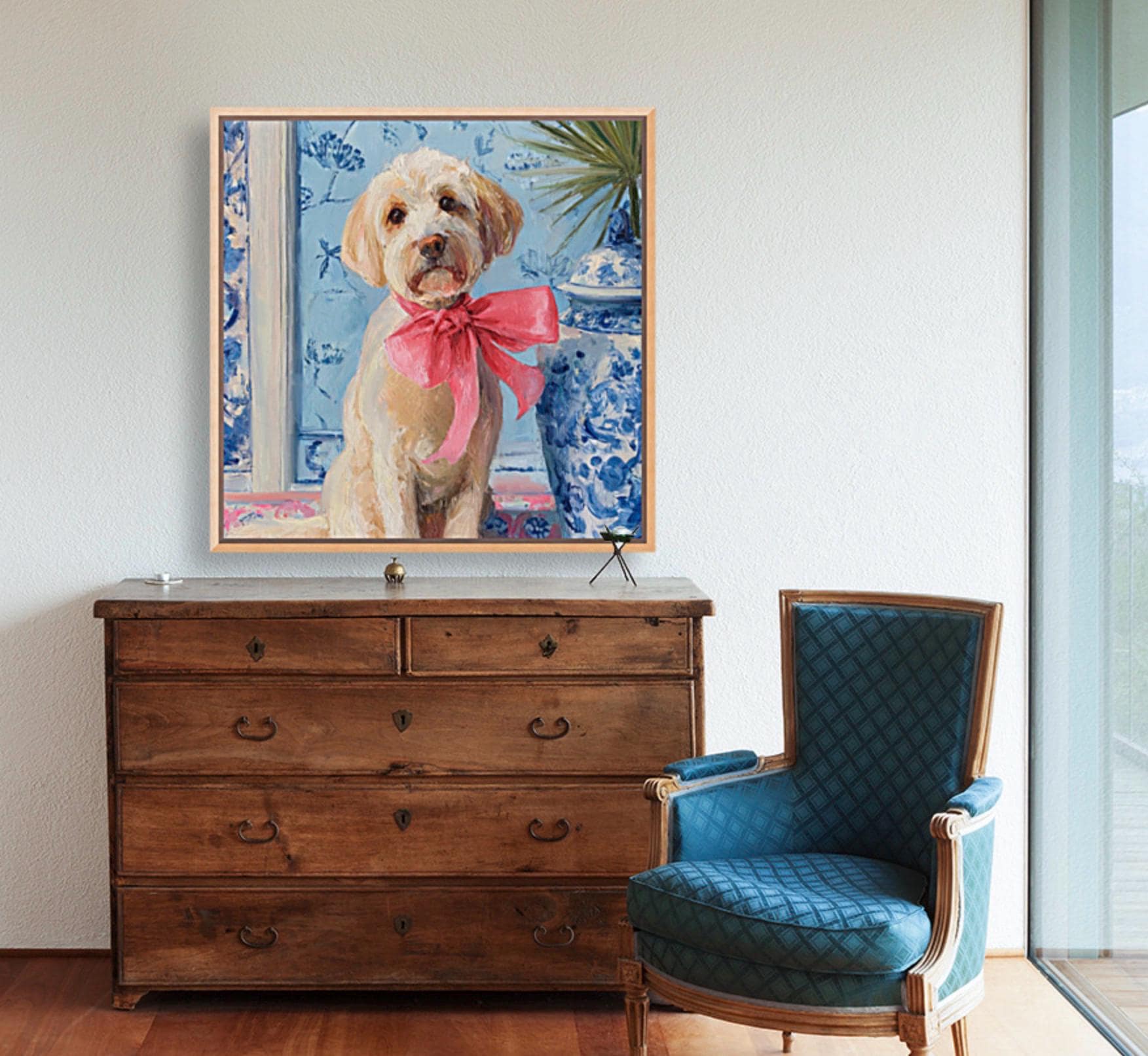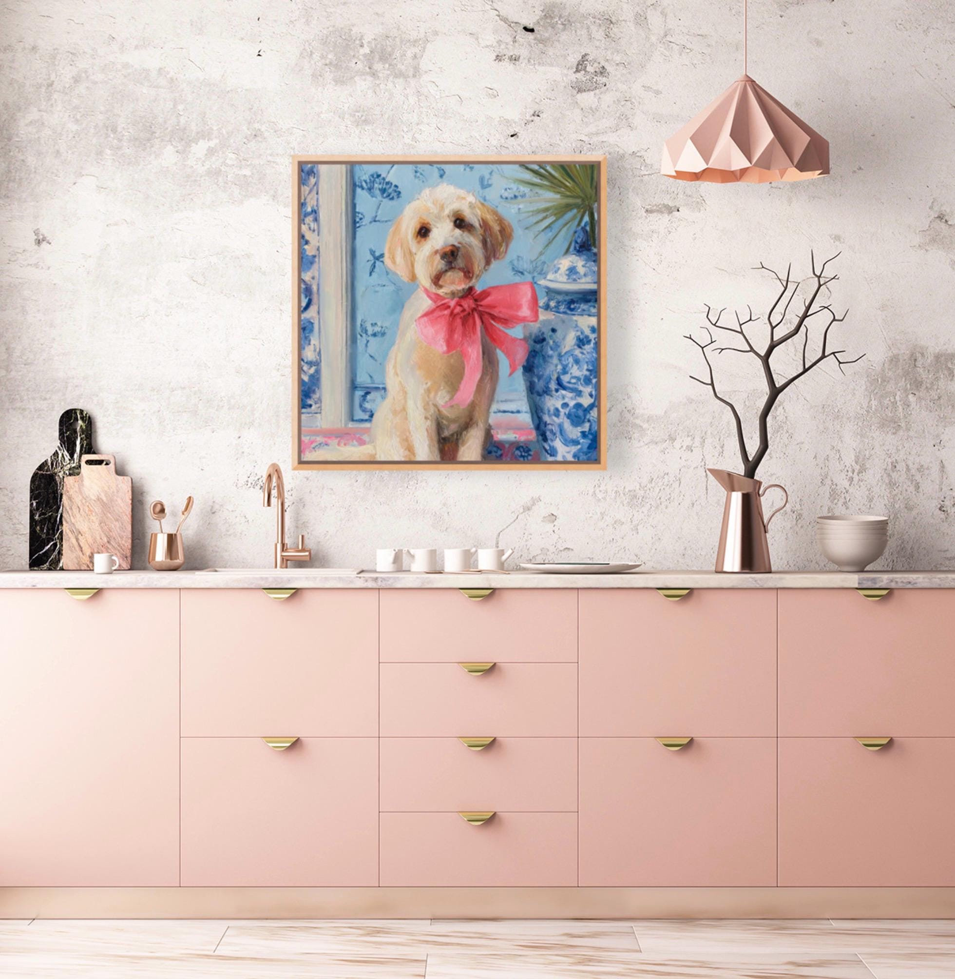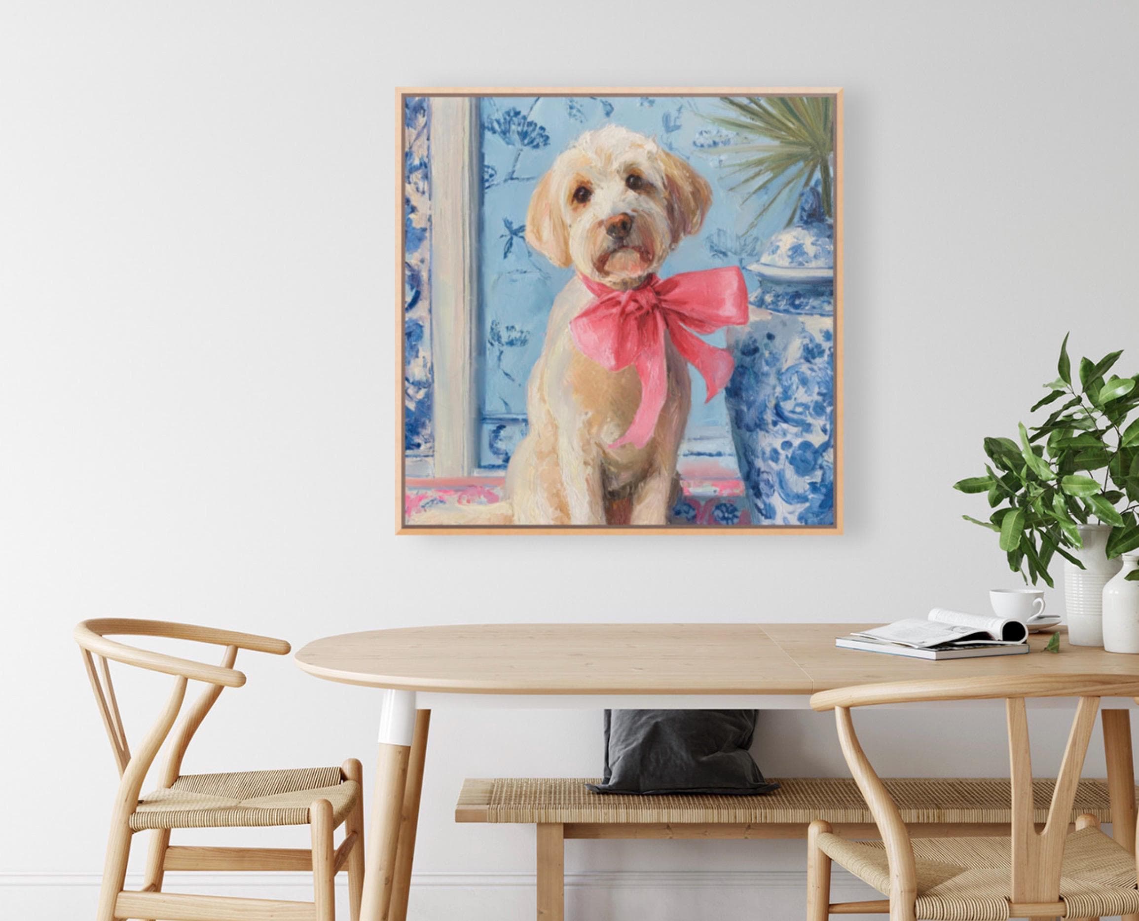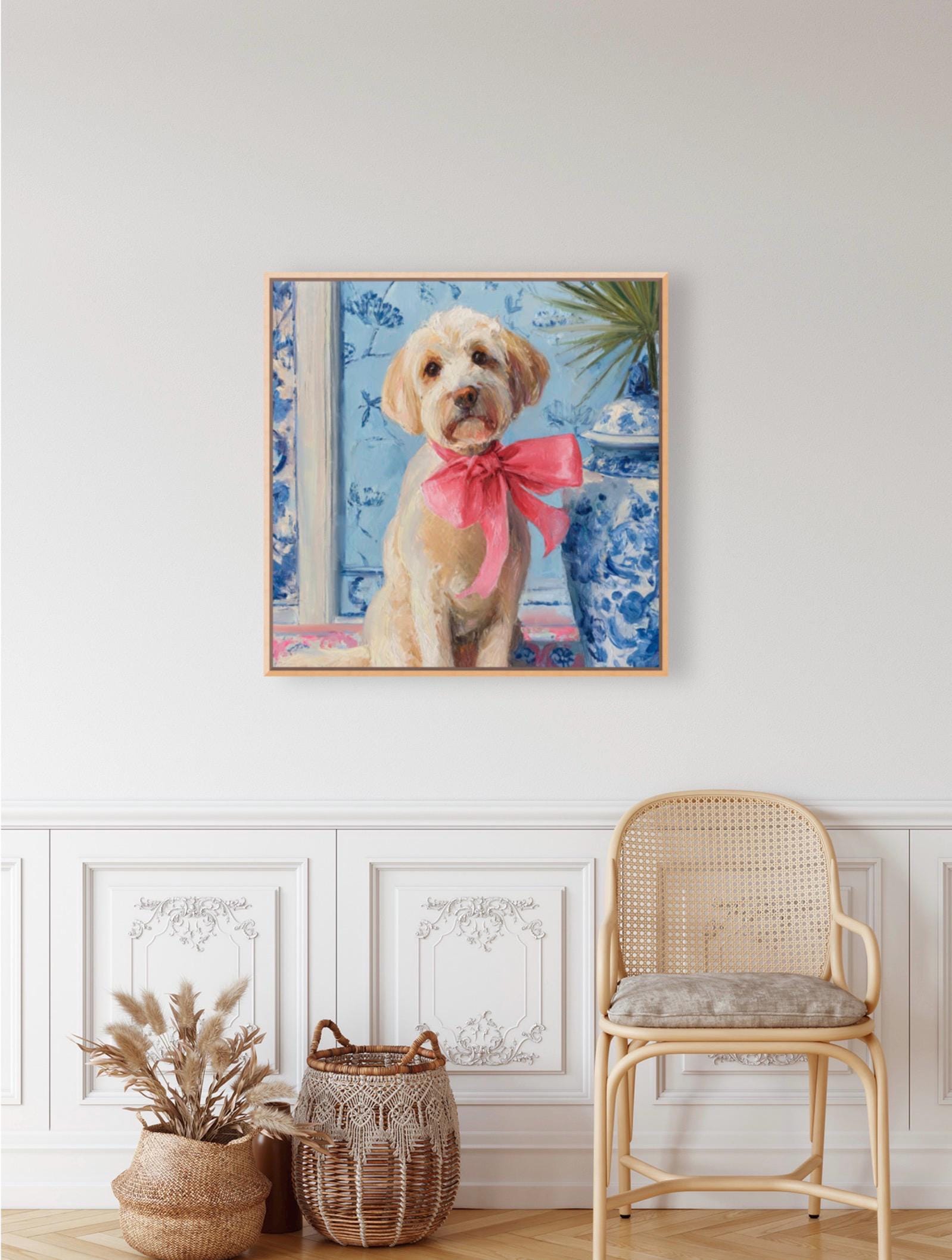 Grandmillennial art, A Pink Bow, Labradoodle in chinoiserie interior, whimsical dog art