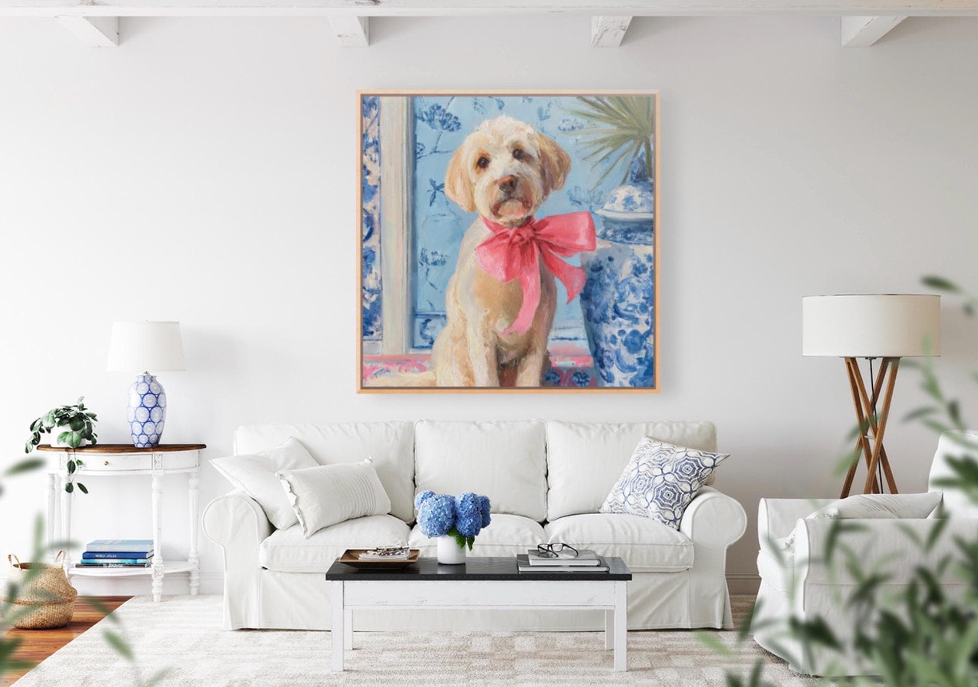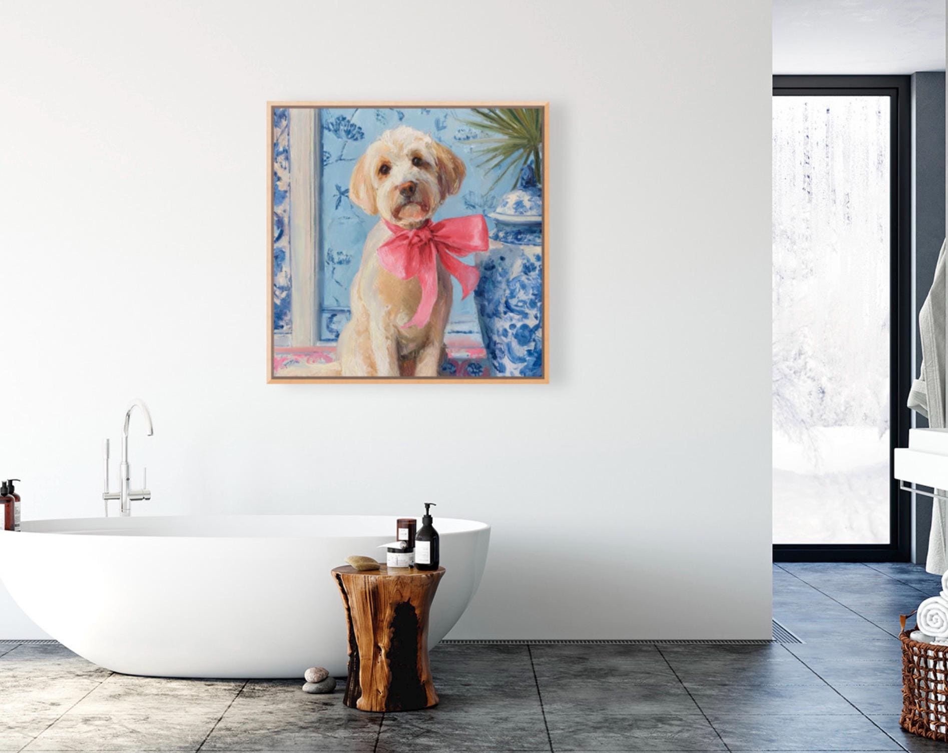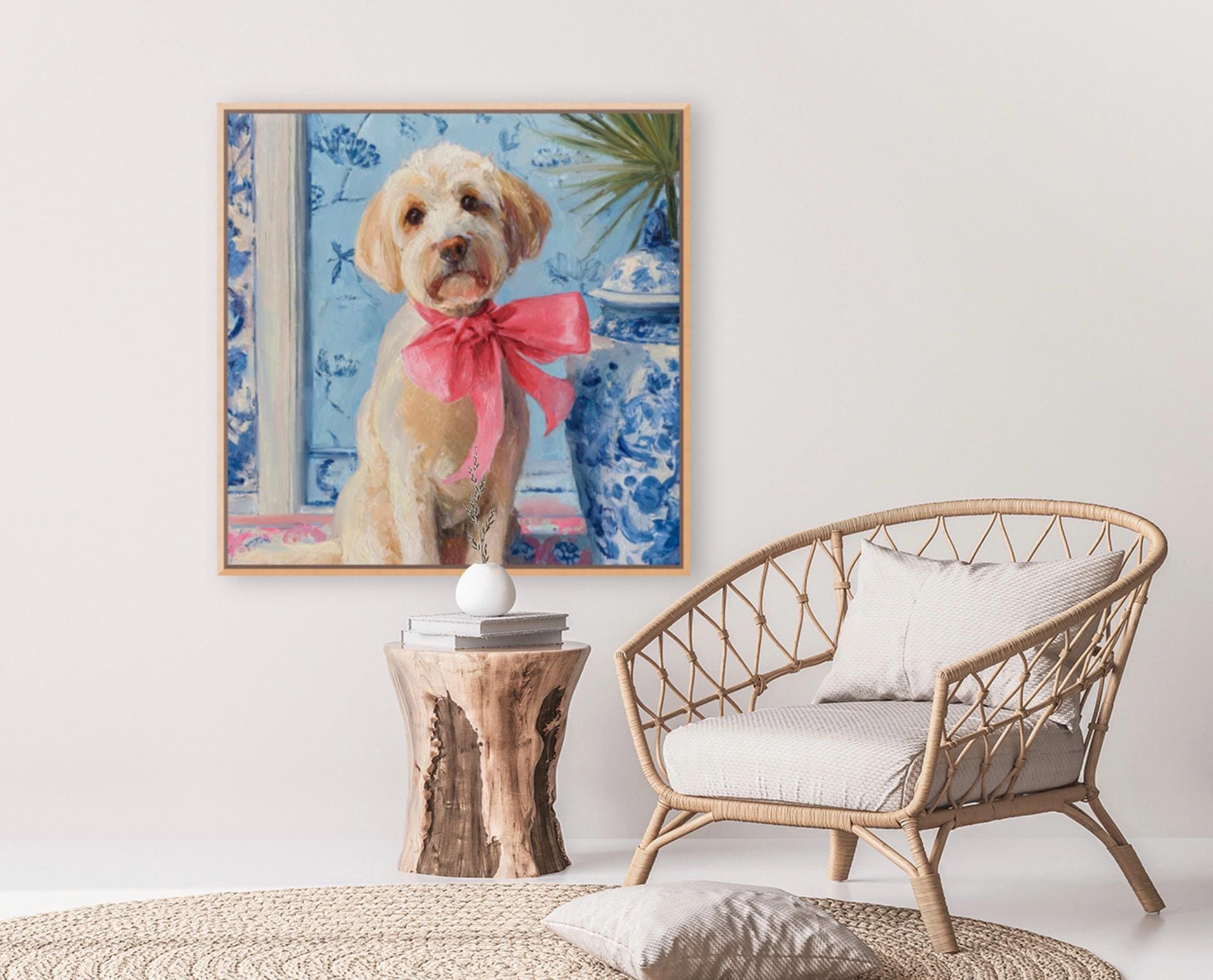 Grandmillennial art, A Pink Bow, Labradoodle in chinoiserie interior, whimsical dog art