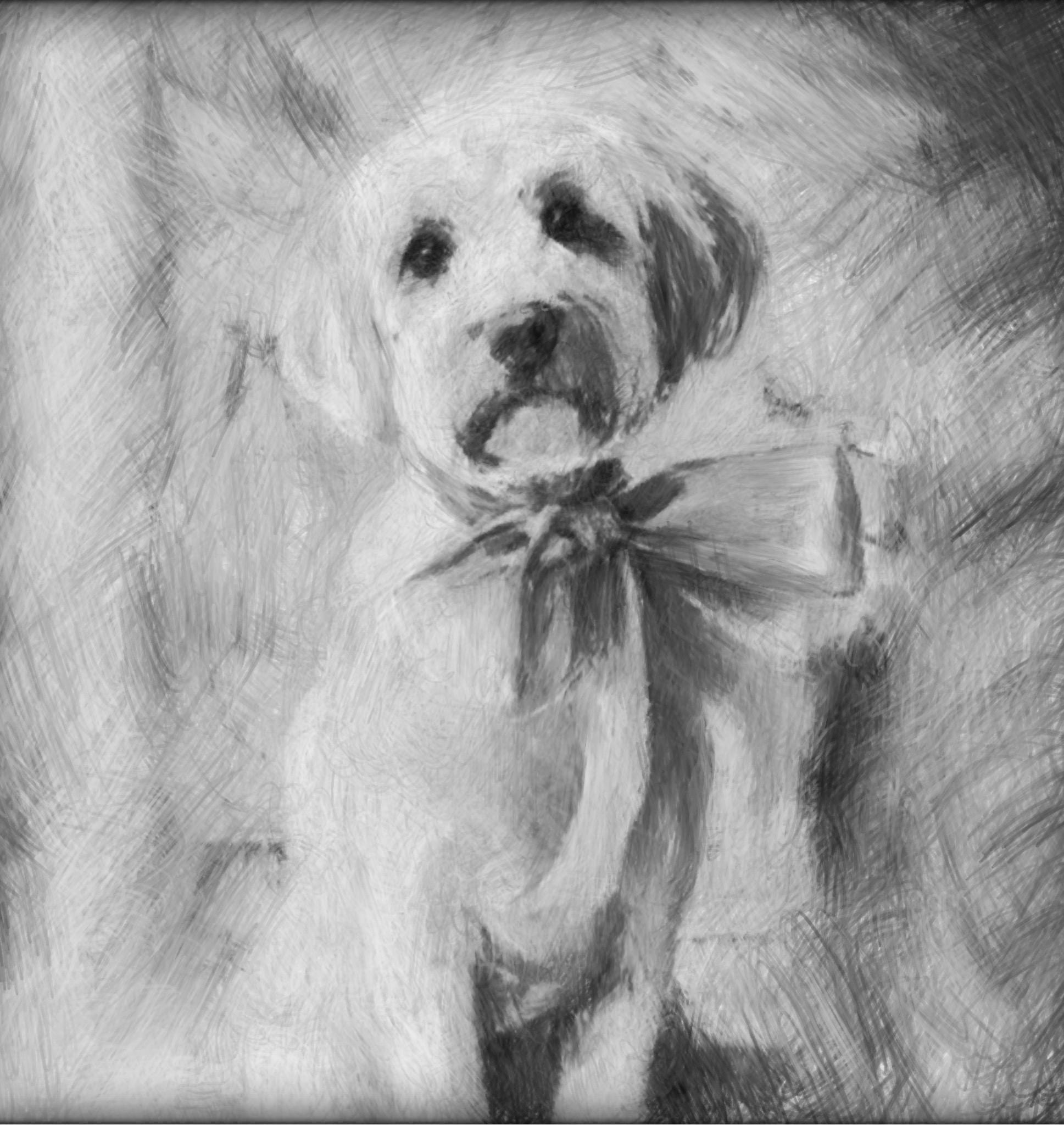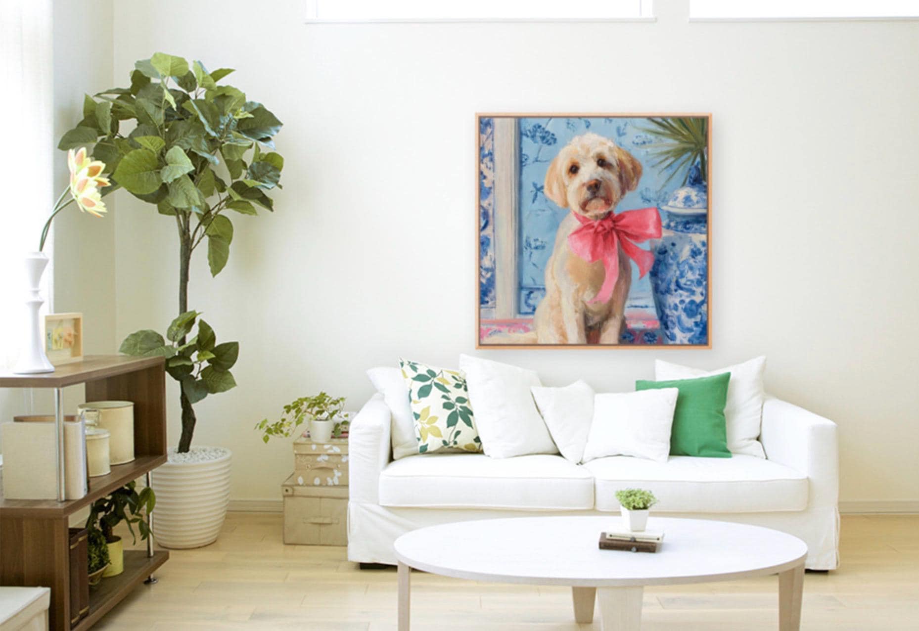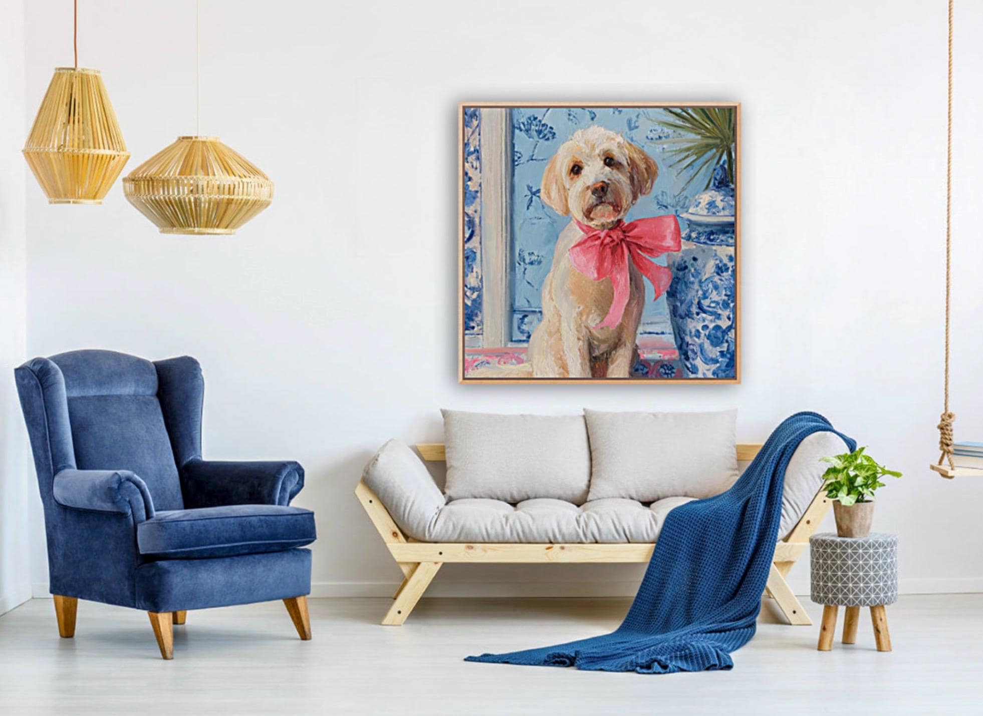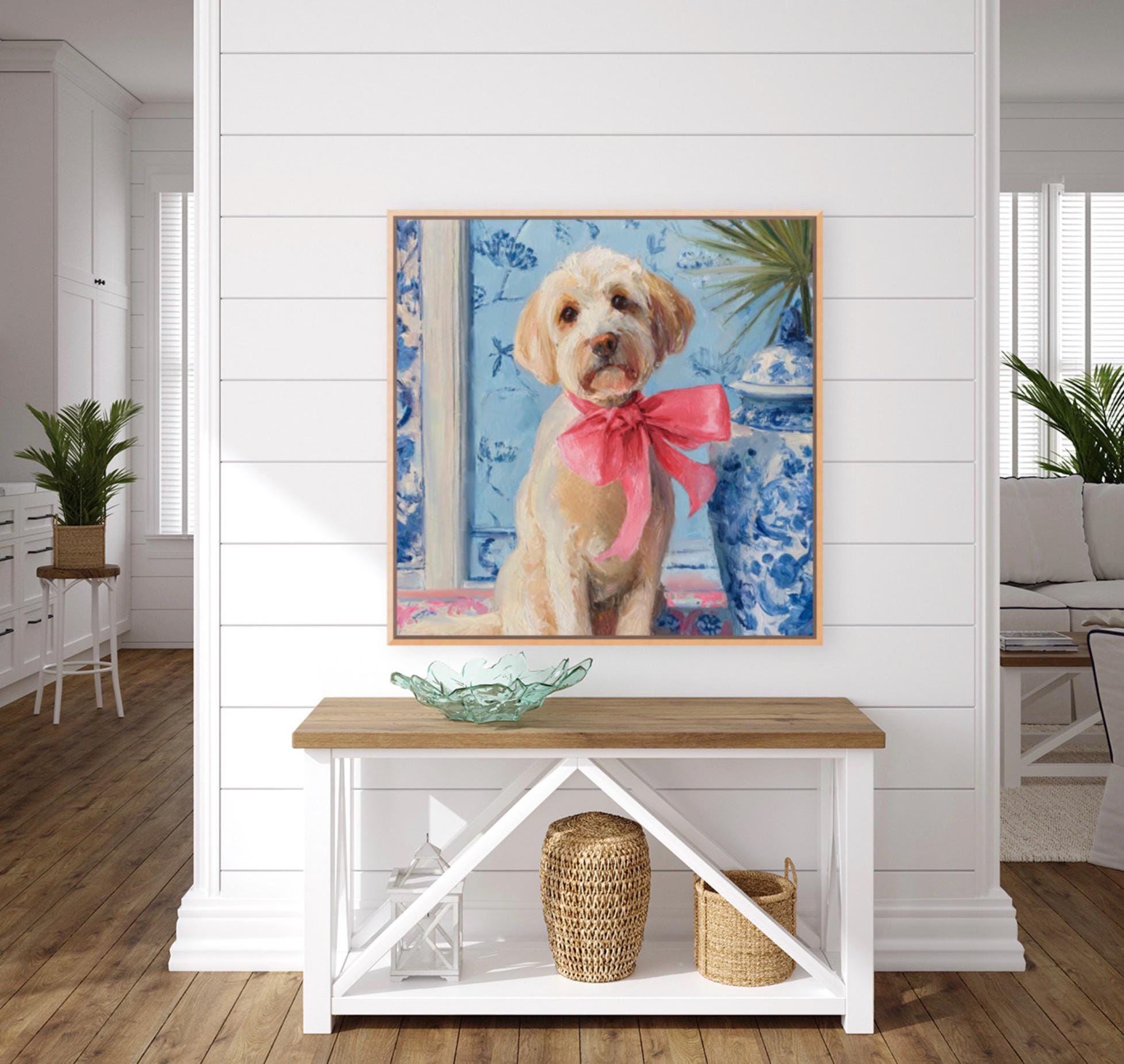 Grandmillennial art, A Pink Bow, Labradoodle in chinoiserie interior, whimsical dog art