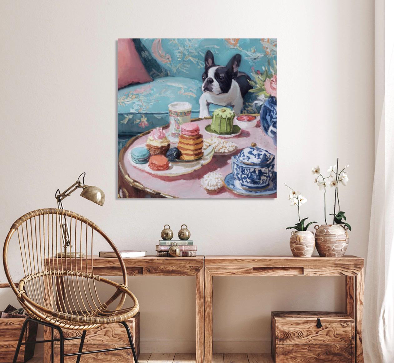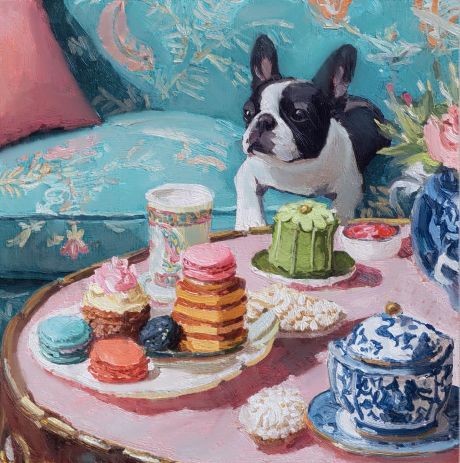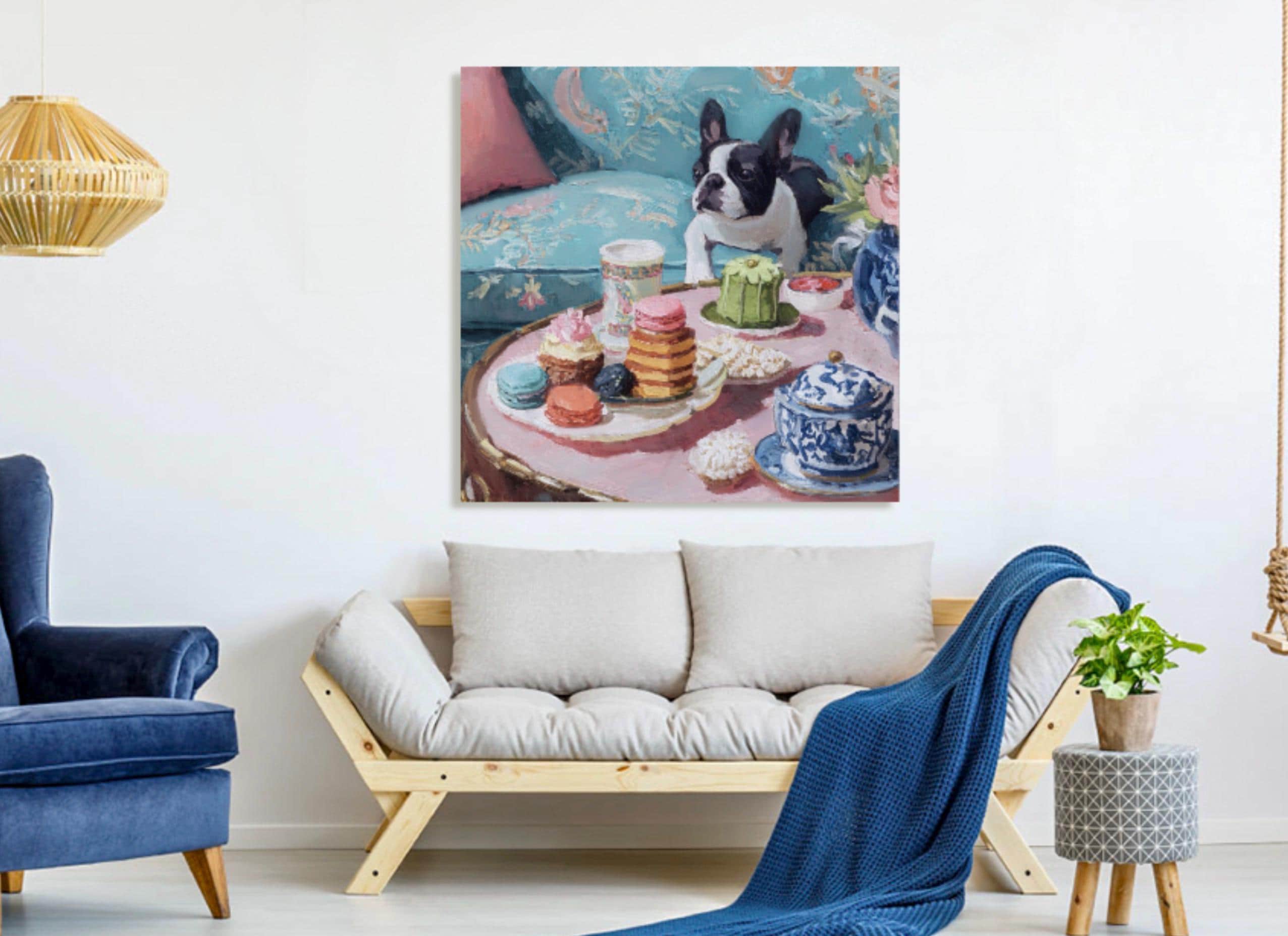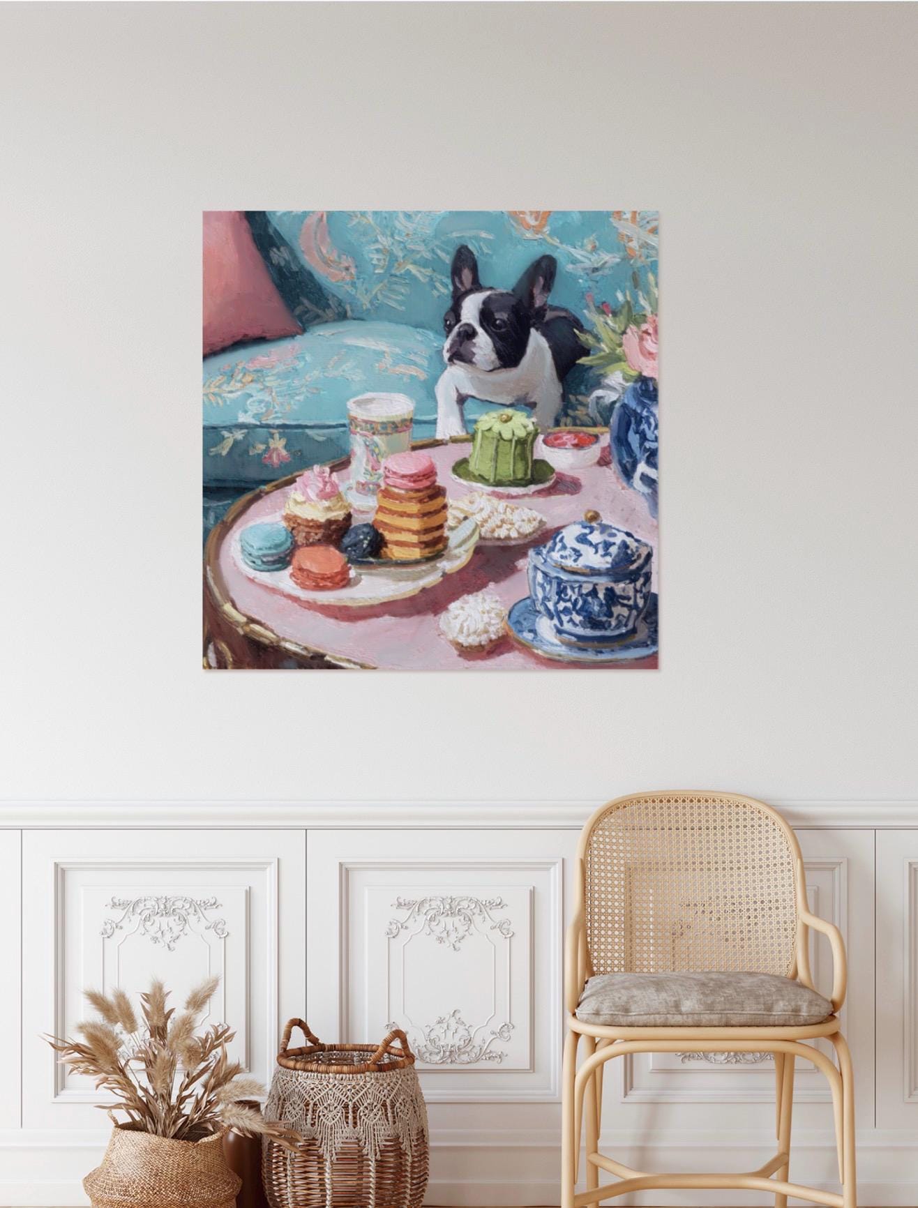Grandmillennial art, Frenchie, cakes, and macaroons, whimsical dogs art