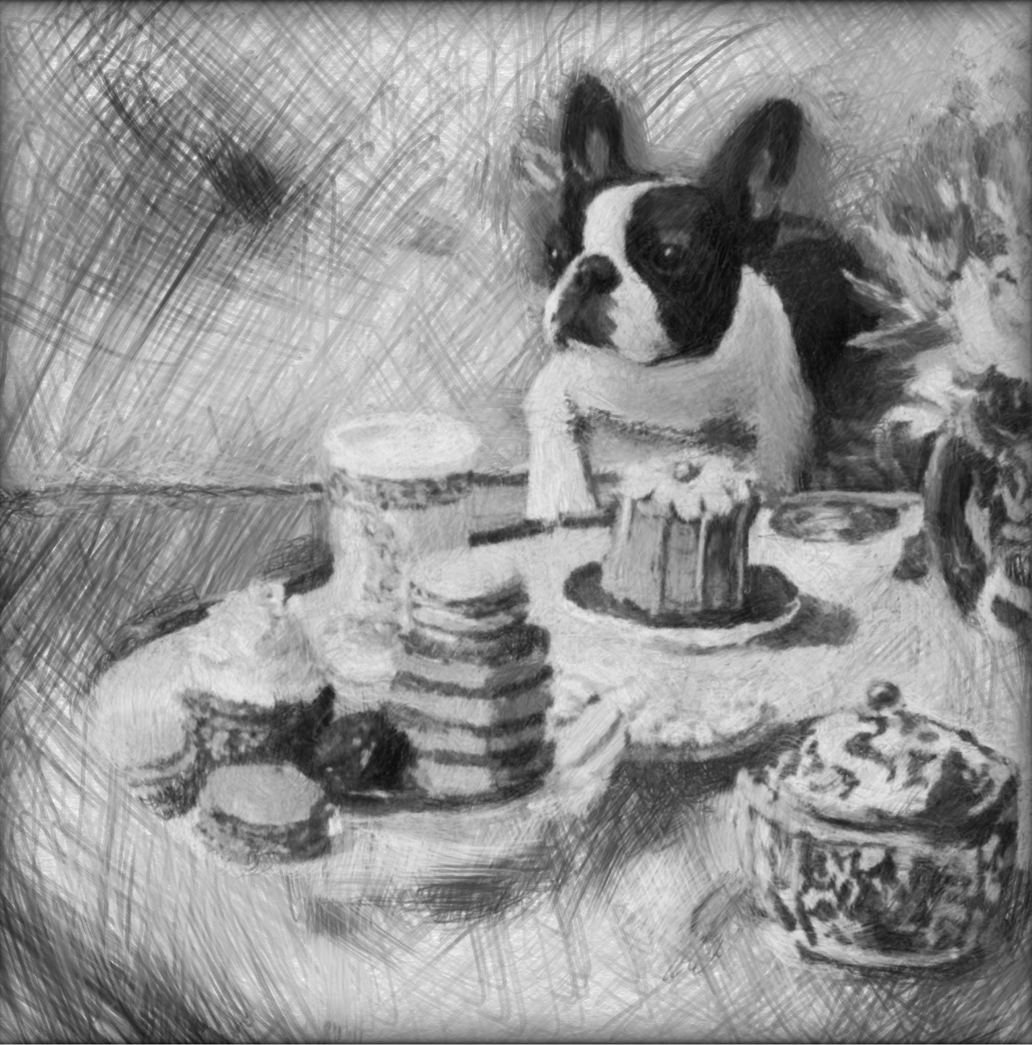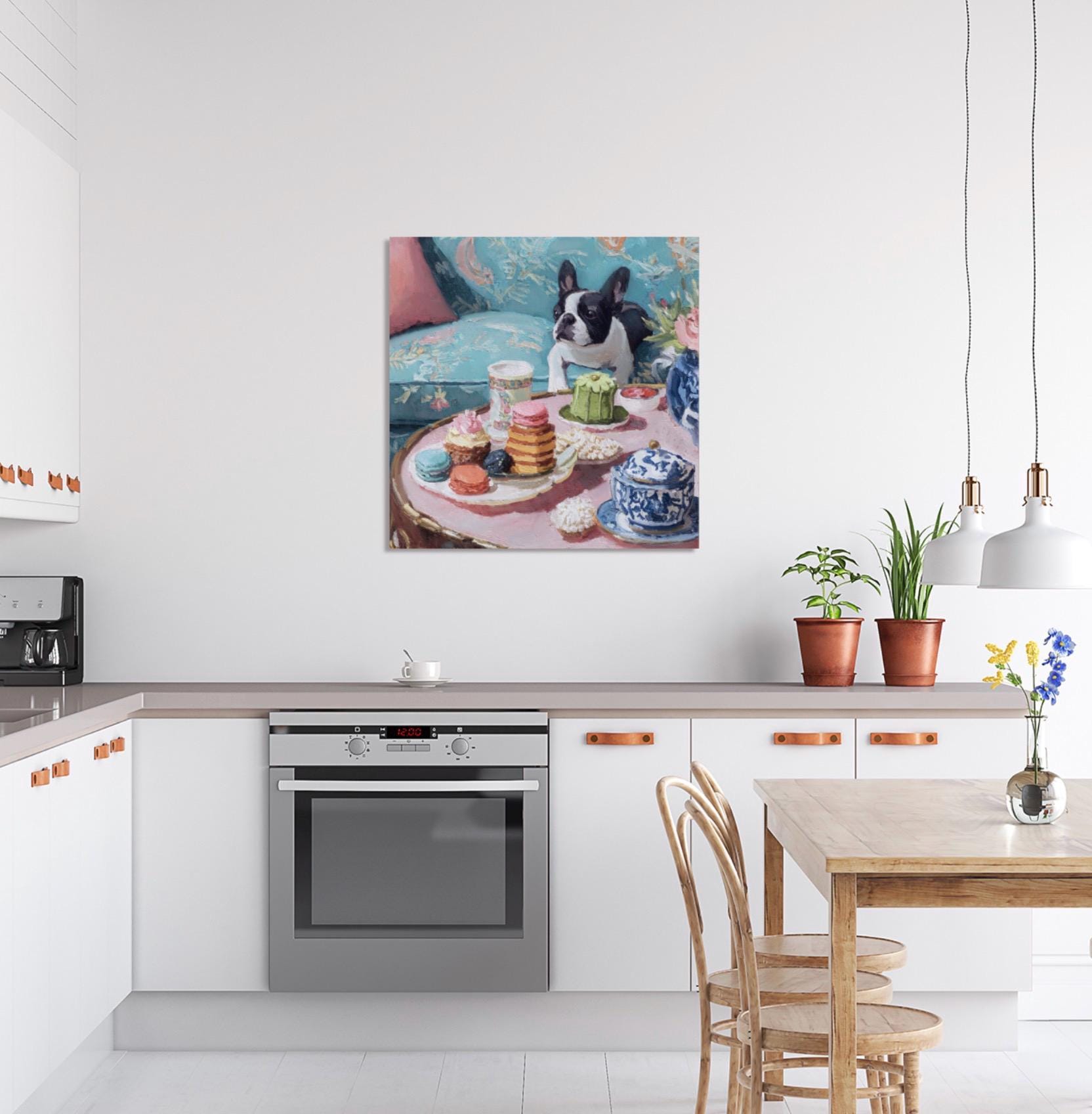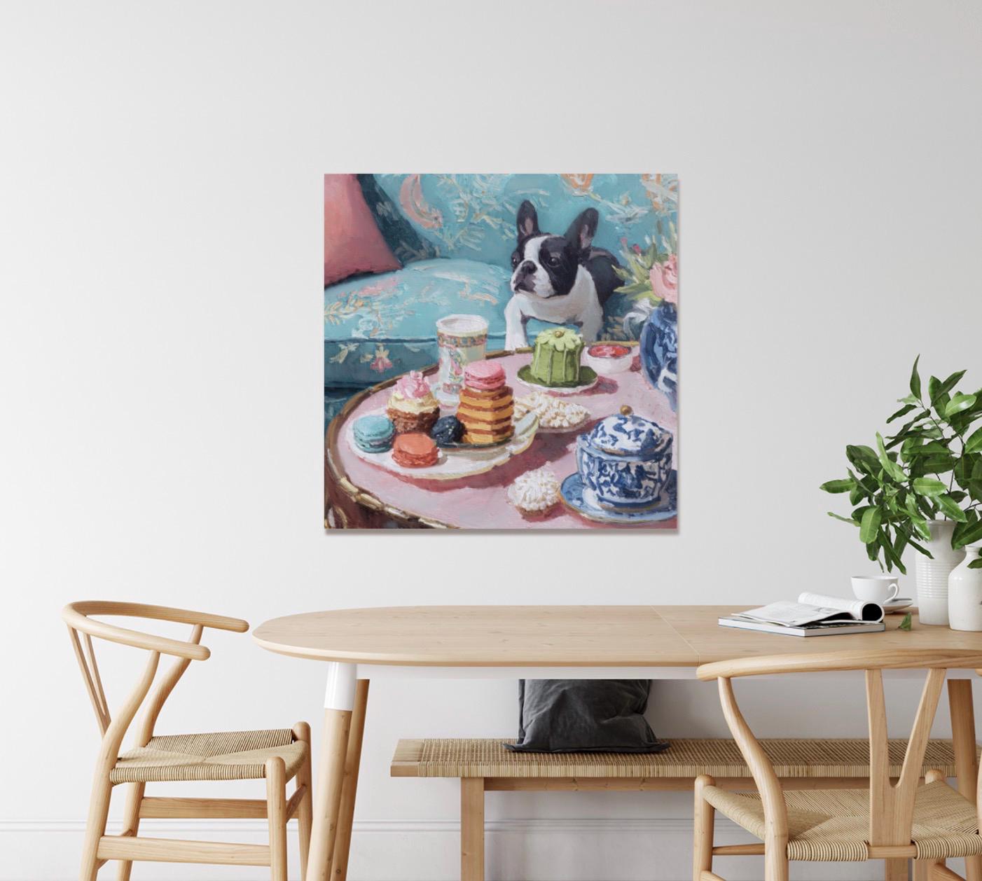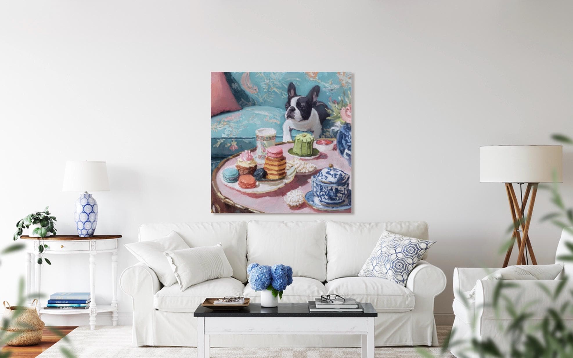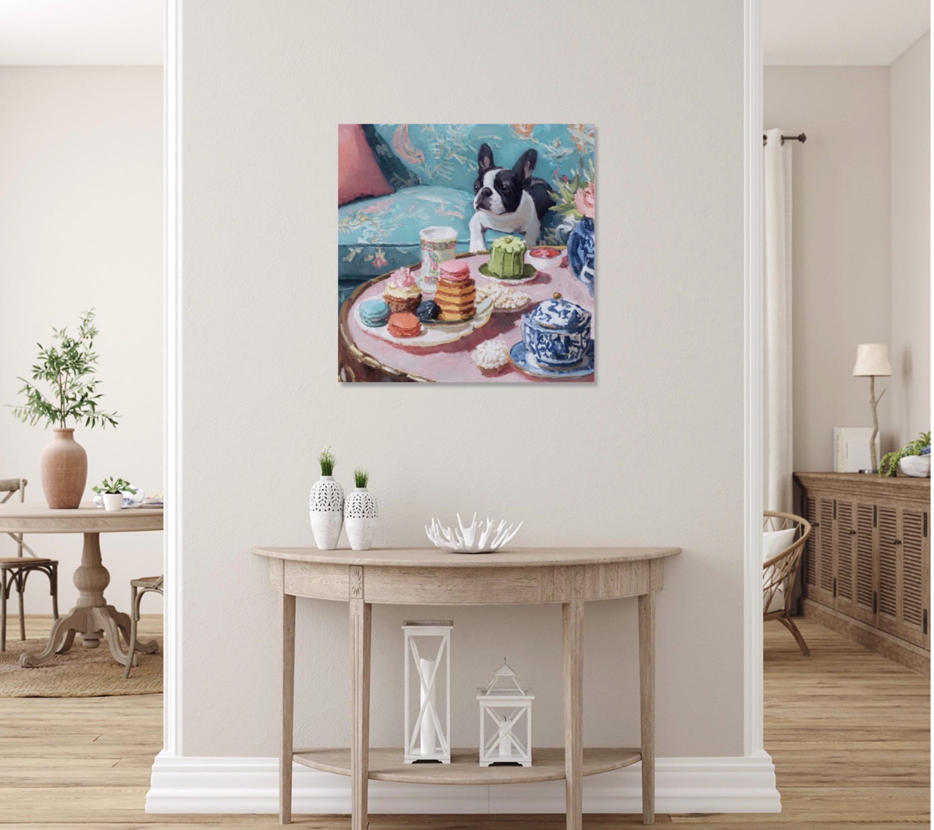 Grandmillennial art, Frenchie, cakes, and macaroons, whimsical dogs art