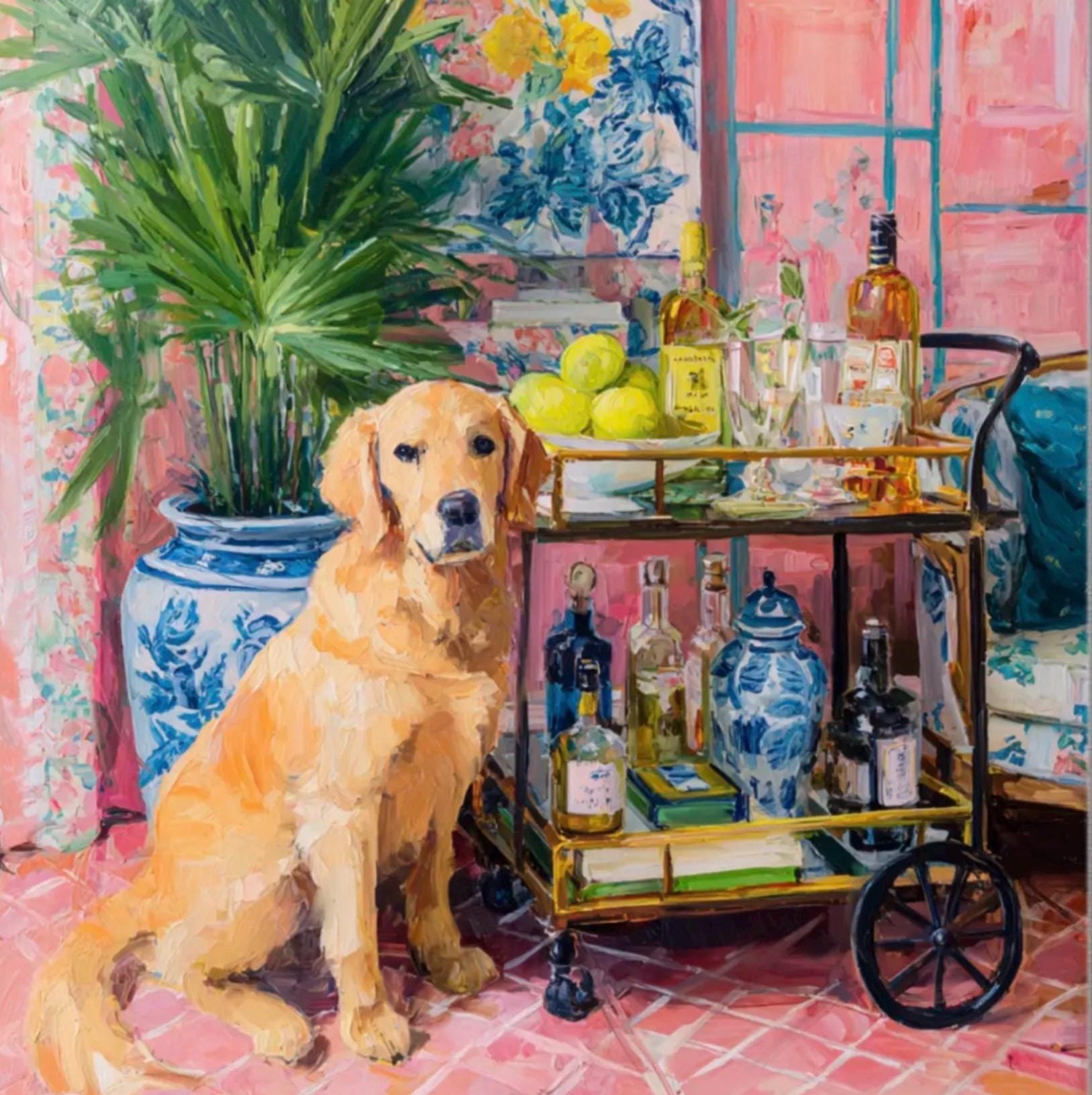 Custom print for Kerri, Golden Retriever cocktail scene: Palm Beach dog giclee print, 36x36”
