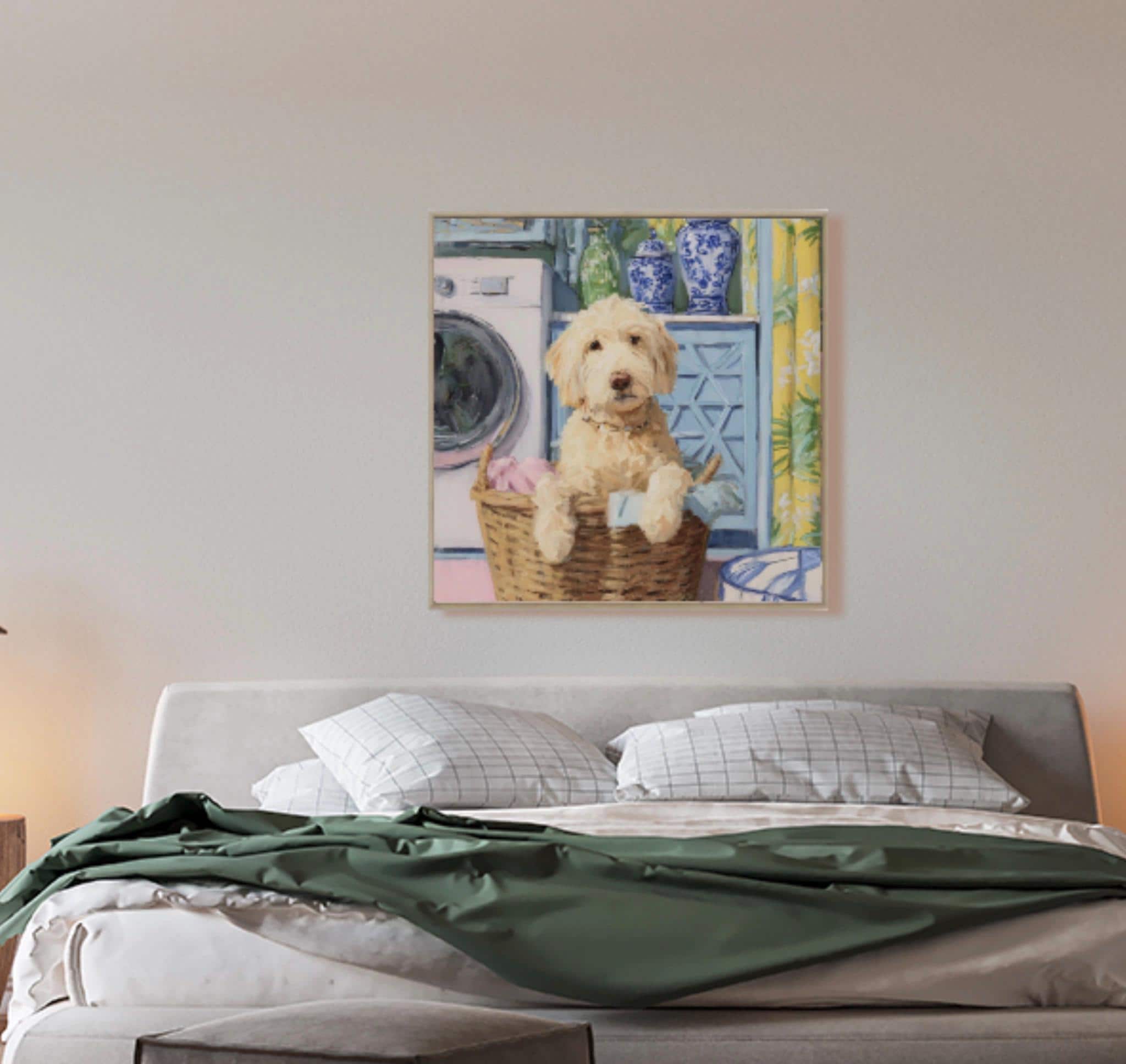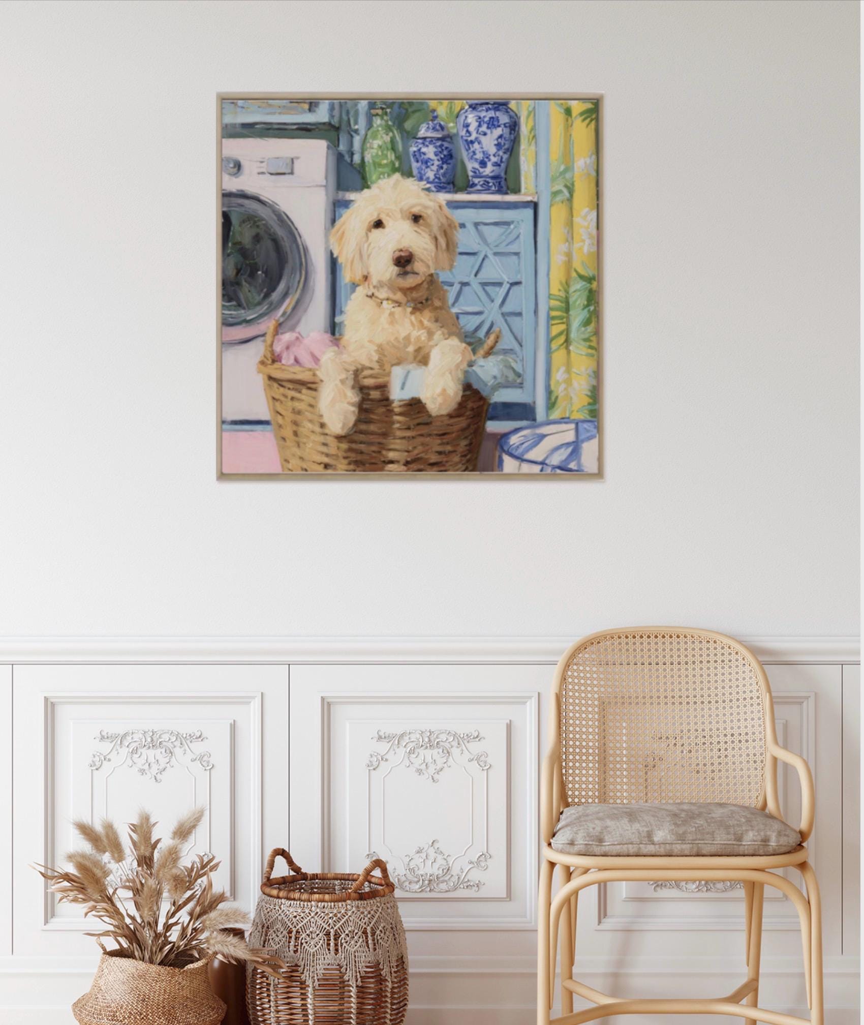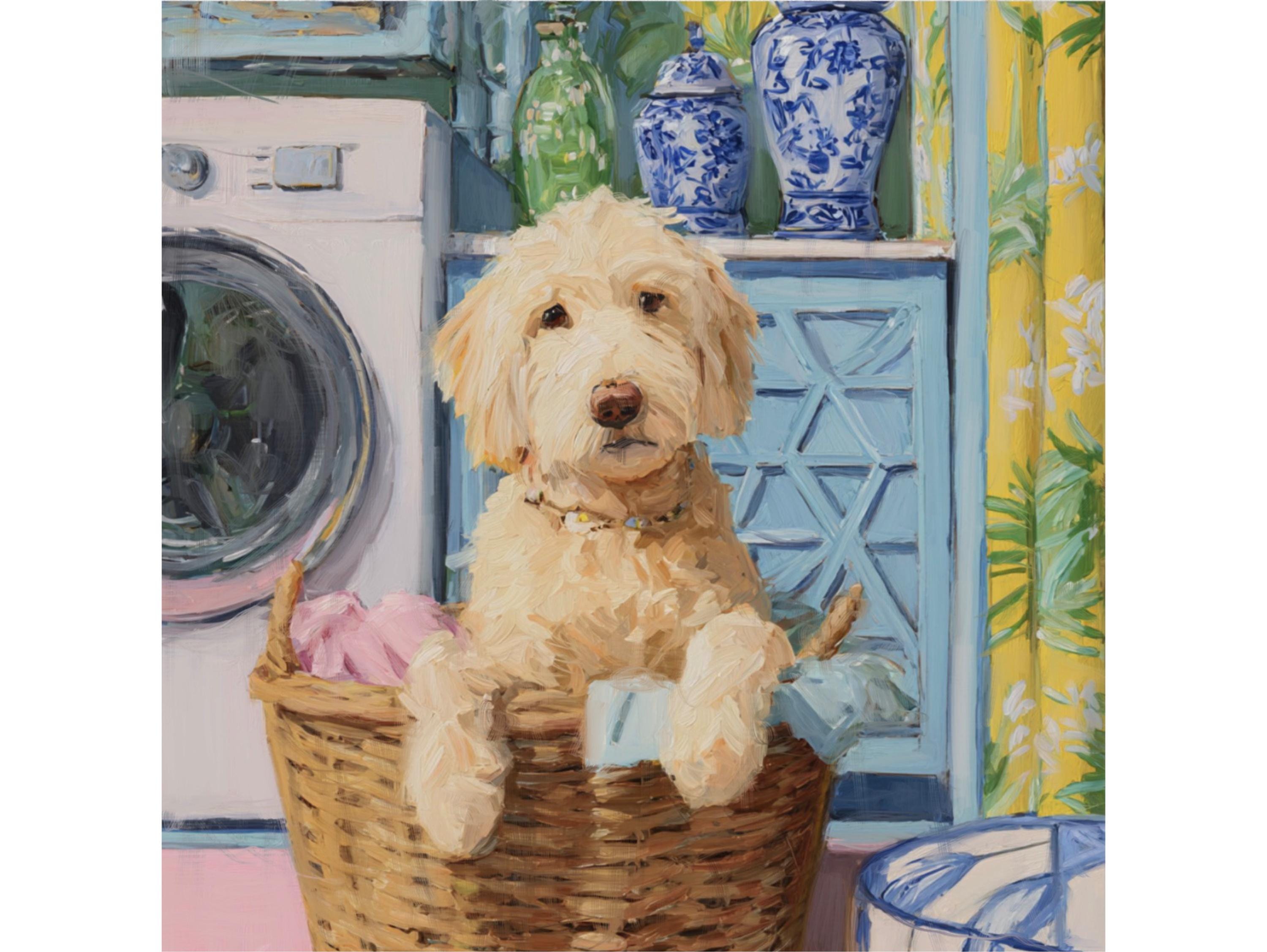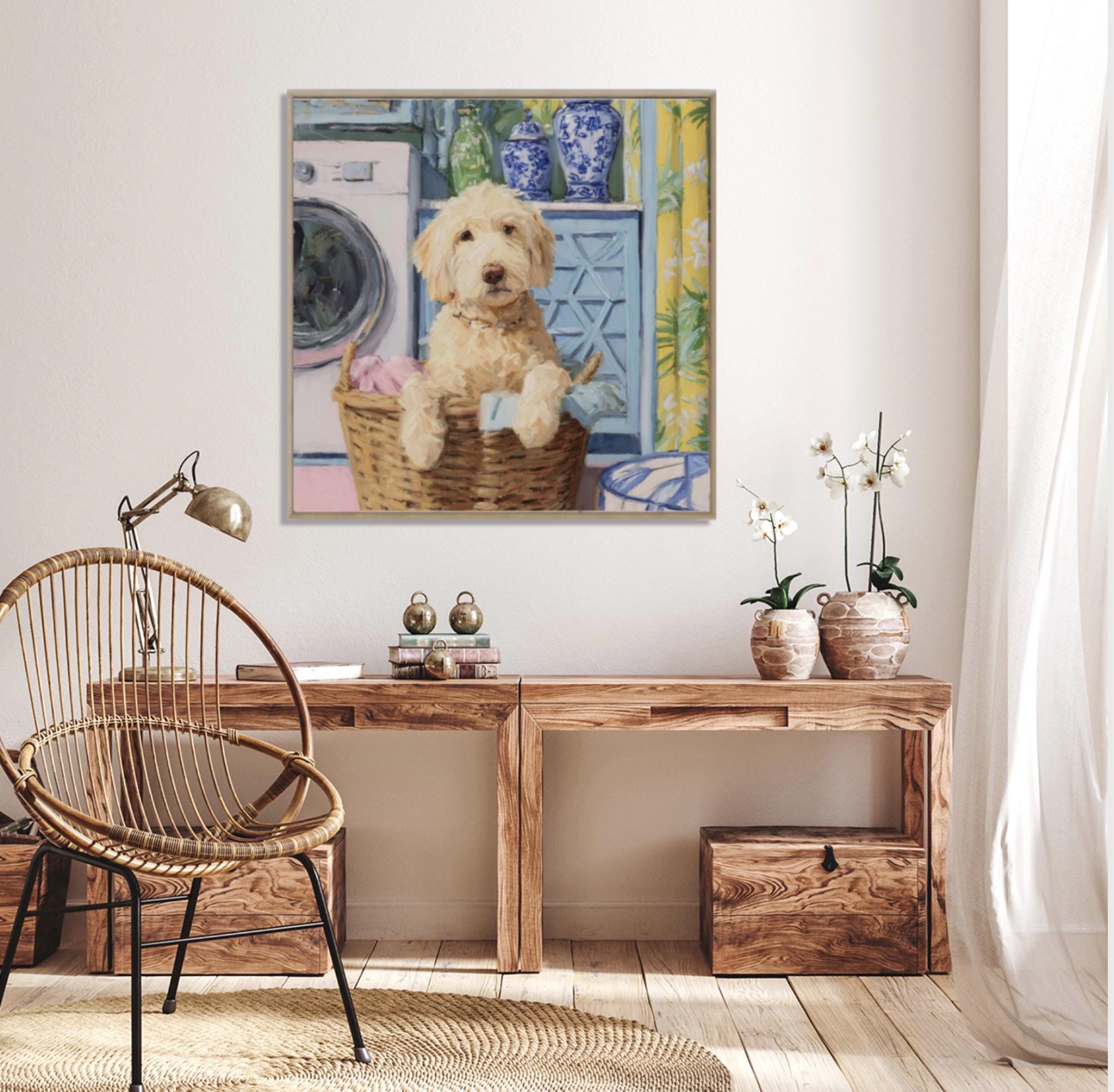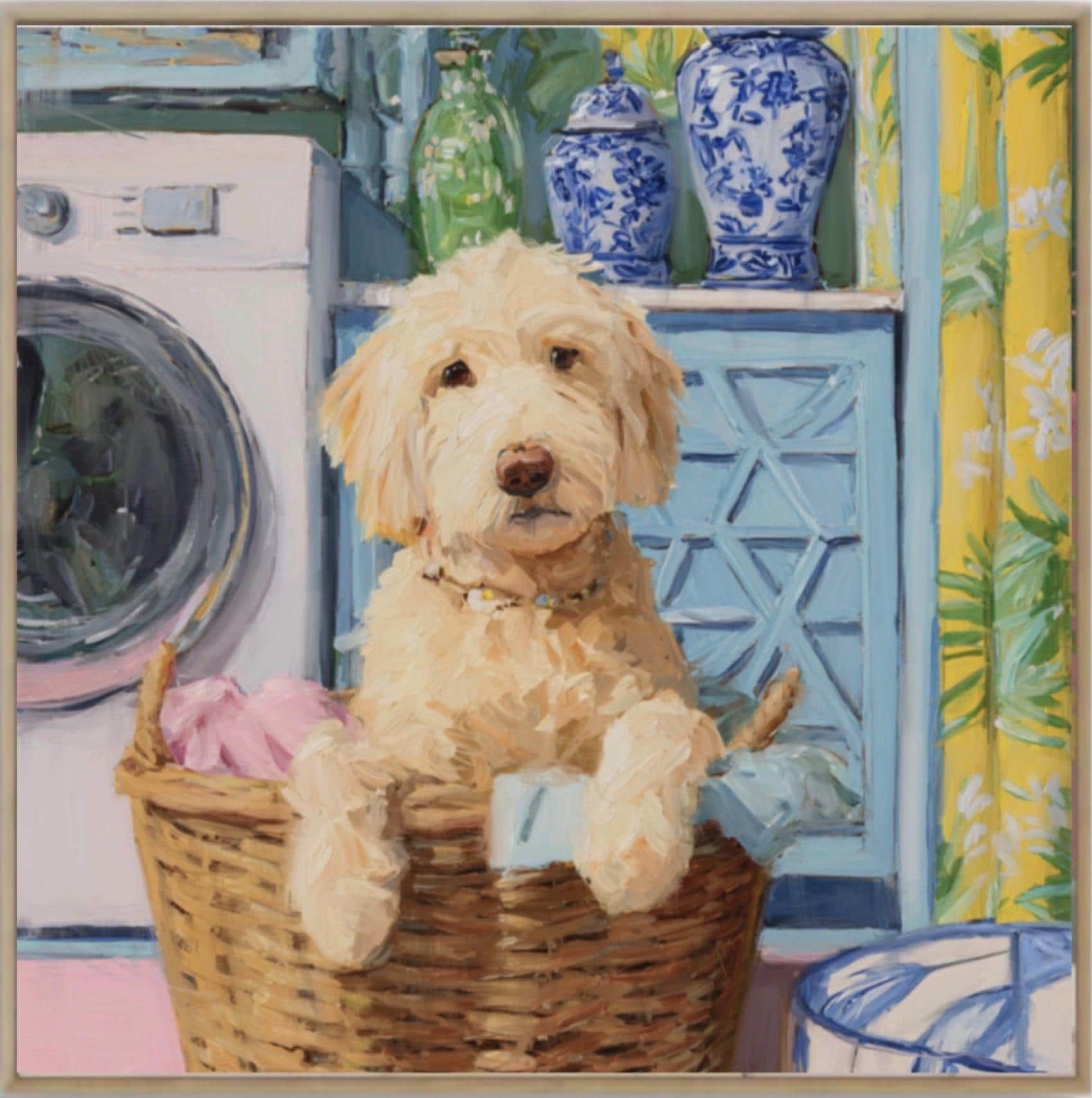 Grandmillennial art, Golden Doodle in laundry basket, preppy laundry room art