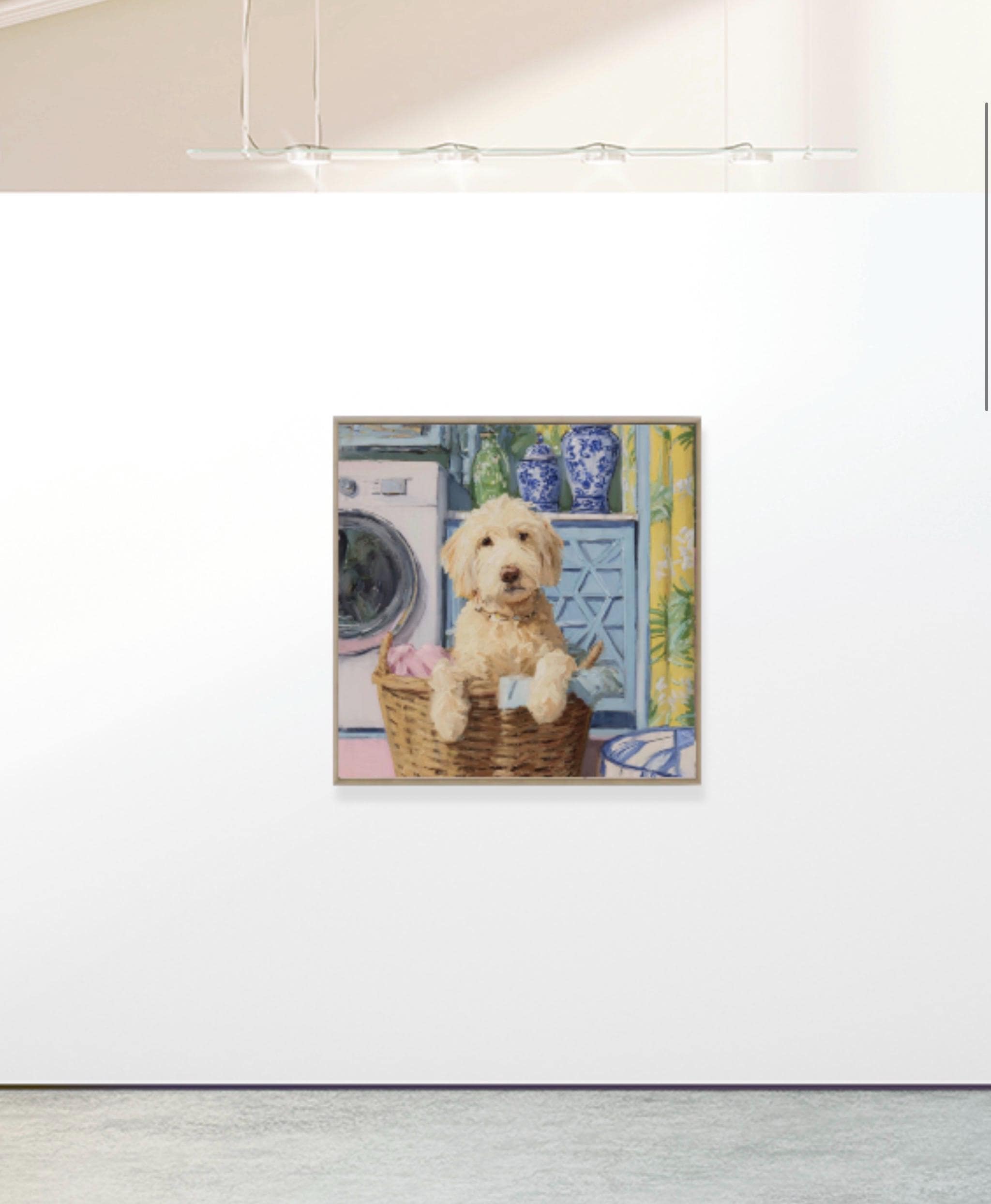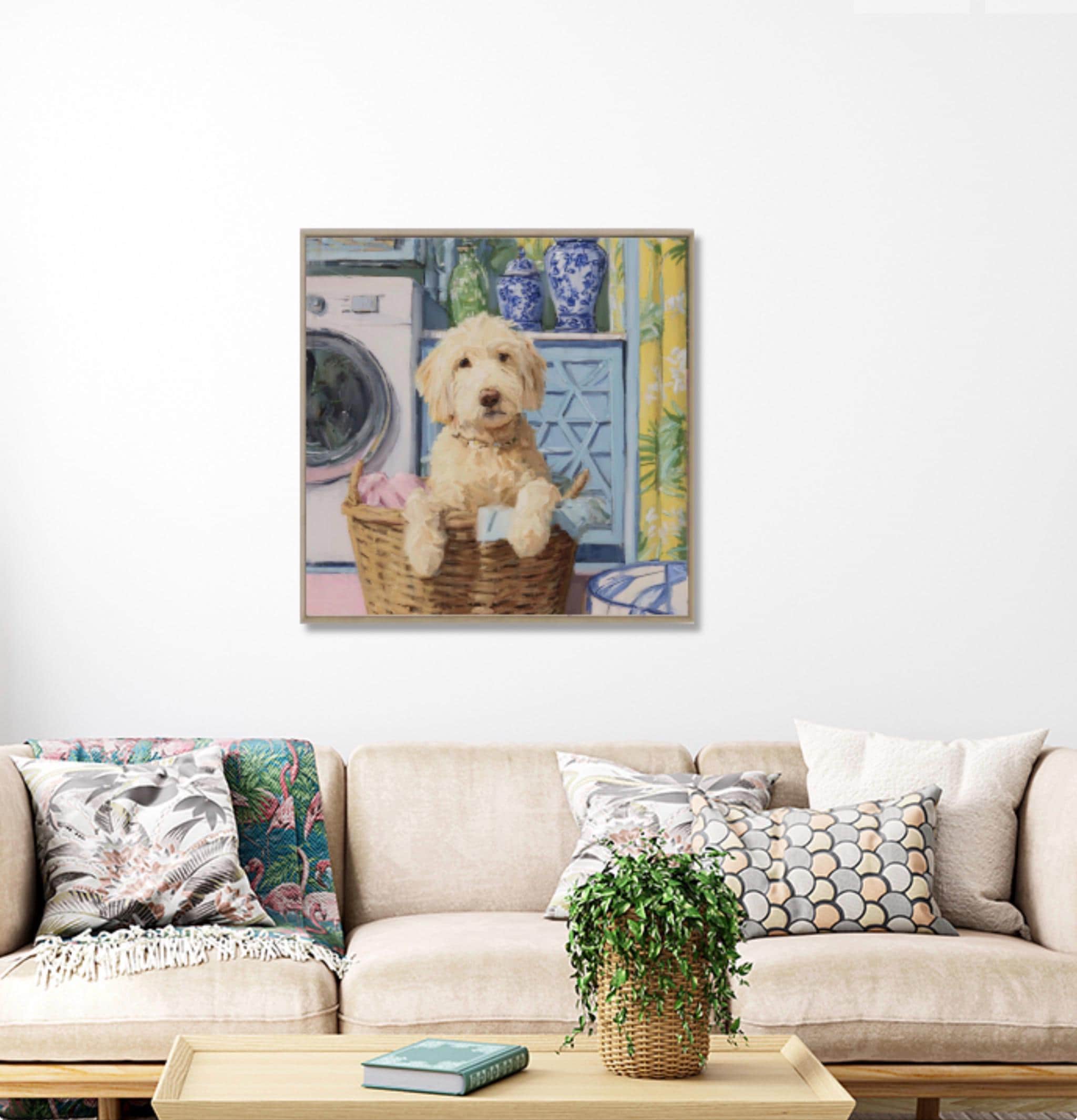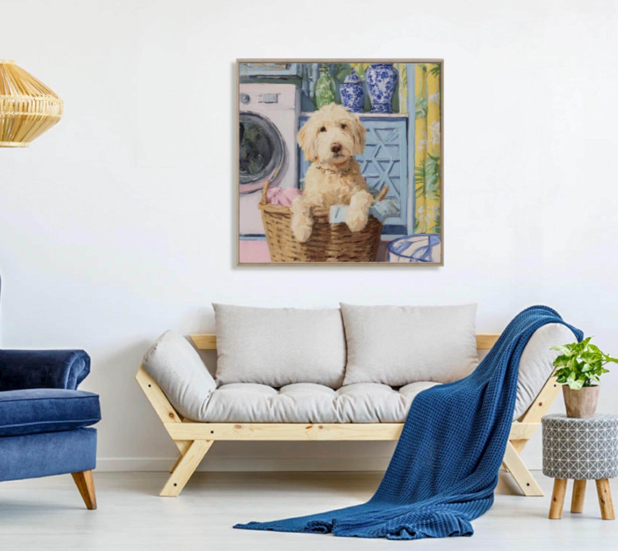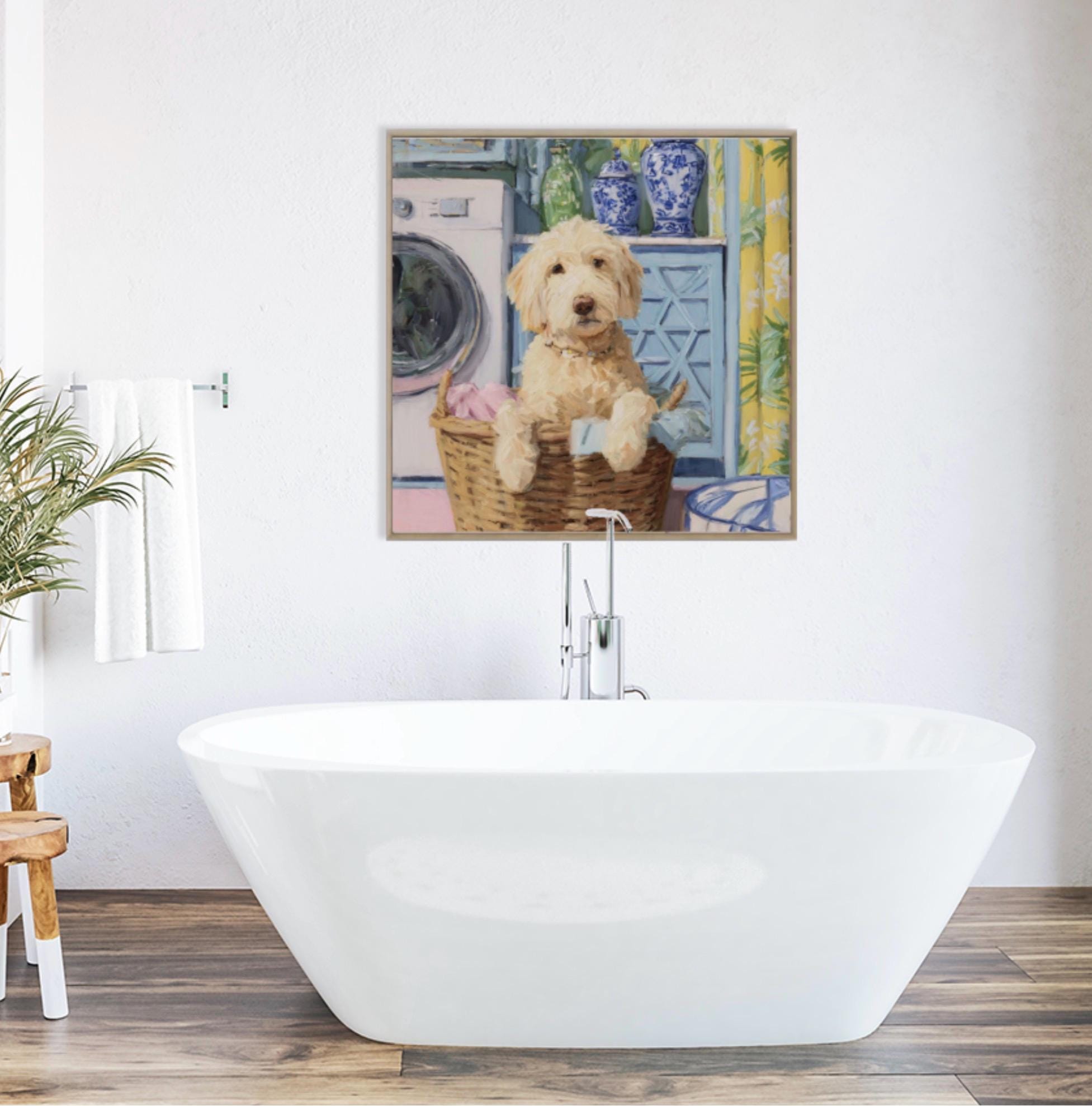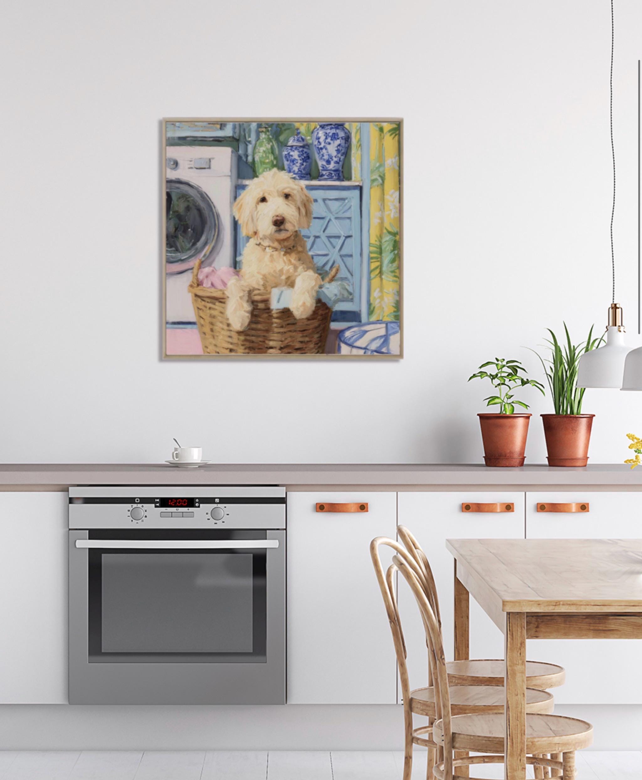 Grandmillennial art, Golden Doodle in laundry basket, preppy laundry room art