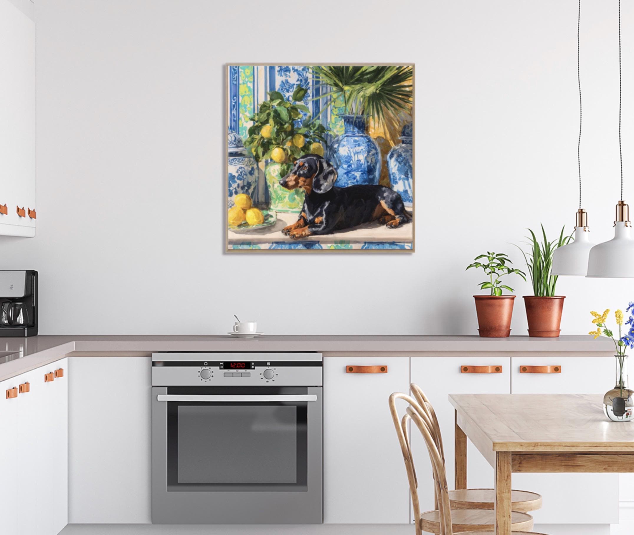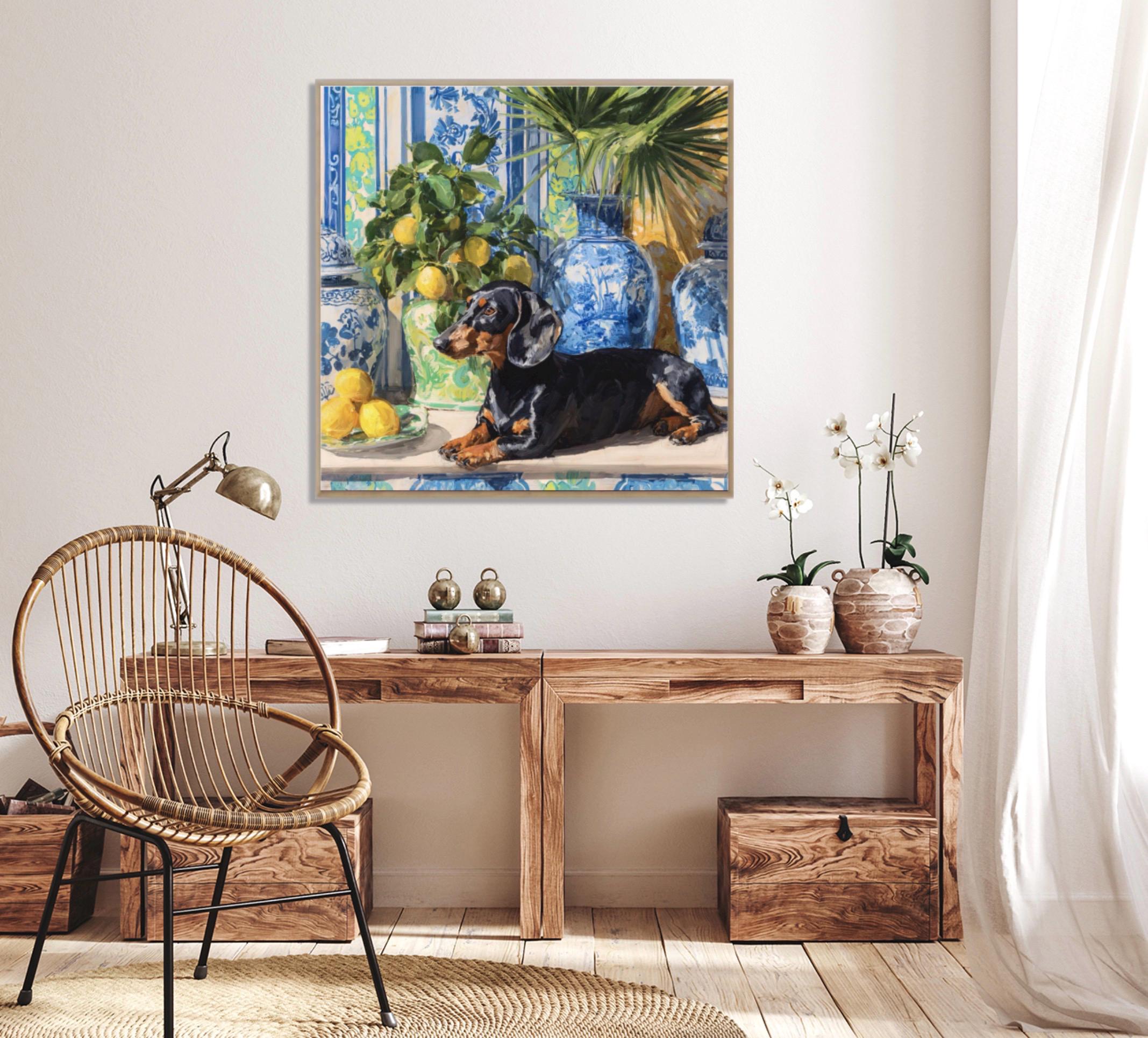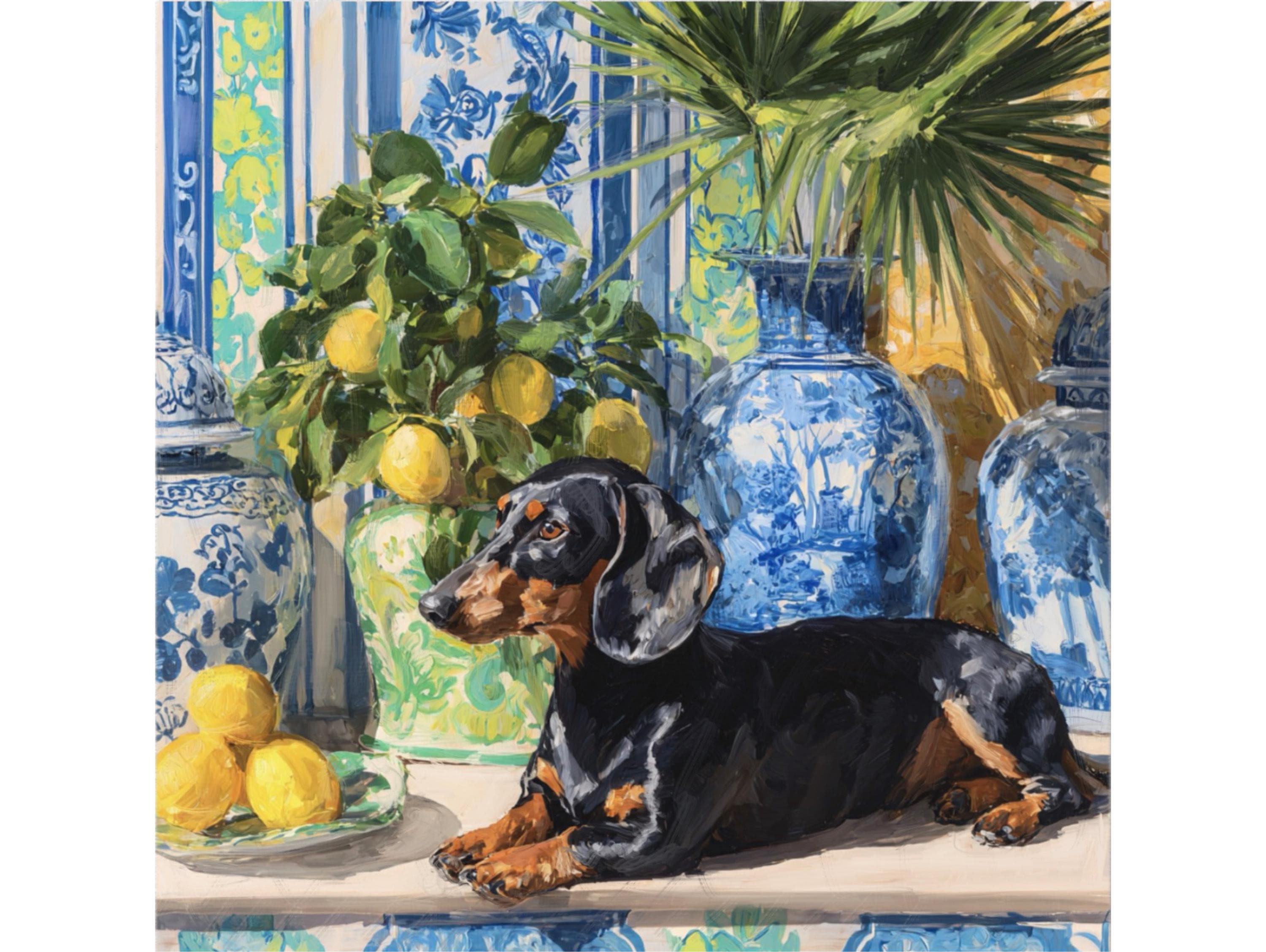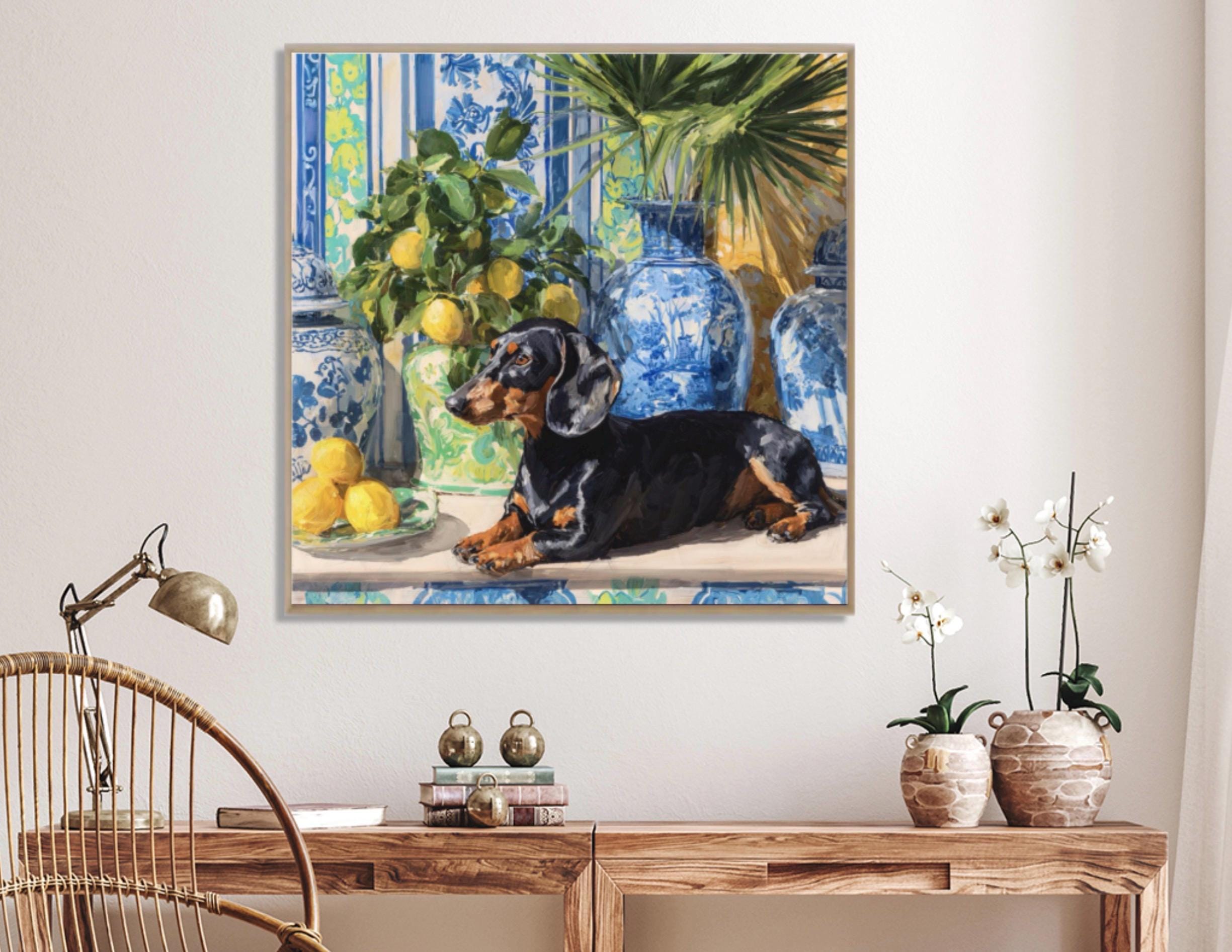 Grandmillennial art, Dachshund and lemons in chinoiserie room, preppy whimsical dog print