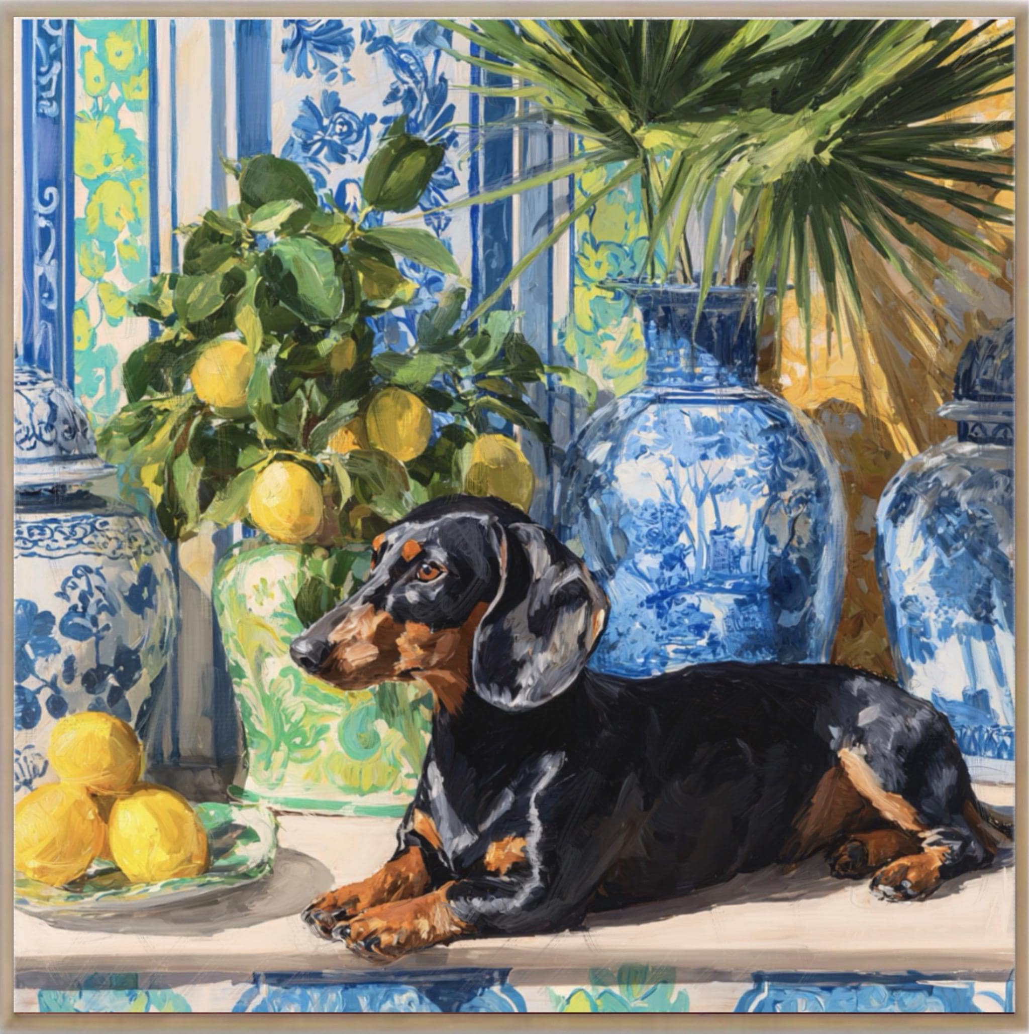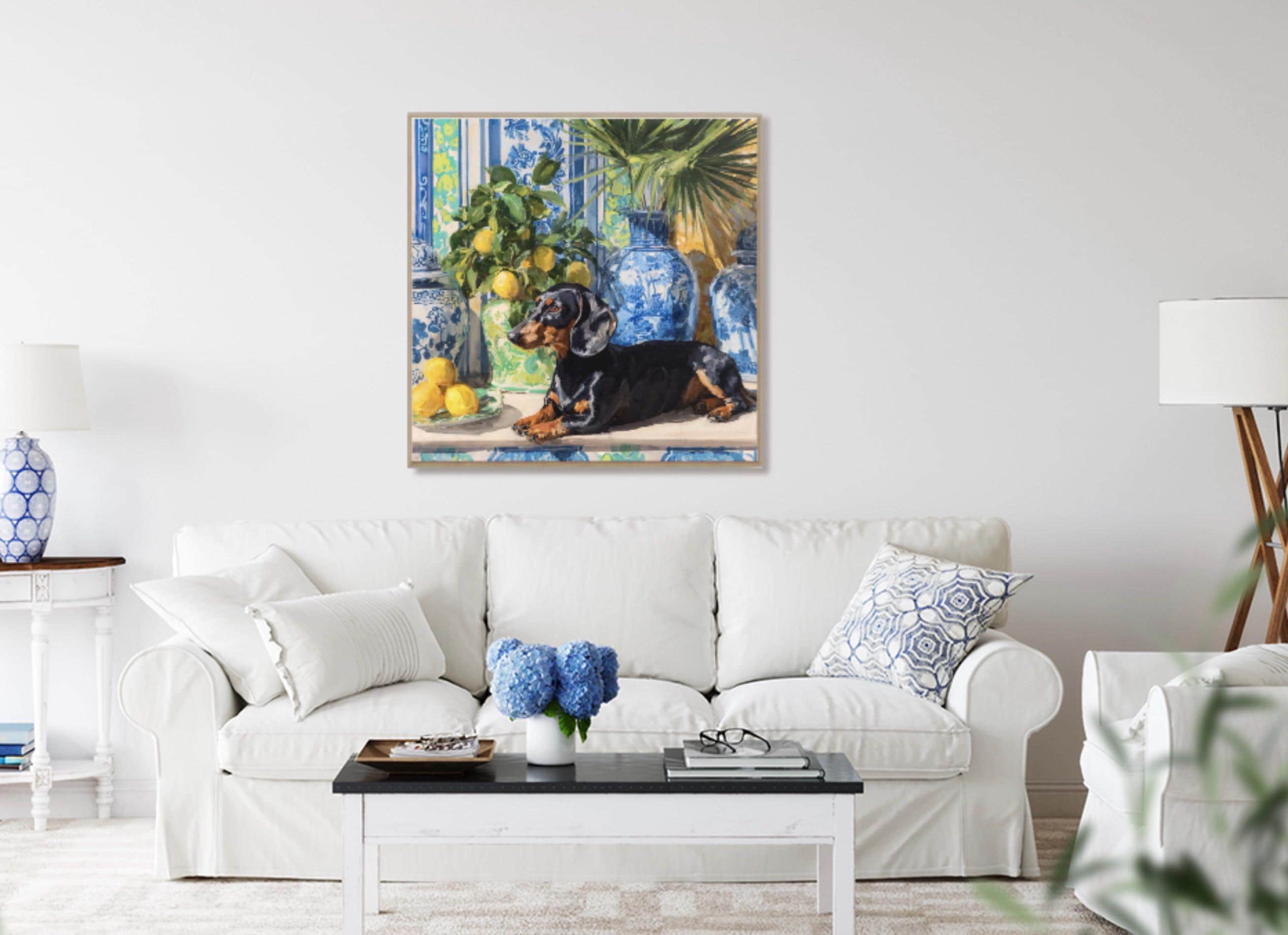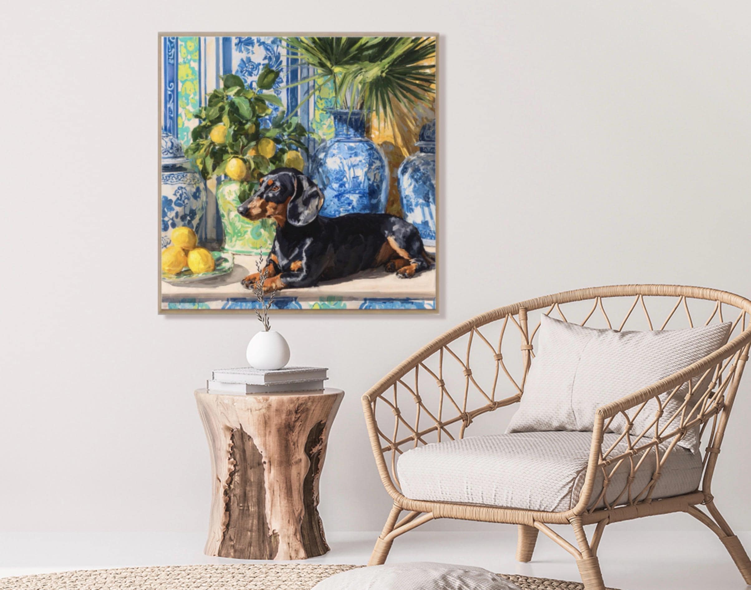 Grandmillennial art, Dachshund and lemons in chinoiserie room, preppy whimsical dog print
