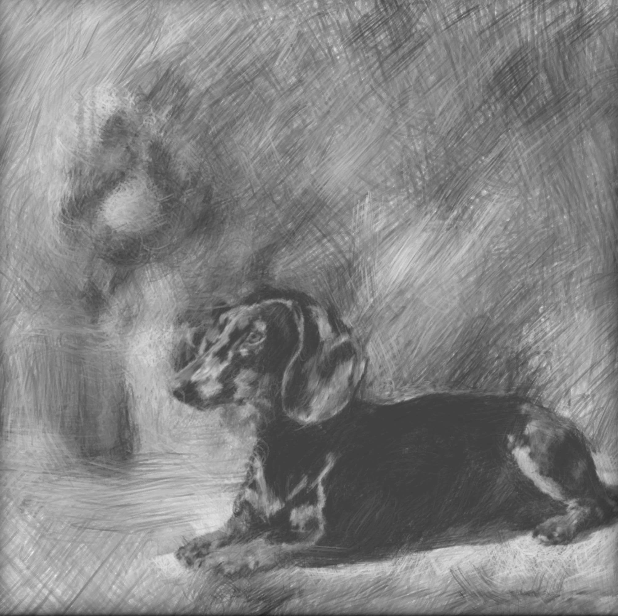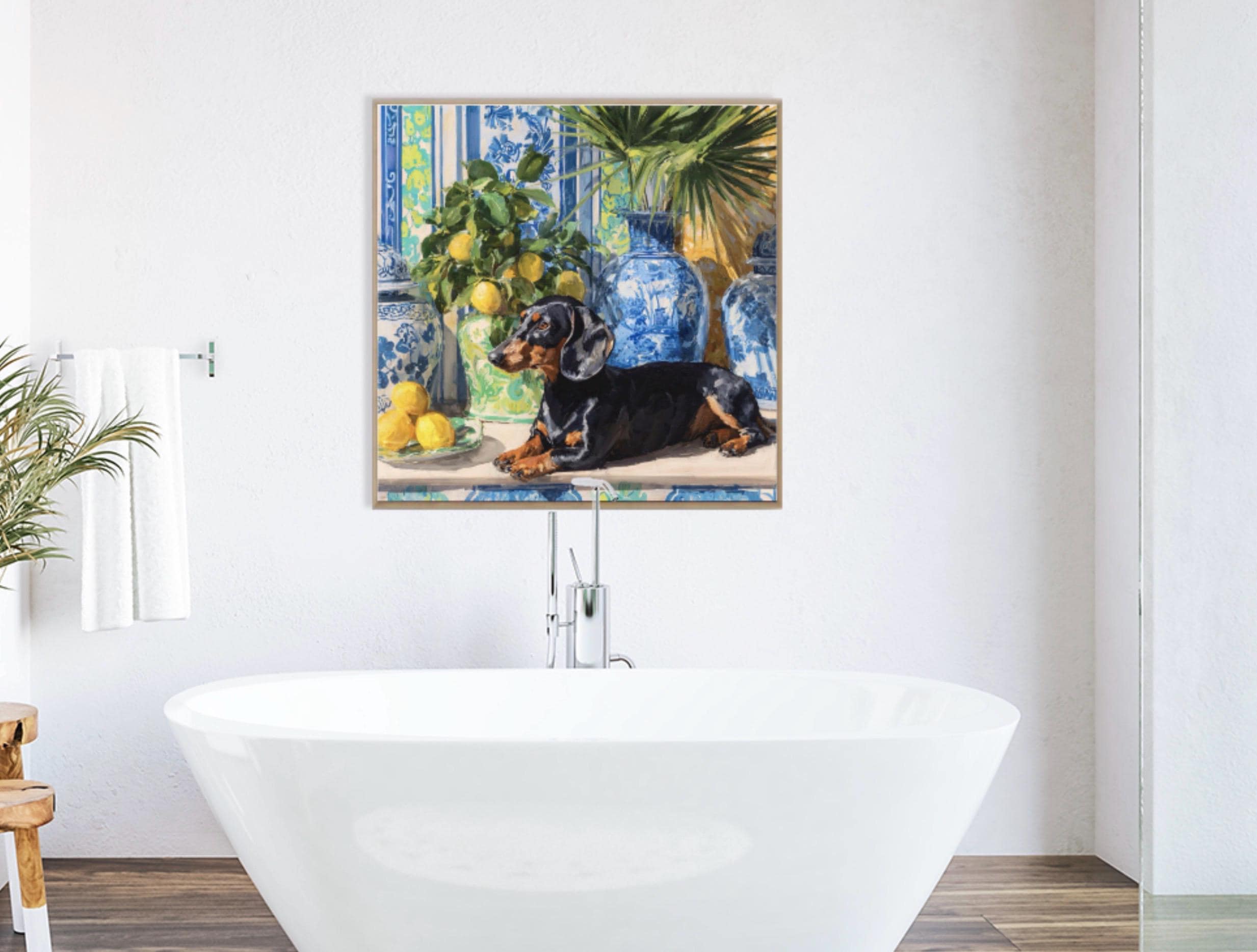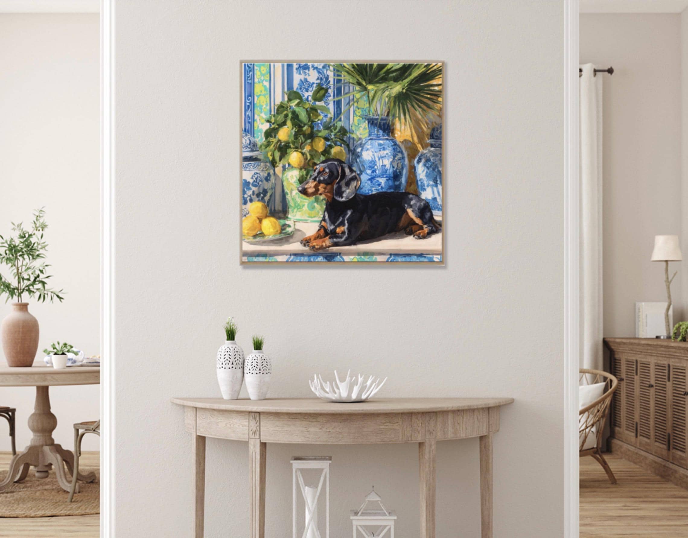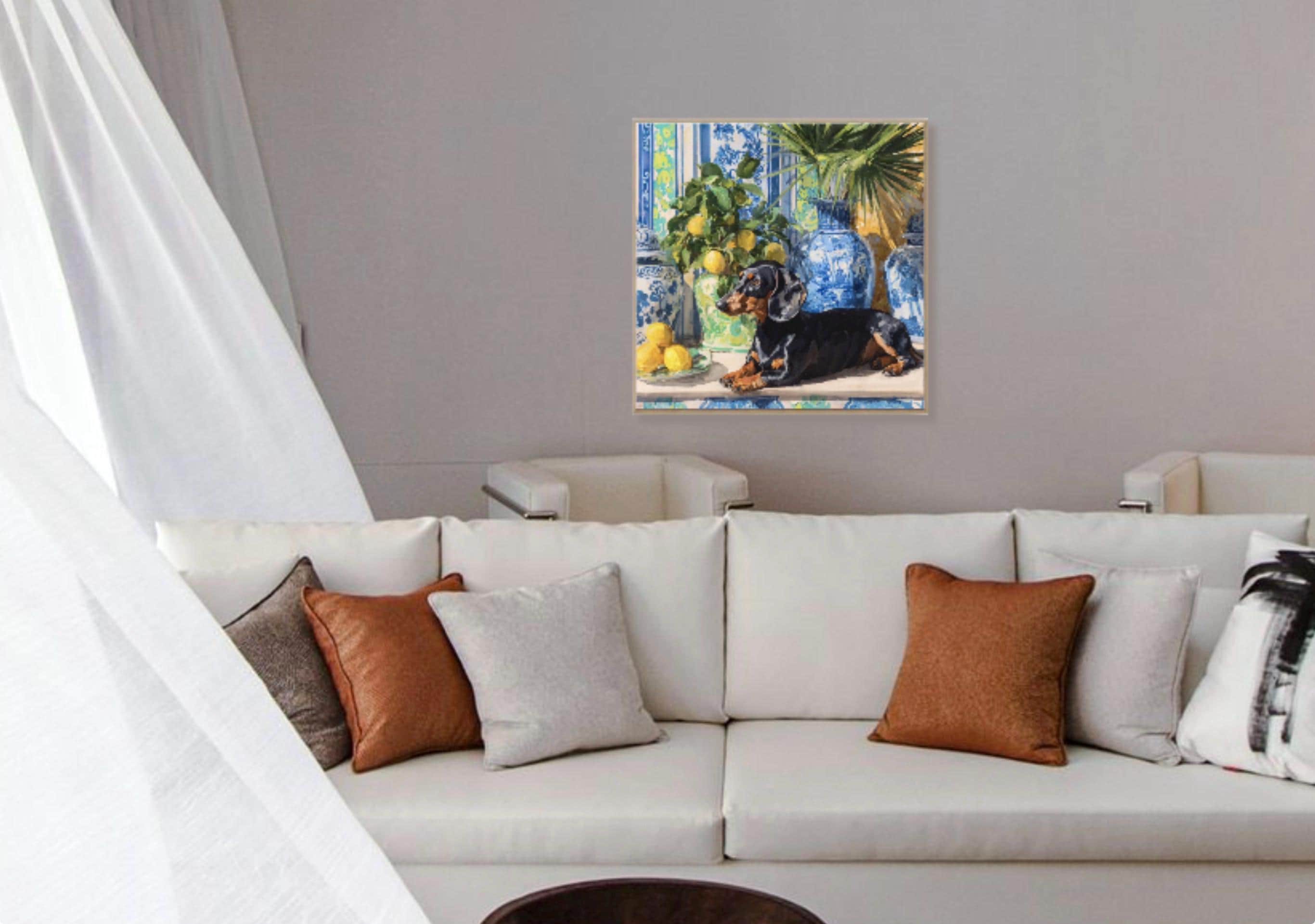 Grandmillennial art, Dachshund and lemons in chinoiserie room, preppy whimsical dog print