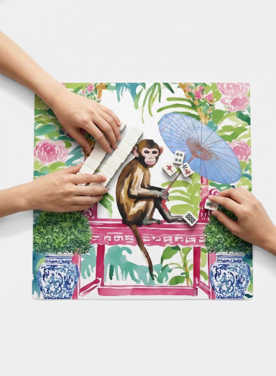Our bright and playful chinoiserie mat brings playful chinoiserie style to your game table. Makes a perfect gift for mahjong hostesses. Comes in four sizes to fit your needs. Soft, durable neoprene surface with non-slip backing. Preppy Palm Beach color paletteEco-friendly printing process. Quick shipping to all US states. Can be monogrammed. Put the letters in the personalisation box.