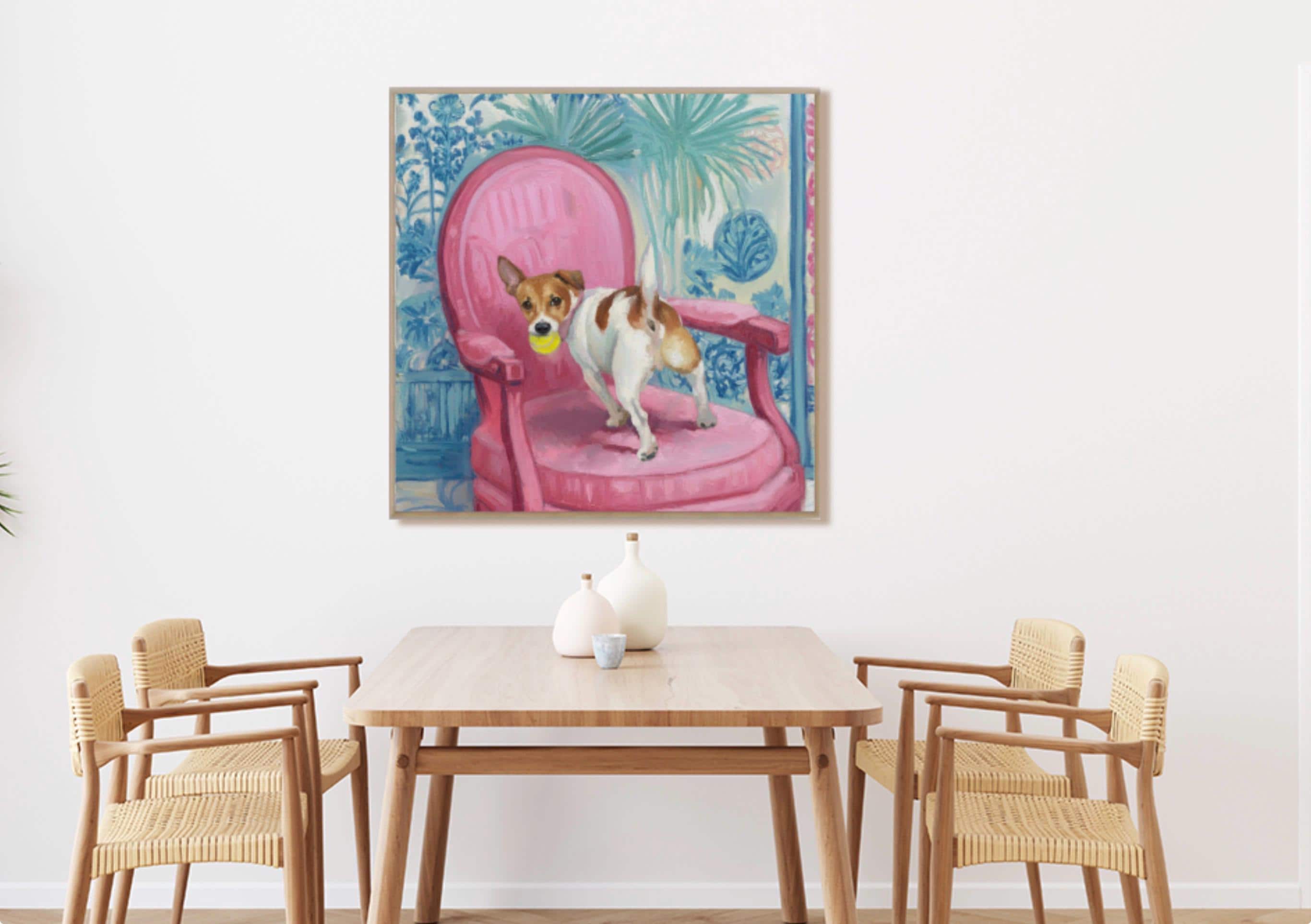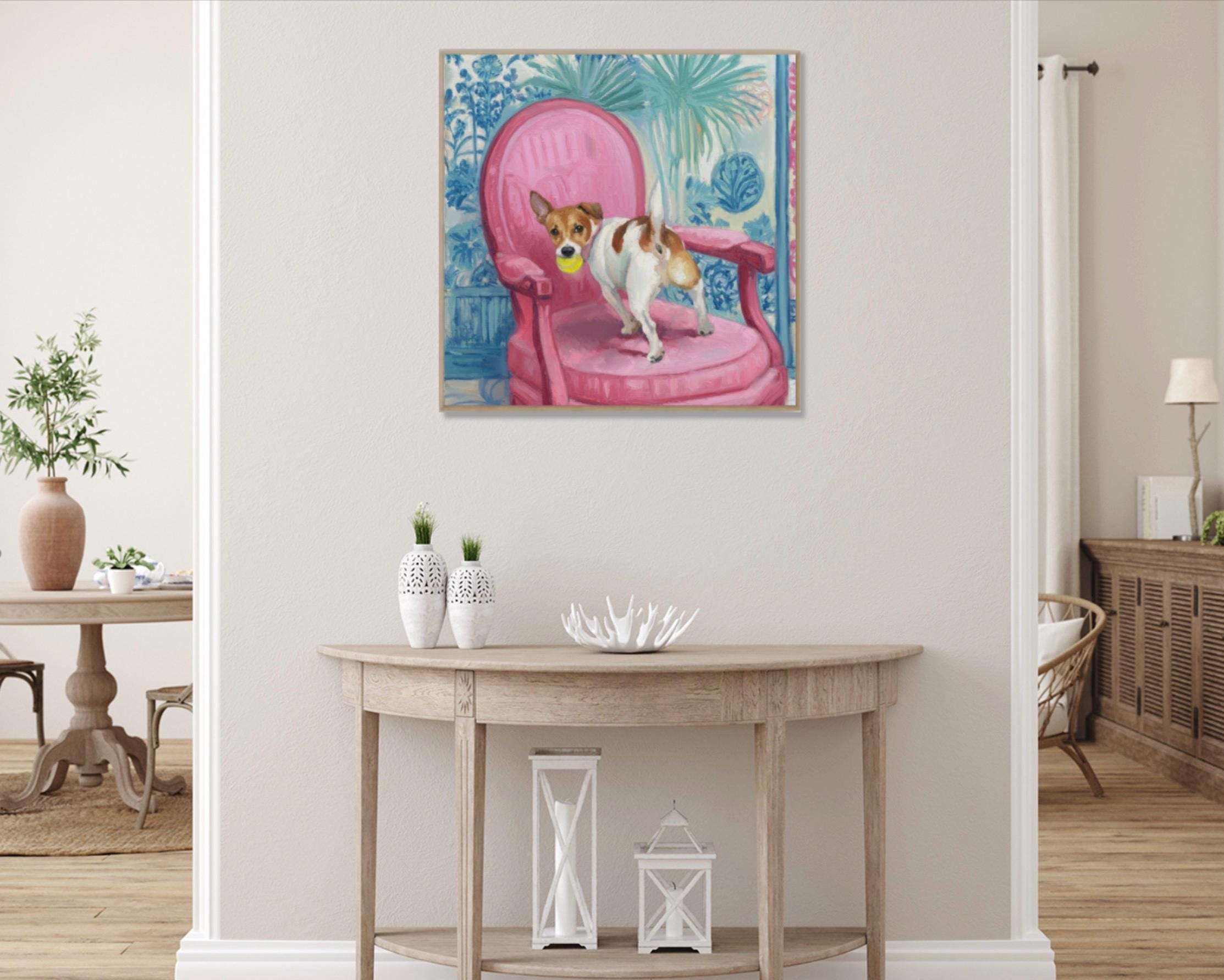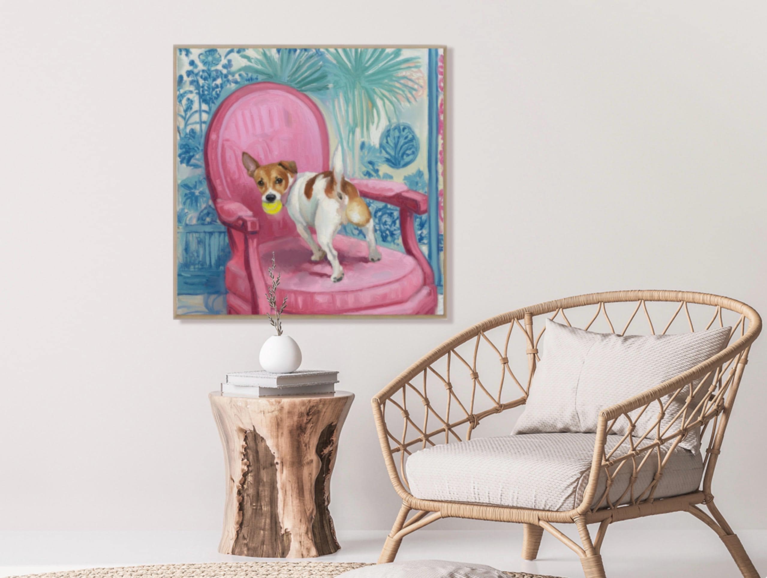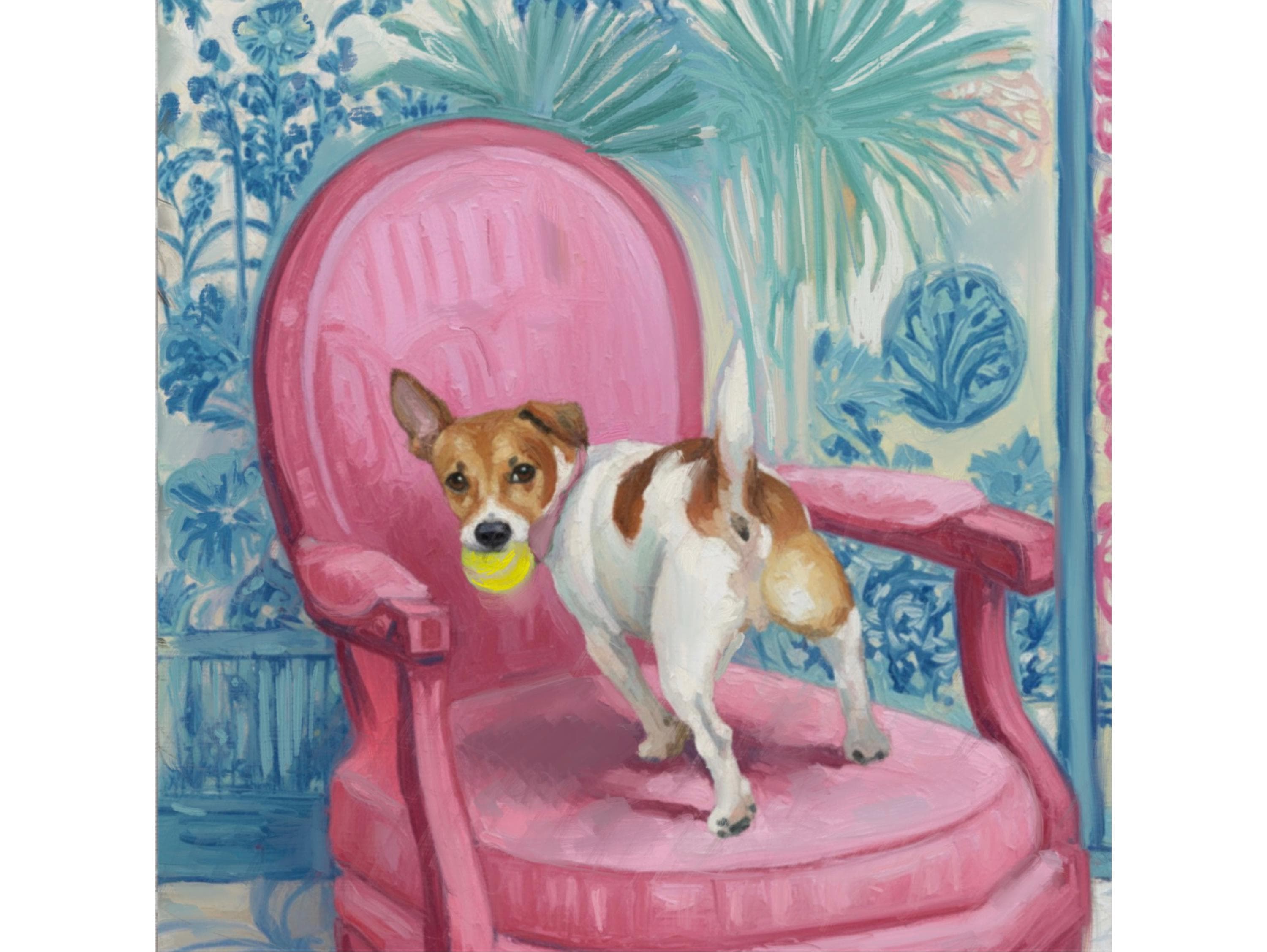 Grandmillennial art, Got It!, Jack Russell on pink chair , whimsical chinoiserie dog art
