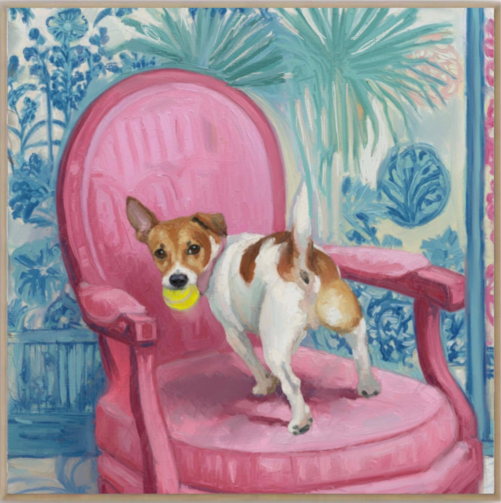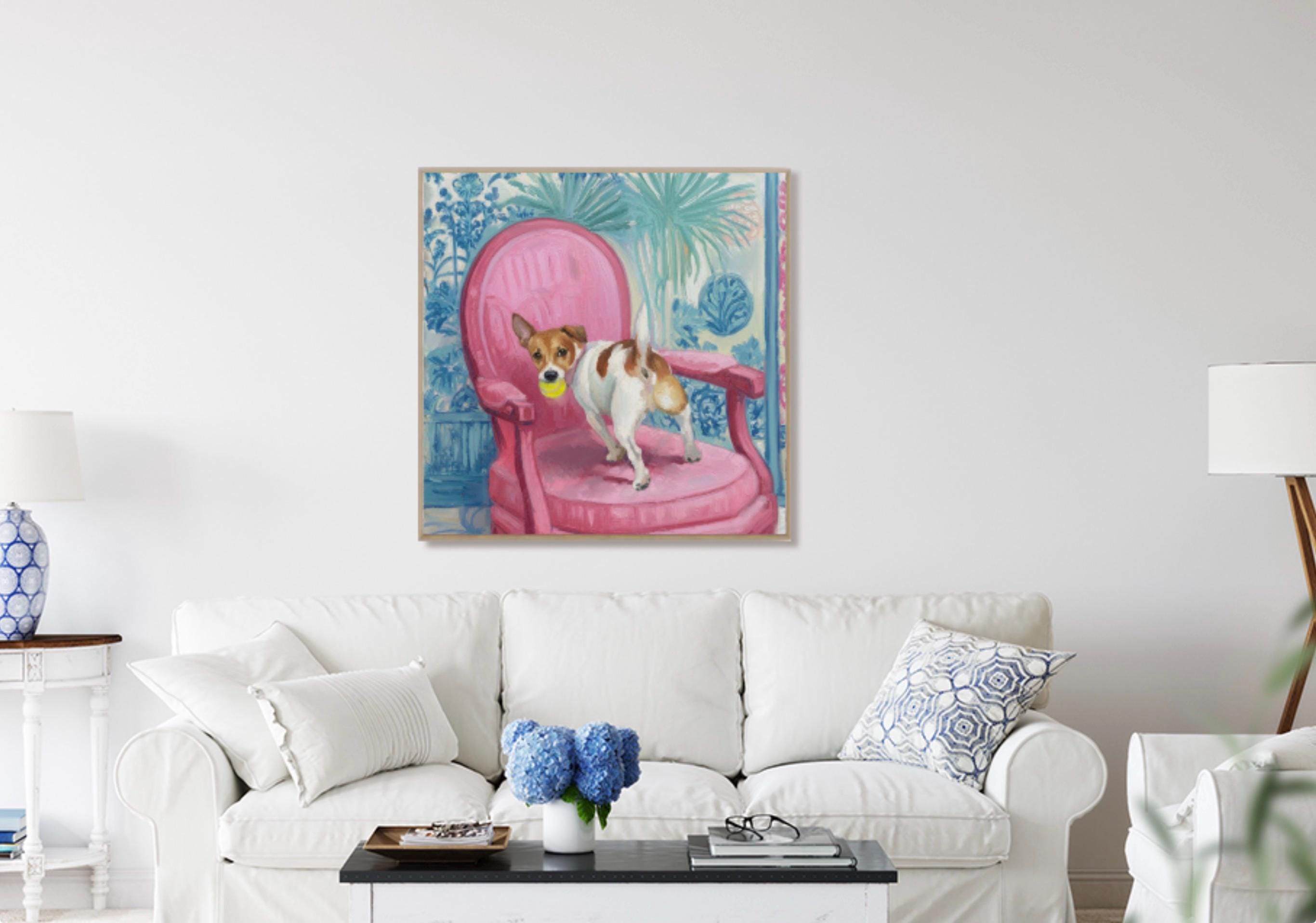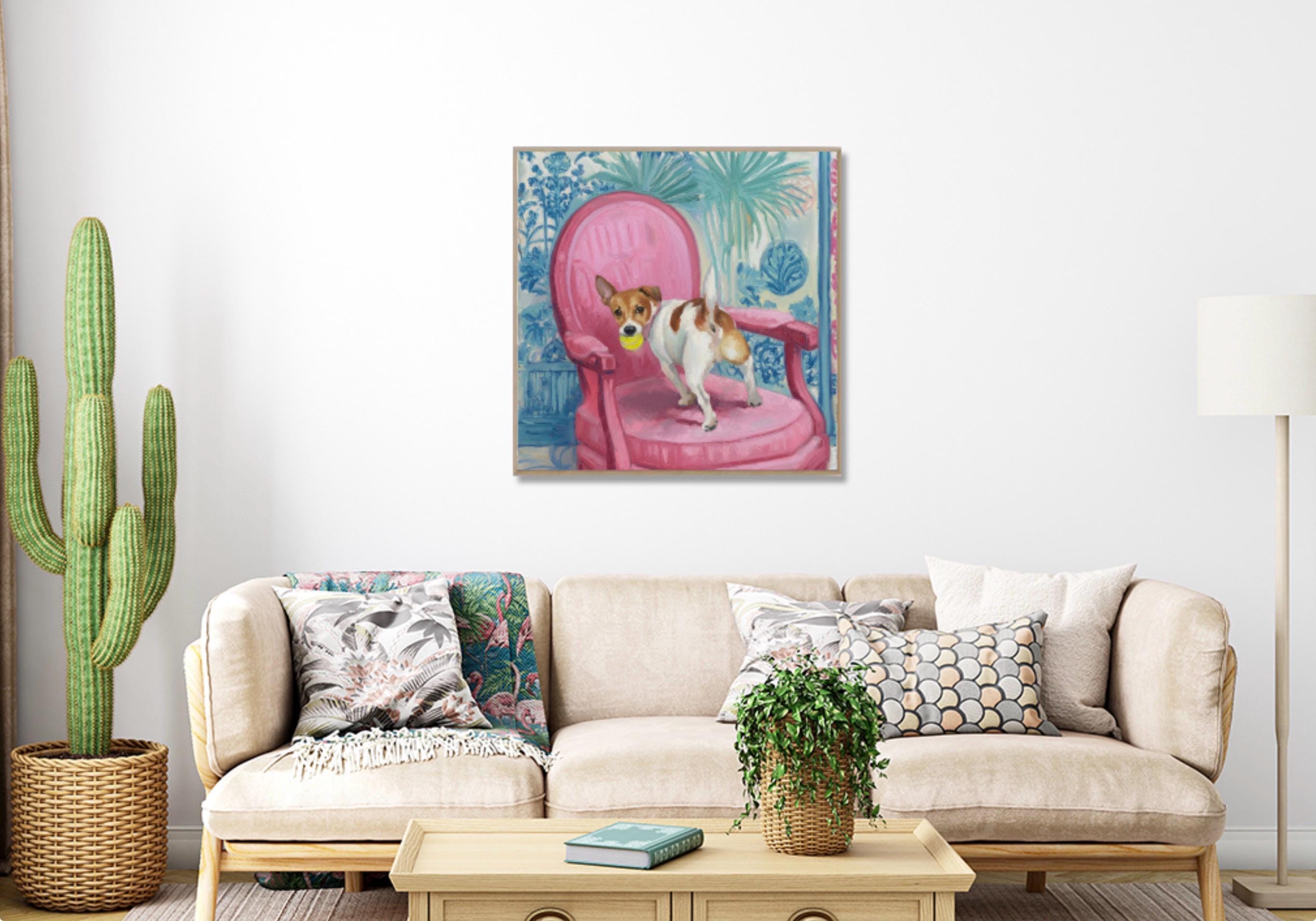 Grandmillennial art, Got It!, Jack Russell on pink chair , whimsical chinoiserie dog art