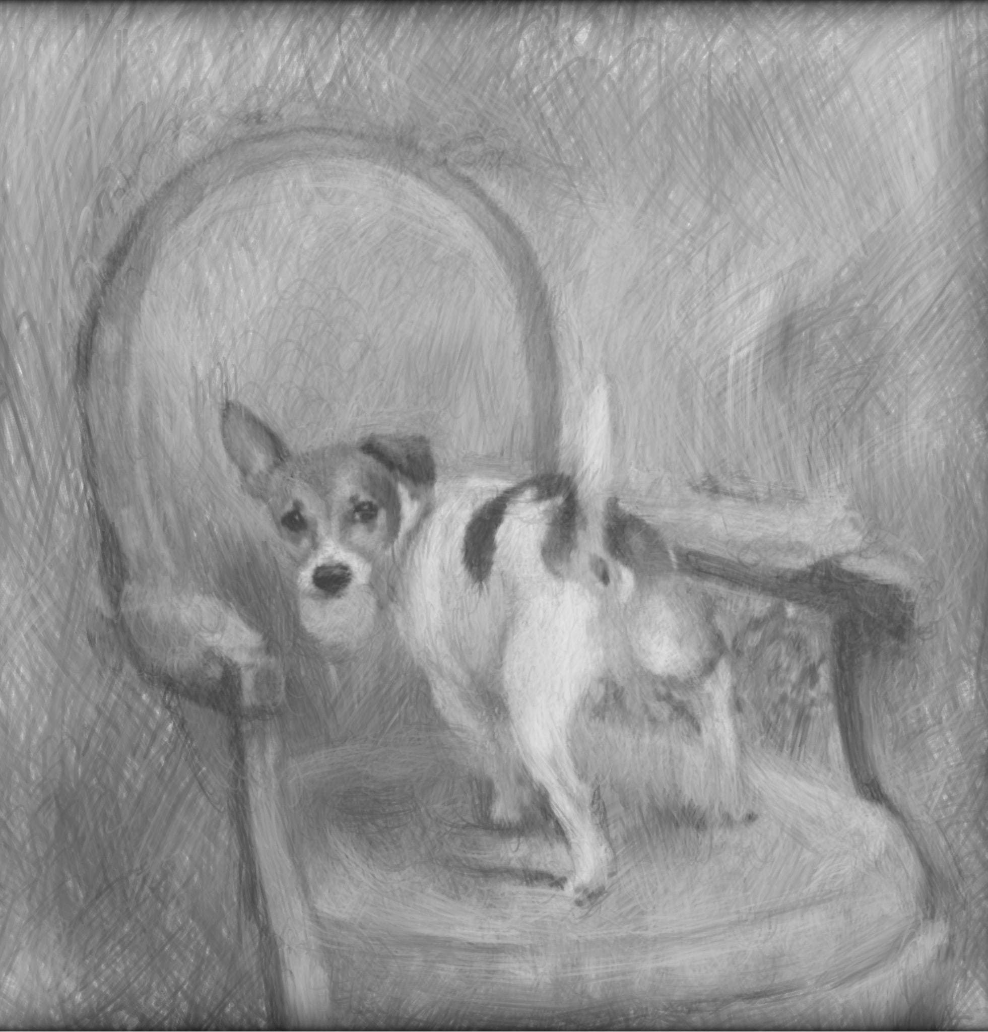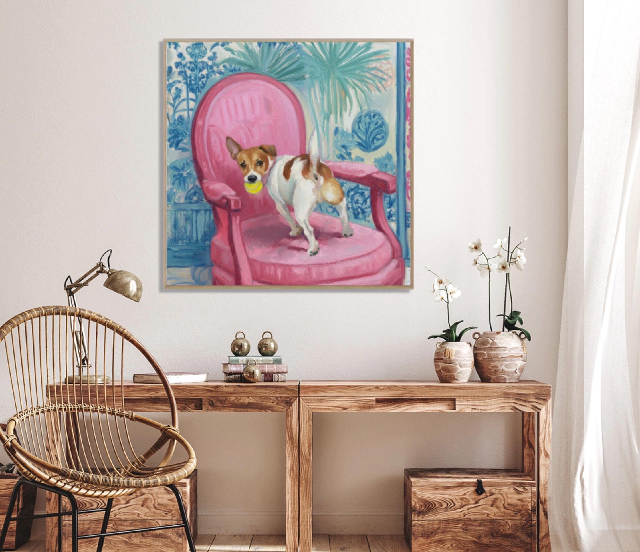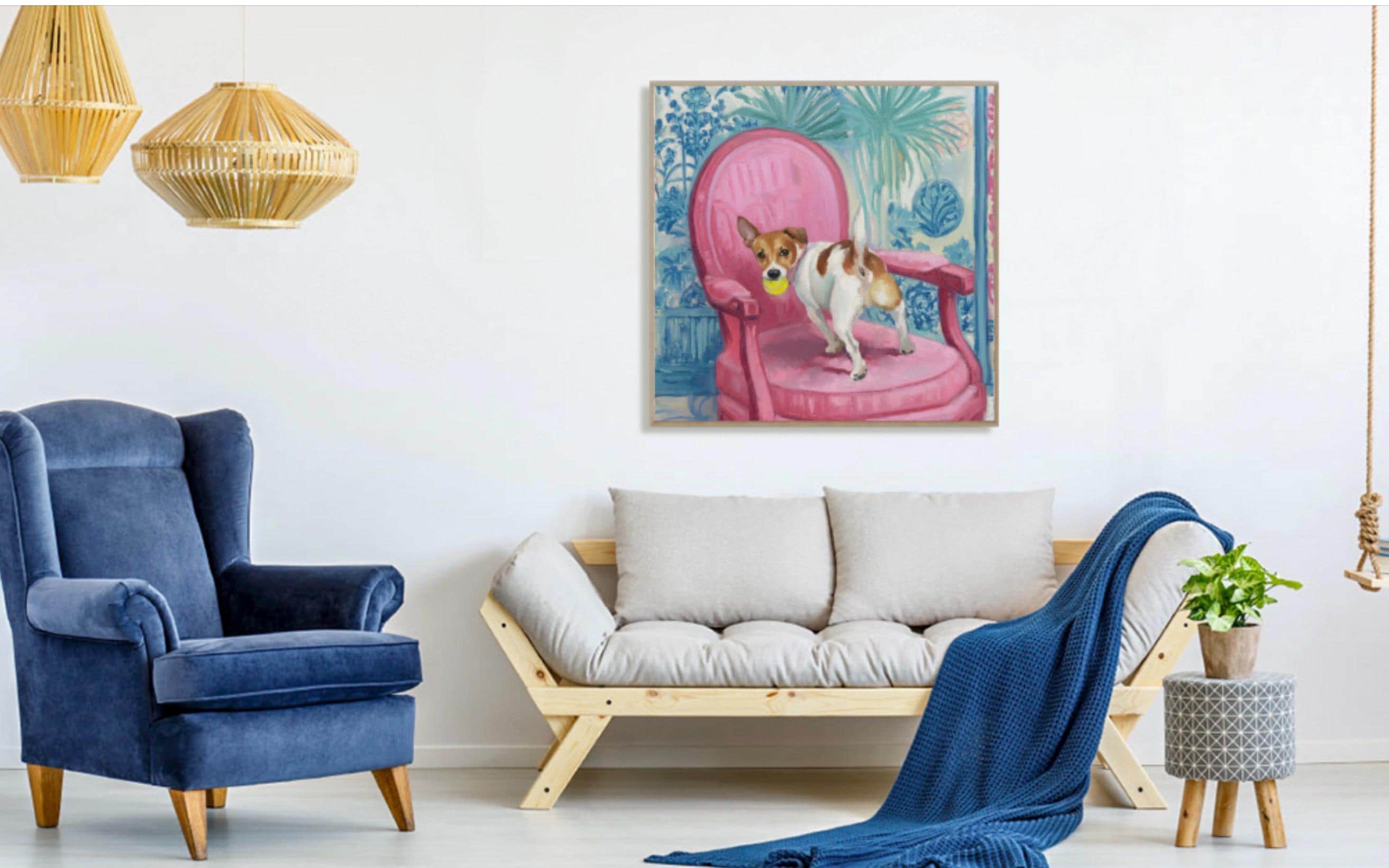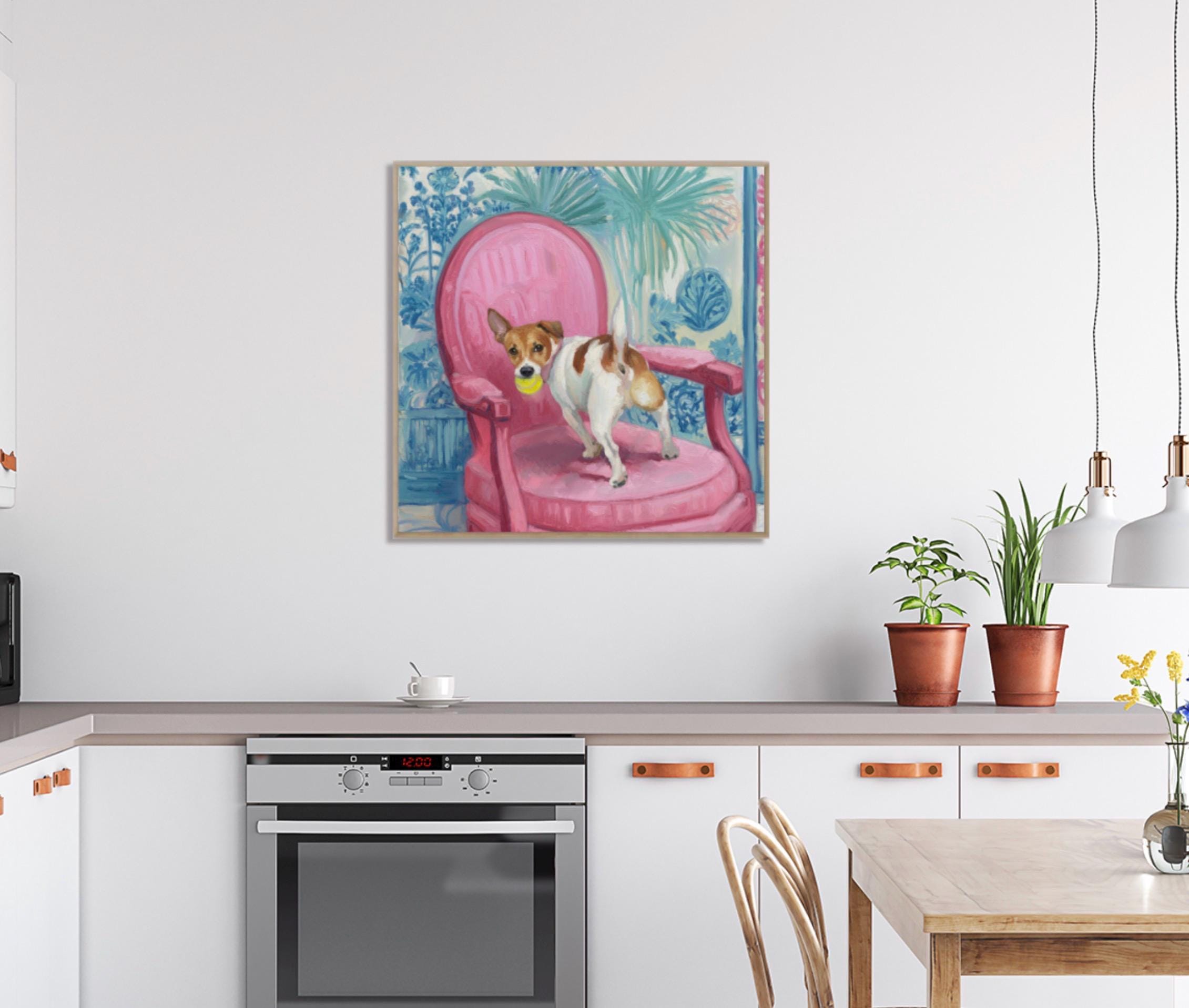Grandmillennial art, Got It!, Jack Russell on pink chair , whimsical chinoiserie dog art