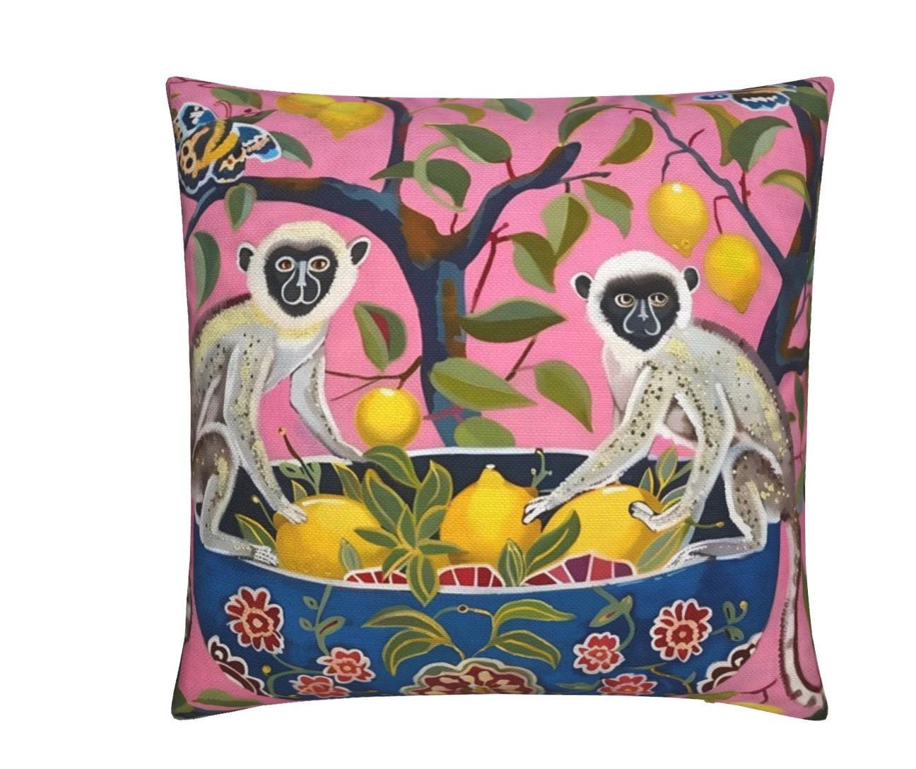 Two monkeys playing with lemons in chinoiserie garden, natural cotton canvas, 16x16”