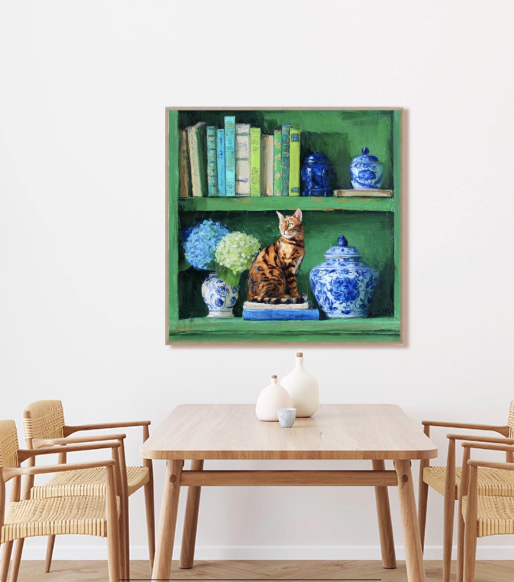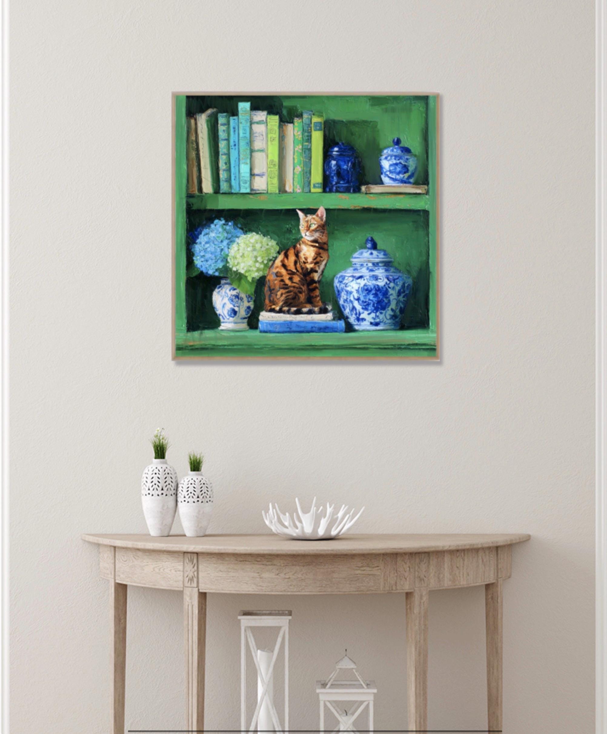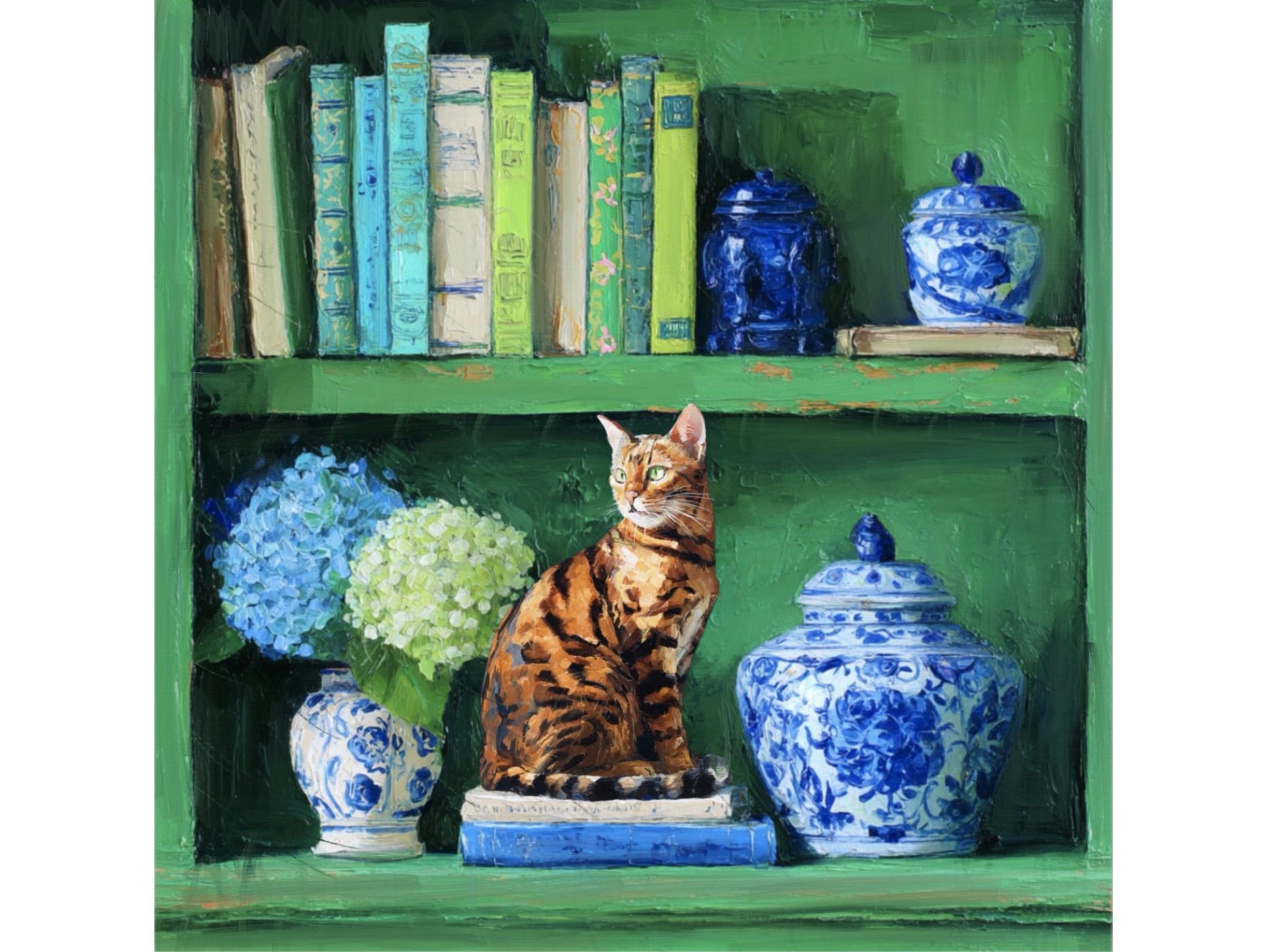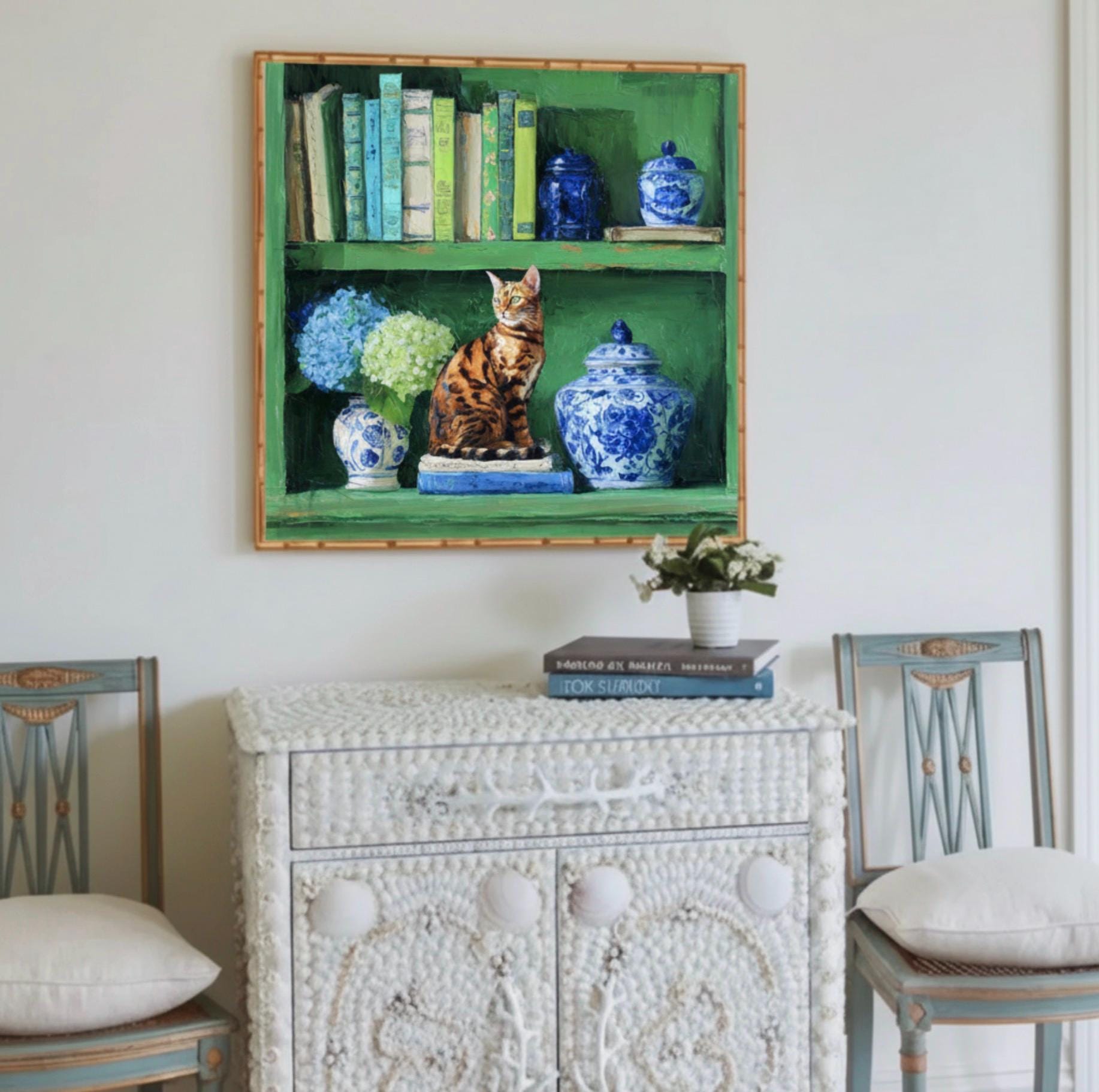 Bengal Cat Chinoiserie Art Print, Blue Green Ginger Jar, Grandmillennial Decor