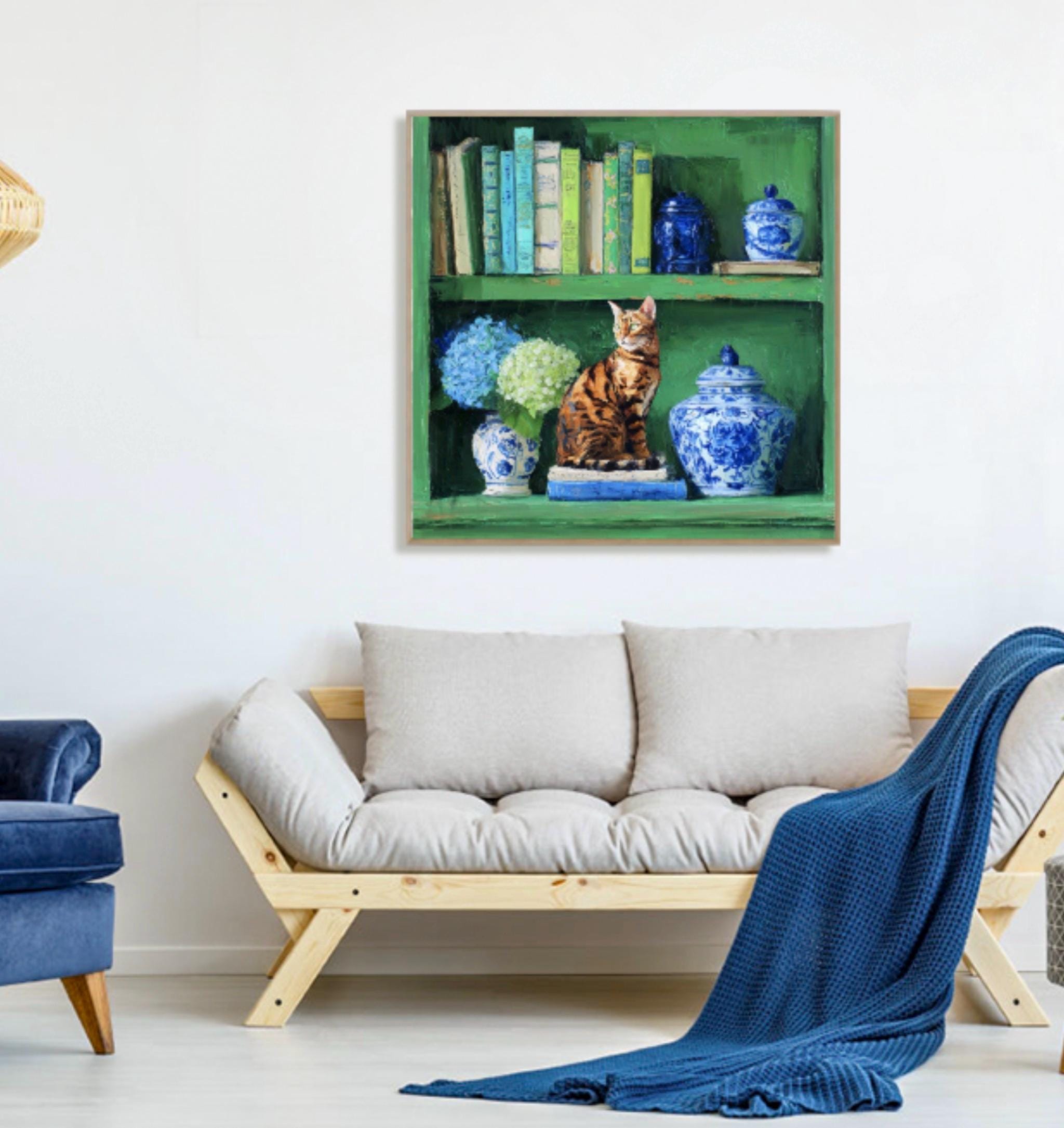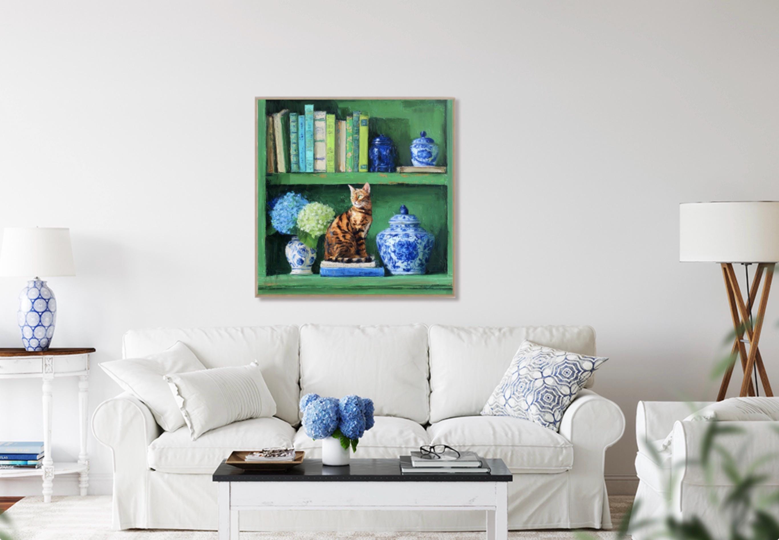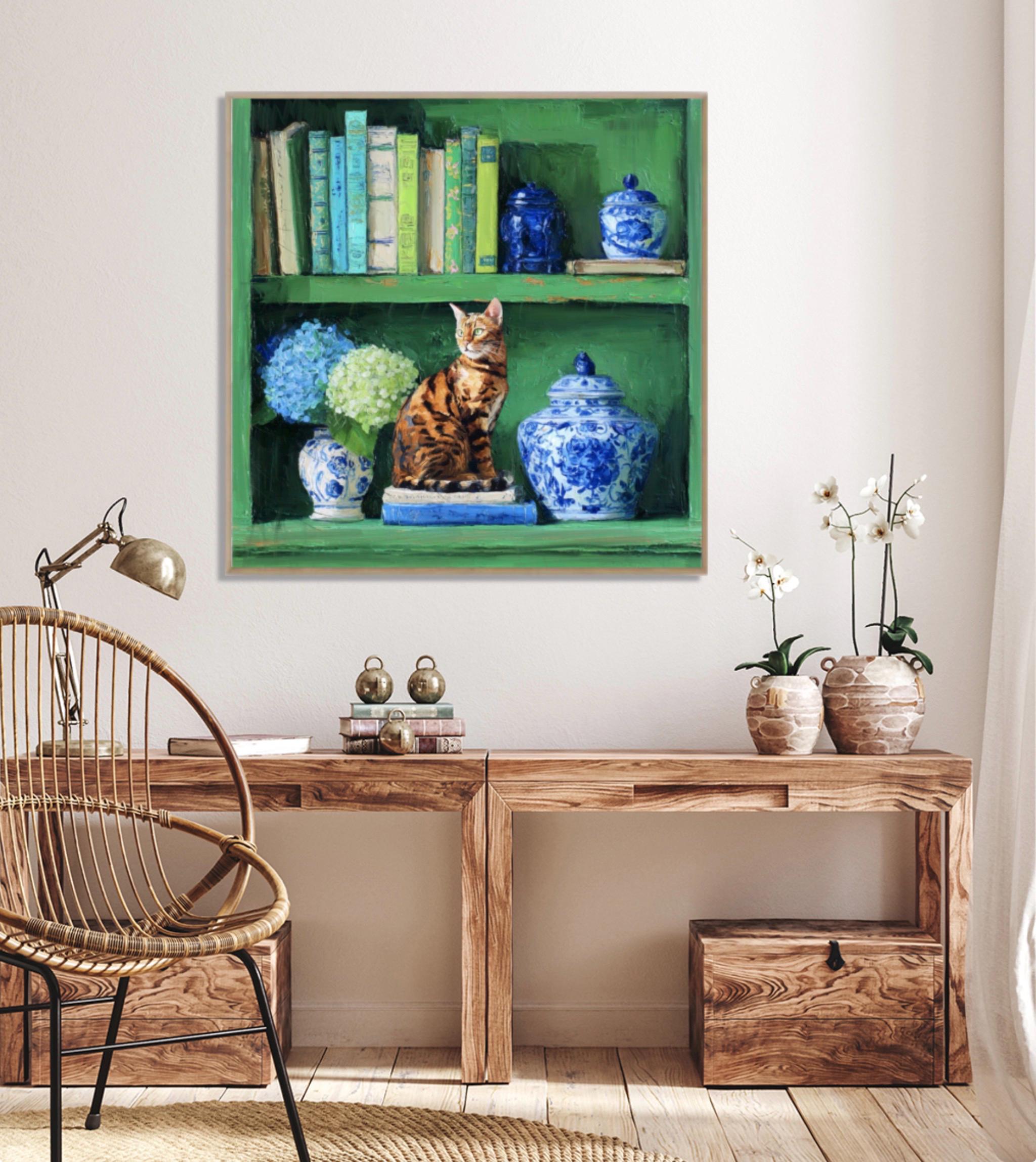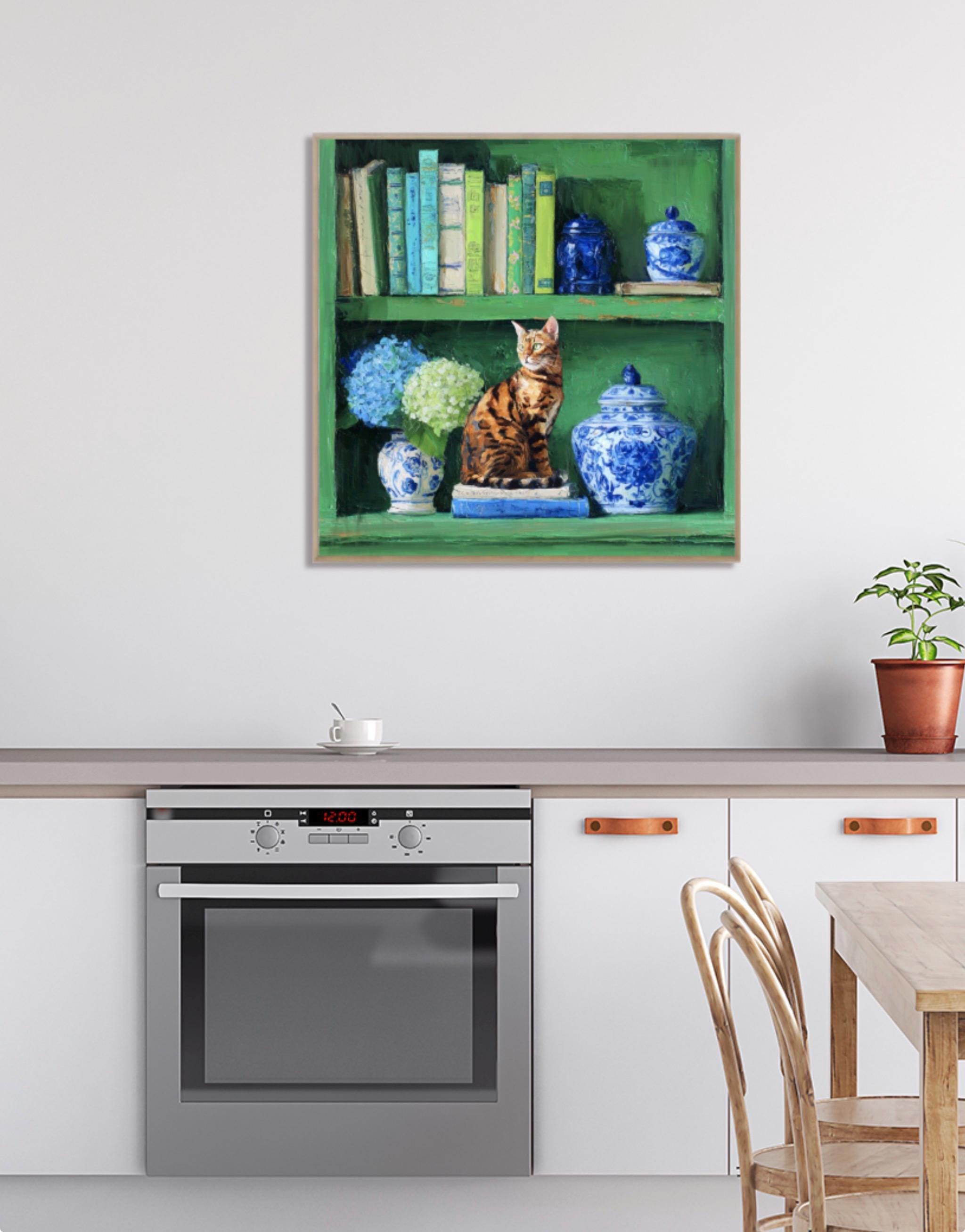 Bengal Cat Chinoiserie Art Print, Blue Green Ginger Jar, Grandmillennial Decor